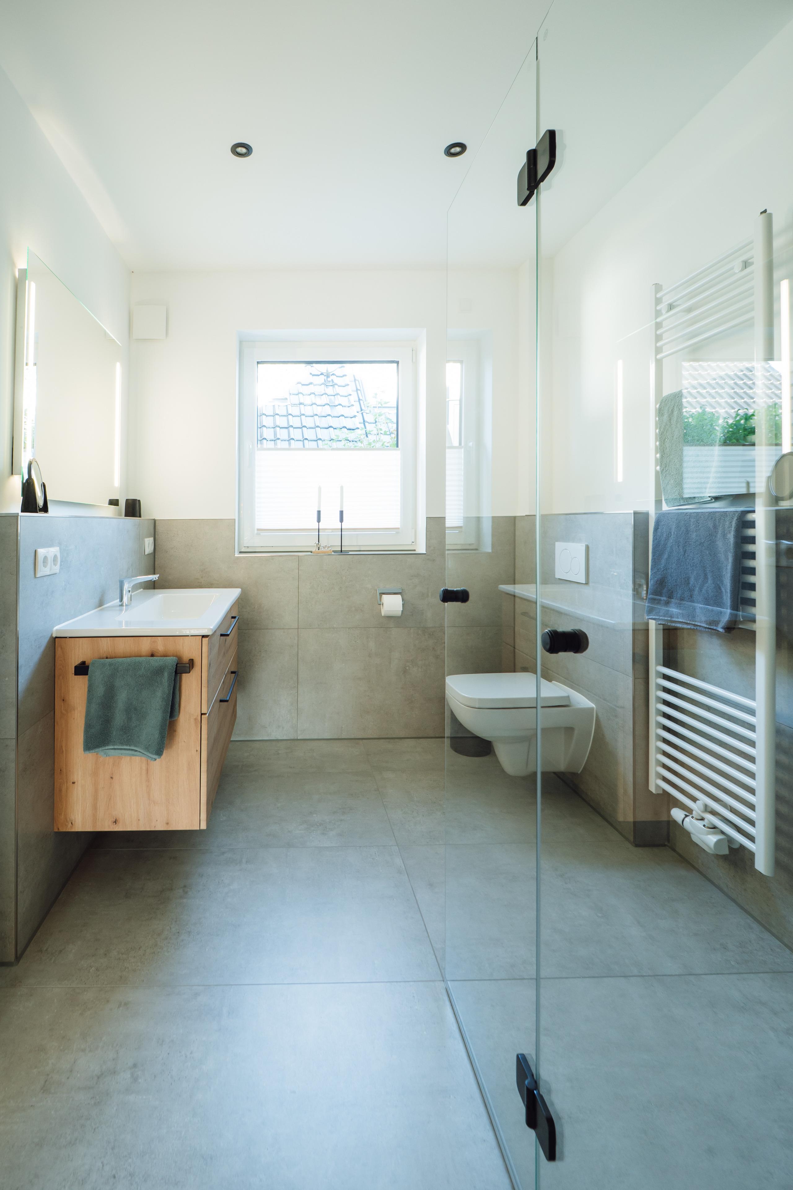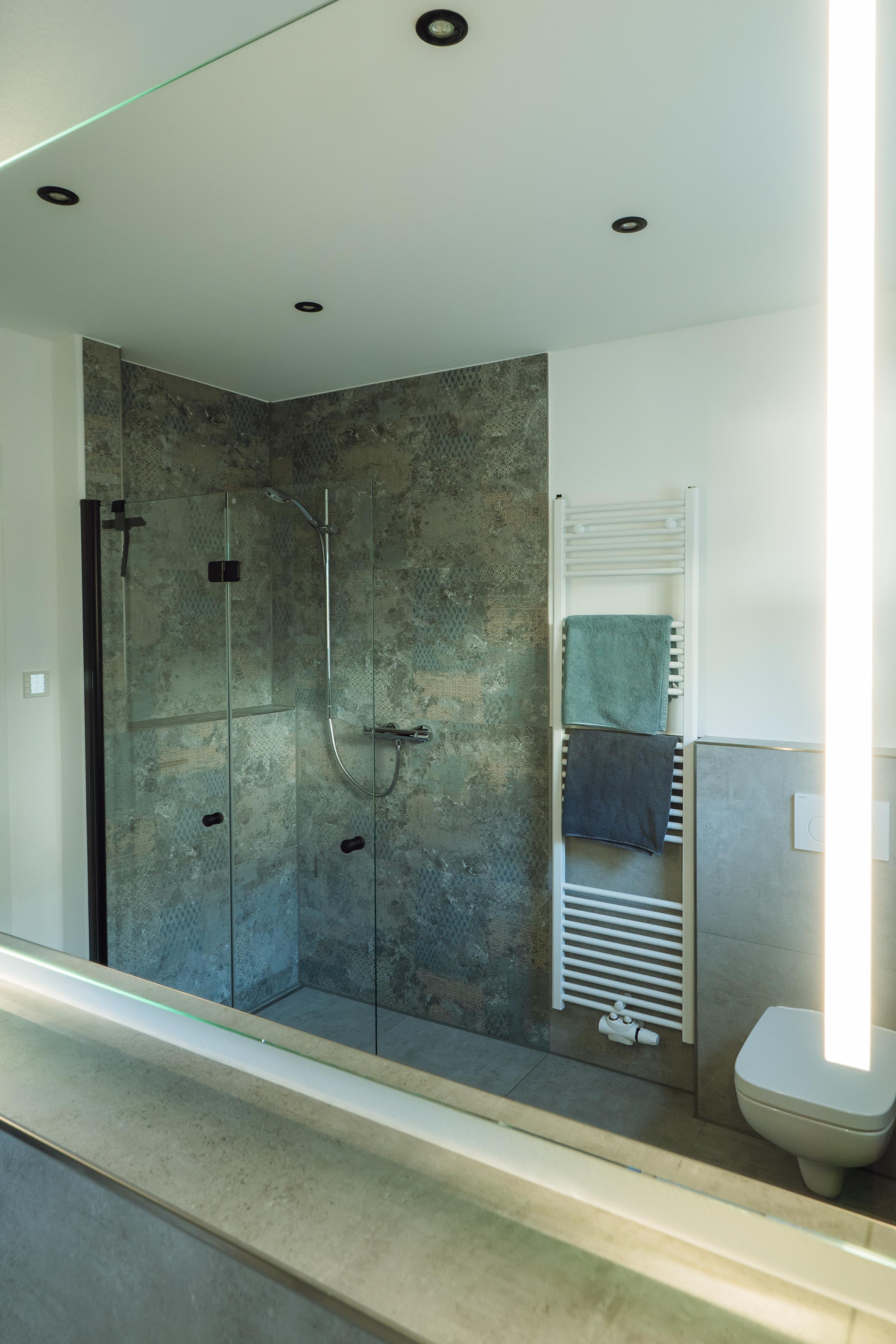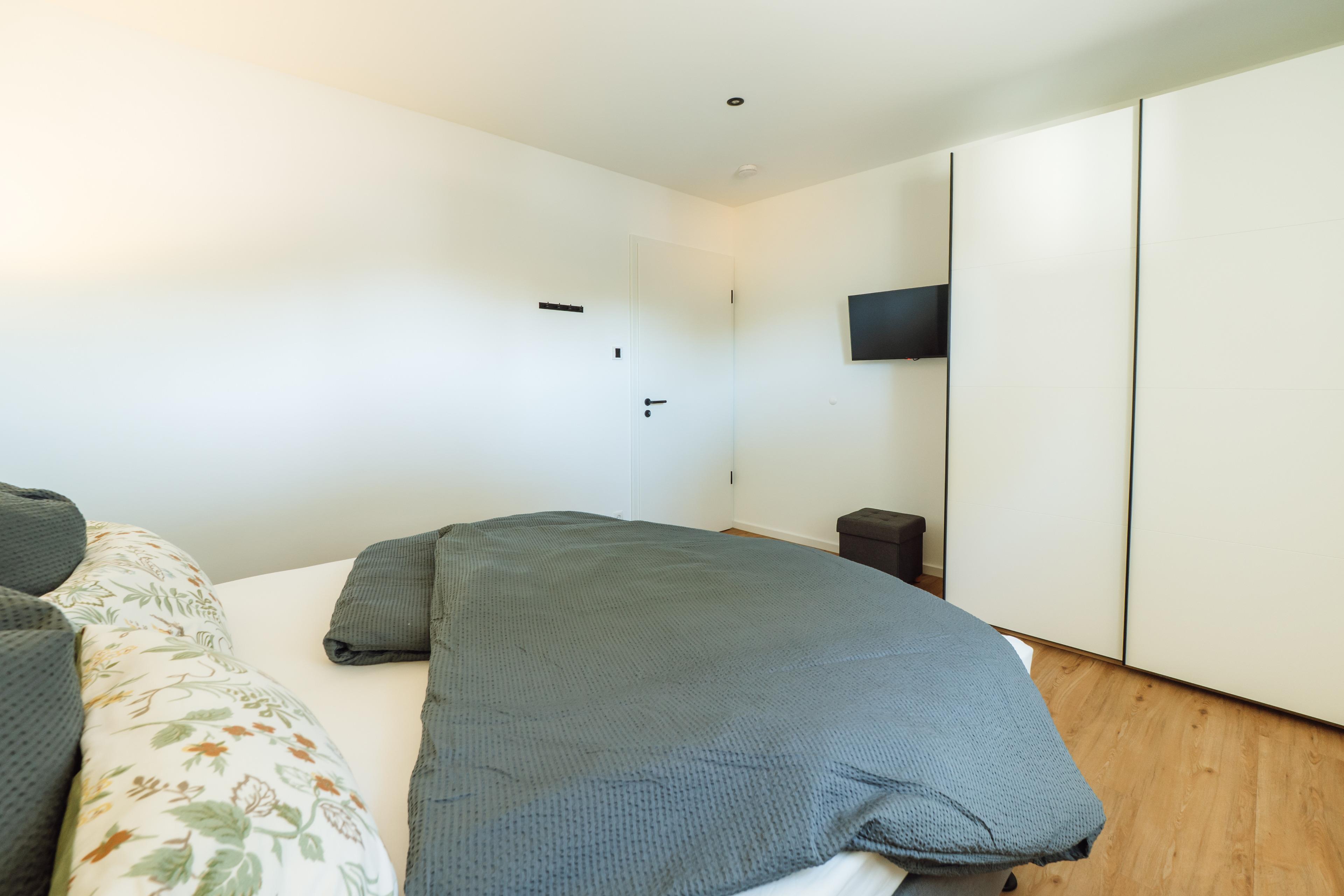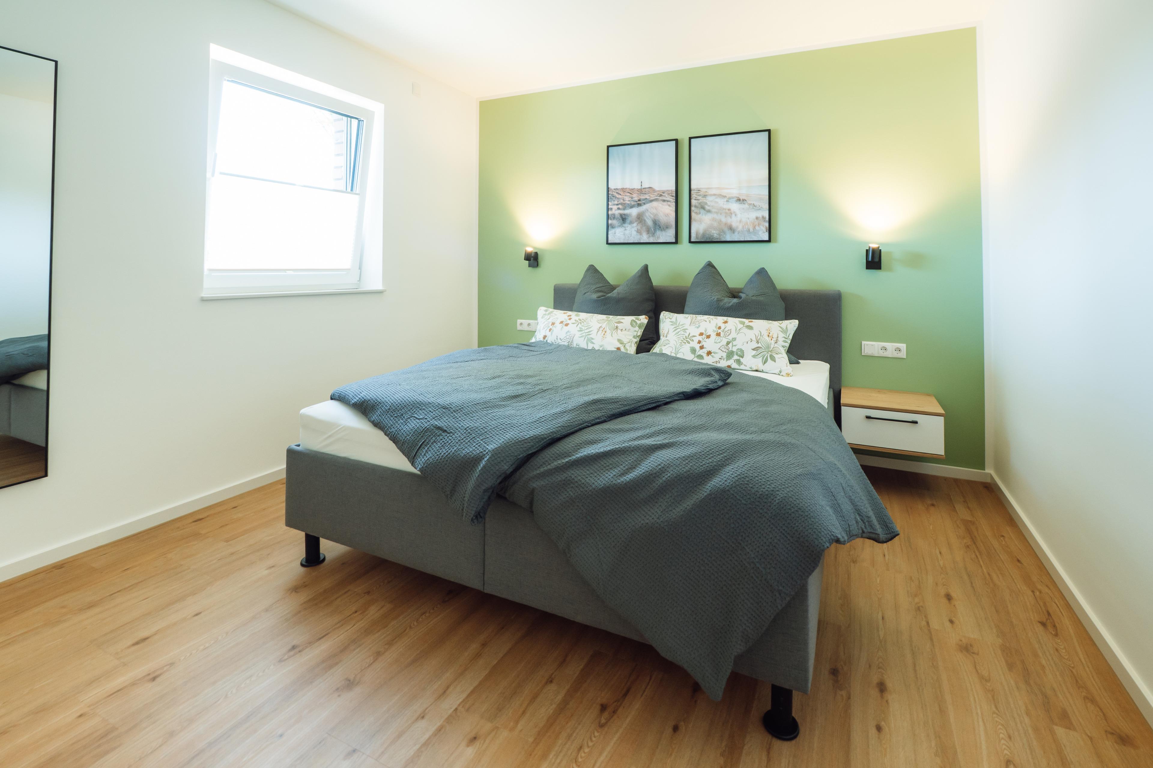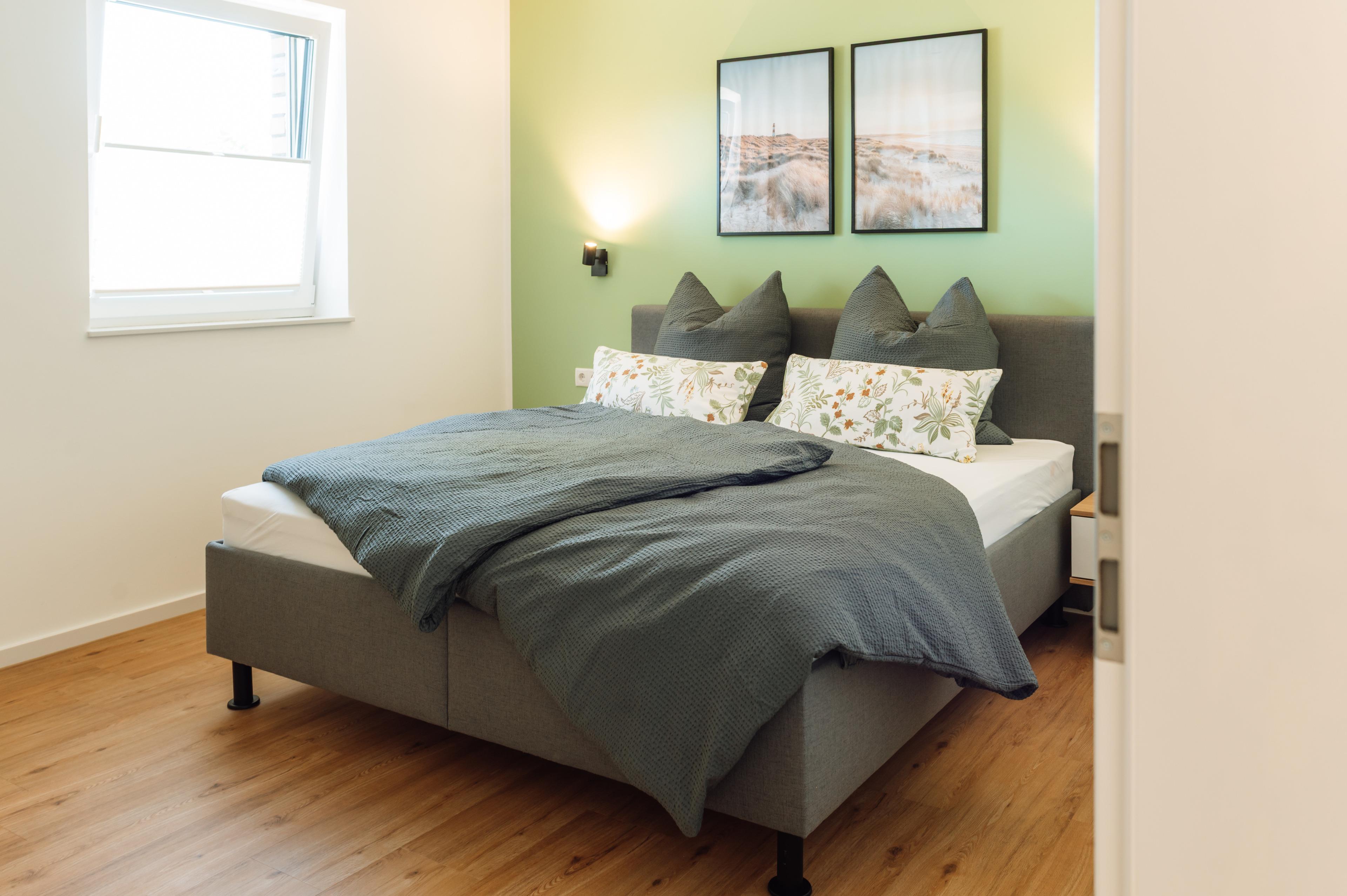 Das geräumige Schlafzimmer bietet mit seinem klaren Design Ruhe und Geborgenheit. Im Badezimmer triffst du auf modernes Wohlfühl-Ambiente mit bodengleicher Dusche und feinen Details.
