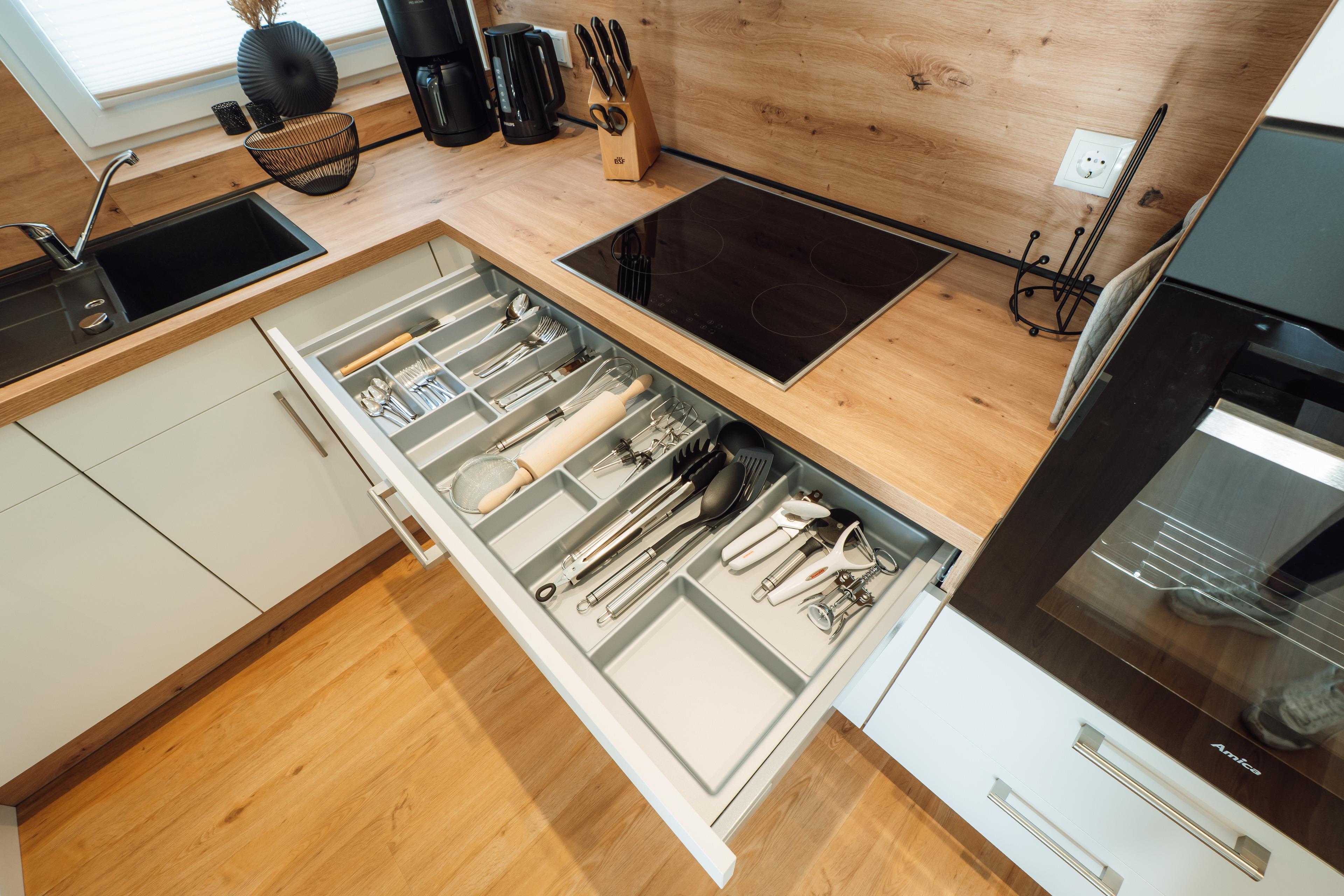 Die Küche ist hochwertig ausgestattet – ideal für kulinarische Abenteuer oder ein Glas Wein am Abend.