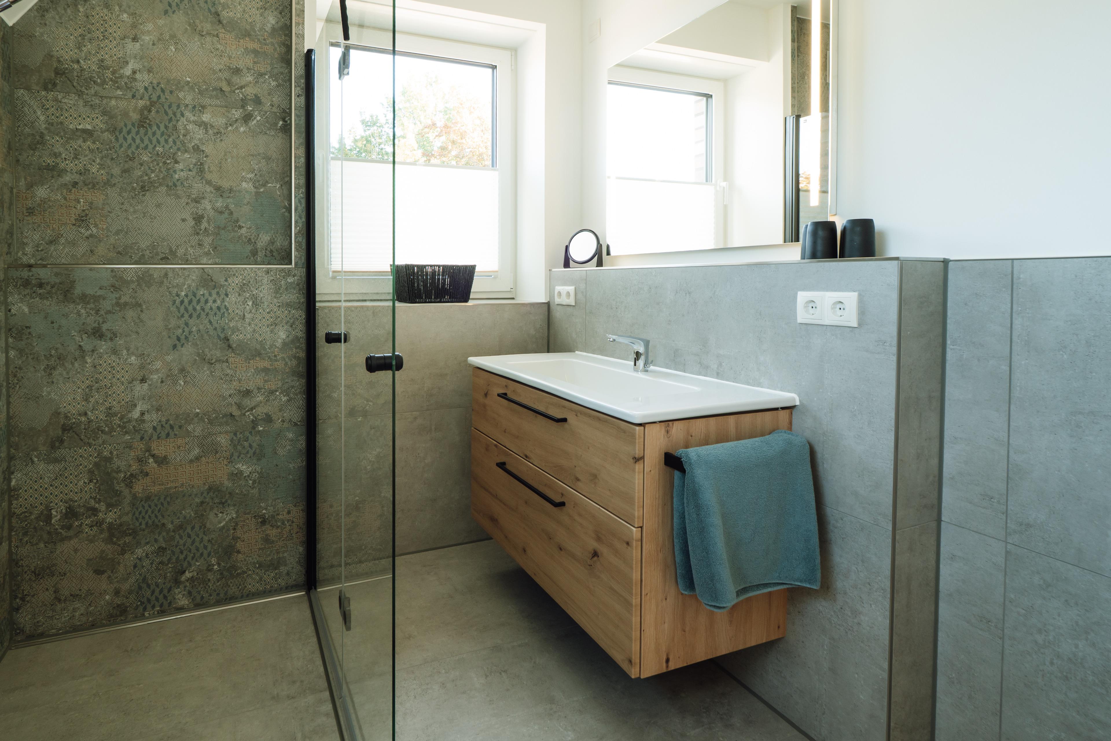 Im Wohnbereich lädt das harmonische Zusammenspiel aus warmen Farben, edlen Materialien und klarer Architektur zum Verweilen ein. Große Fenster fluten die Räume mit Licht, während die Fußbodenheizung eine behagliche Atmosphäre schafft.