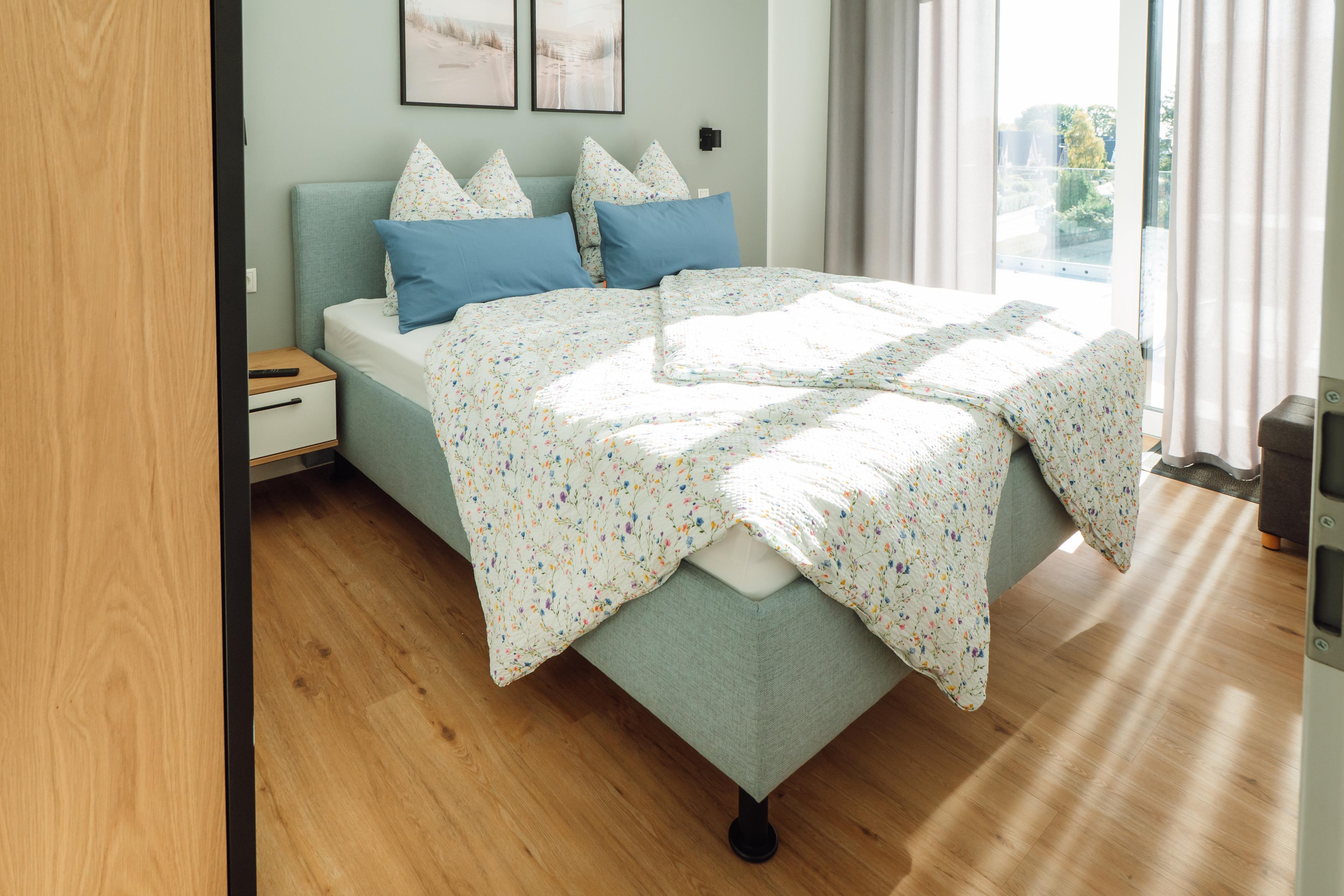 Zwei Schlafzimmer – eines davon mit eigenem Ankleidebereich – bieten Rückzugsorte zum Träumen. Im Badezimmer erwartet dich eine bodengleiche, besonders großzügige Dusche – ideal für einen erfrischenden Start in den Morgen oder zum entspannten "Regenduschen" nach einem Tag am Meer.