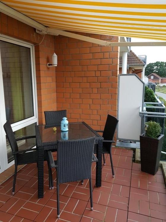 Ruhige Ferienwohnung mit großem Balkon und elektrischer Markise in Grömitz, ideal für entspannte Urlaubstage.