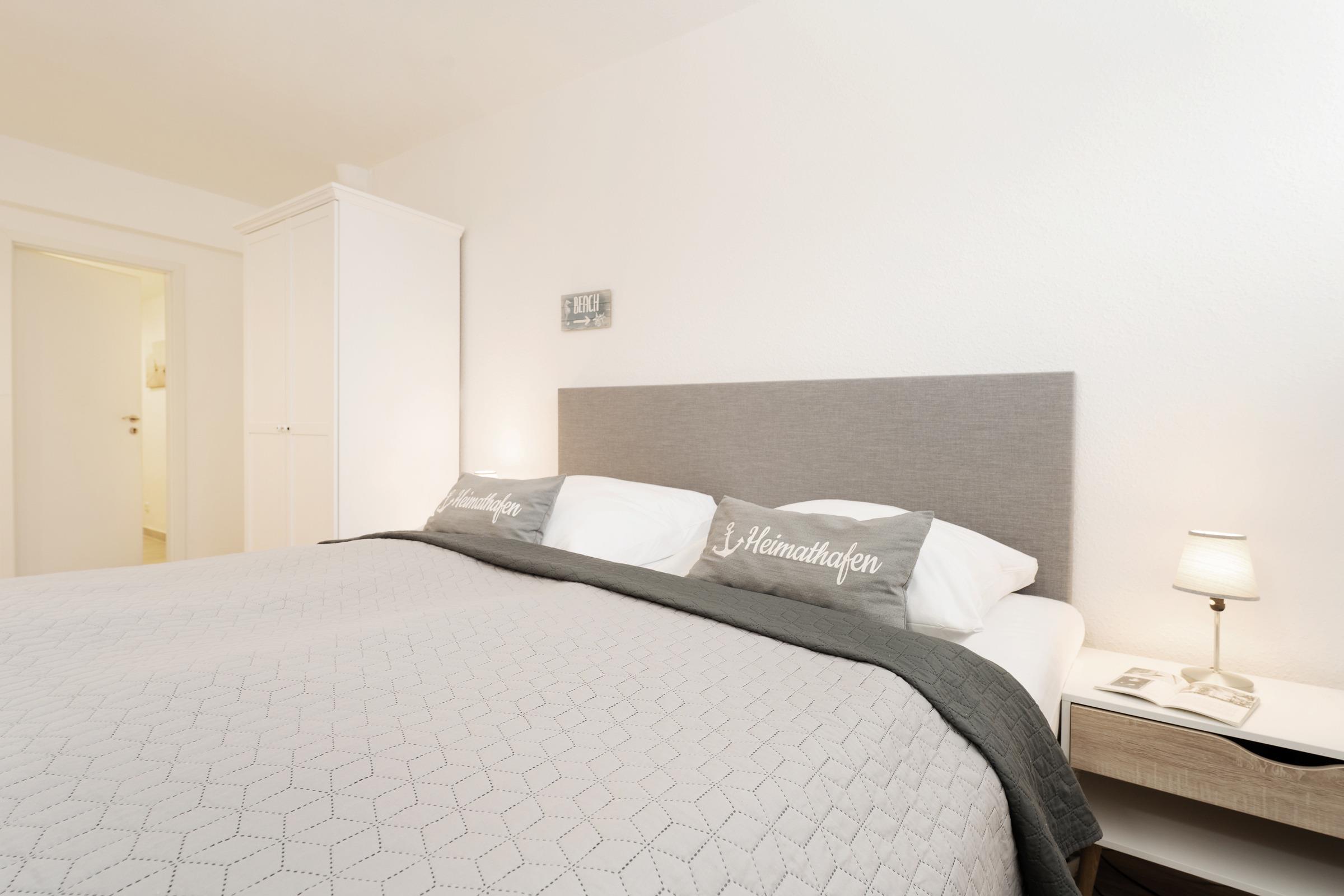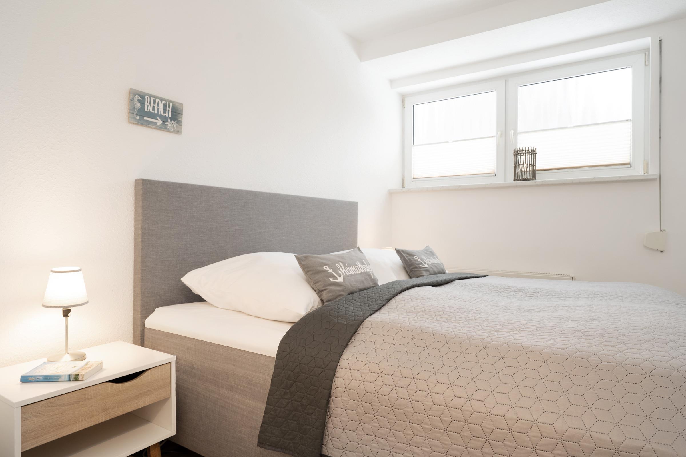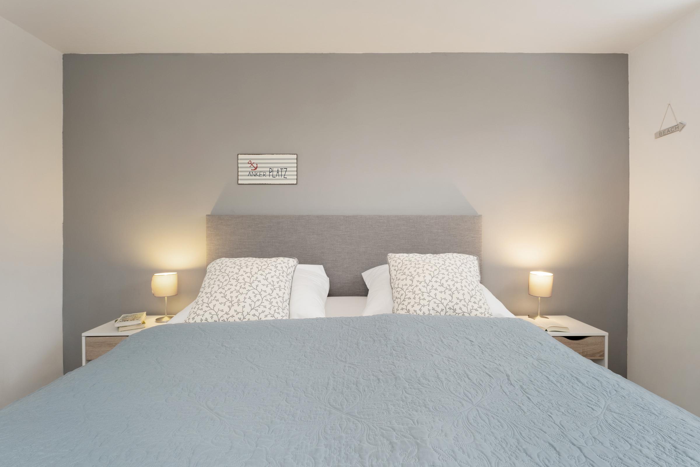 Schlafzimmer 1: 1 Boxspringdoppelbett (2x 90x200 cm mit durchgehendem Topper), Kleiderschrank, TV, Bad en suite, Verdunkelung: Rollladen, Platz für ein Babybett vorhanden