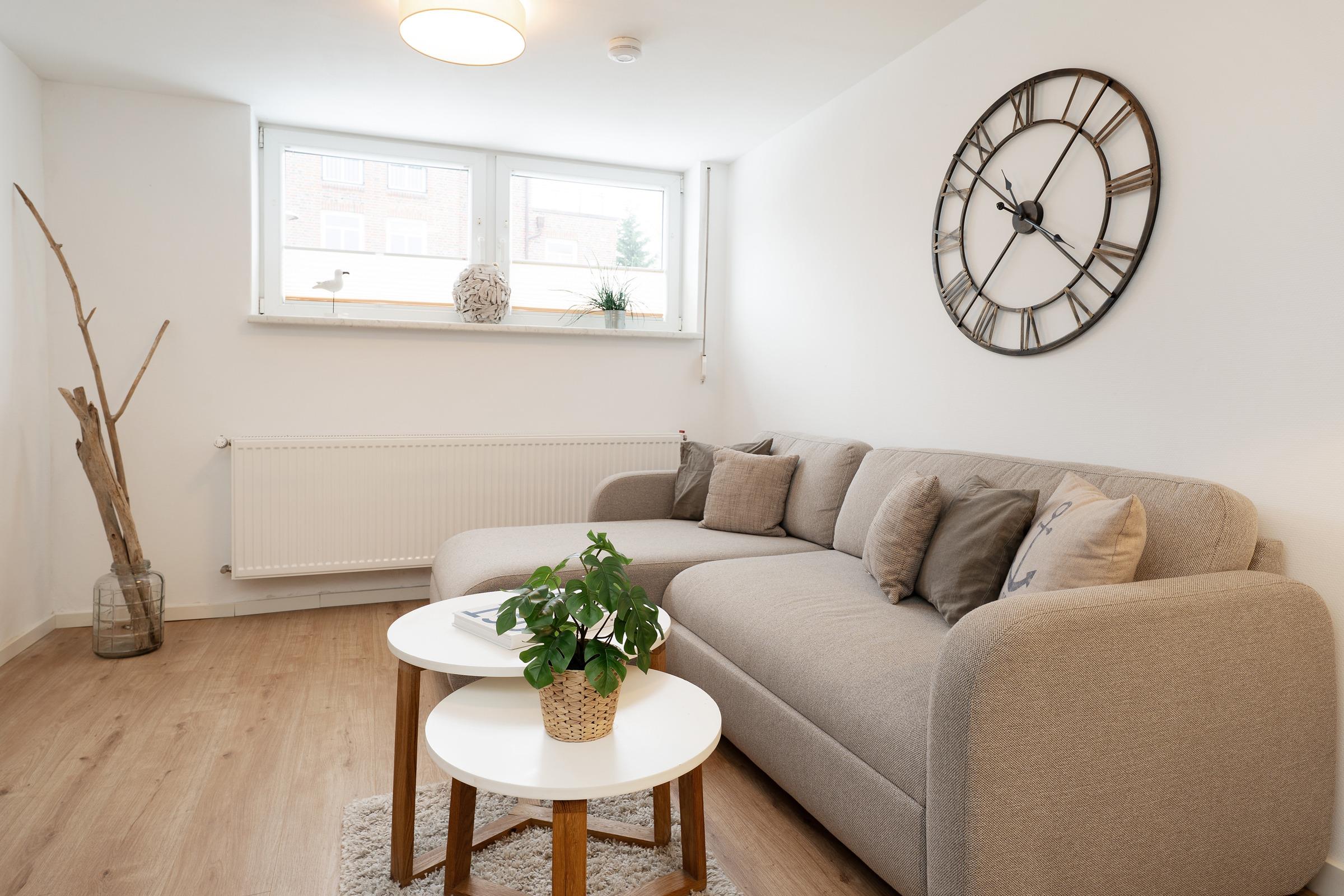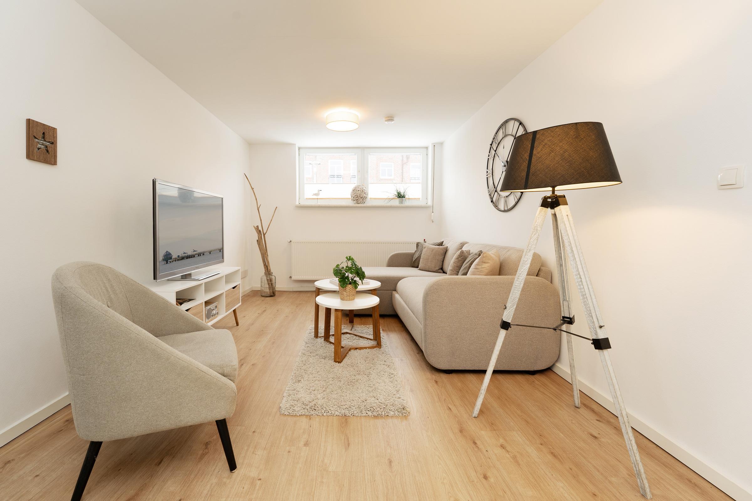Die modern ausgestattete Wohnung heißt Sie mit einem einladenden Wohnbereich willkommen, der mit Fernseher und Radio zu gemütlichen Stunden einlädt. Von hier aus gelangen Sie auf die möblierte Süd-West Terrasse, auf der Sie die frische Ostseeluft und sonnige Stunden genießen können.