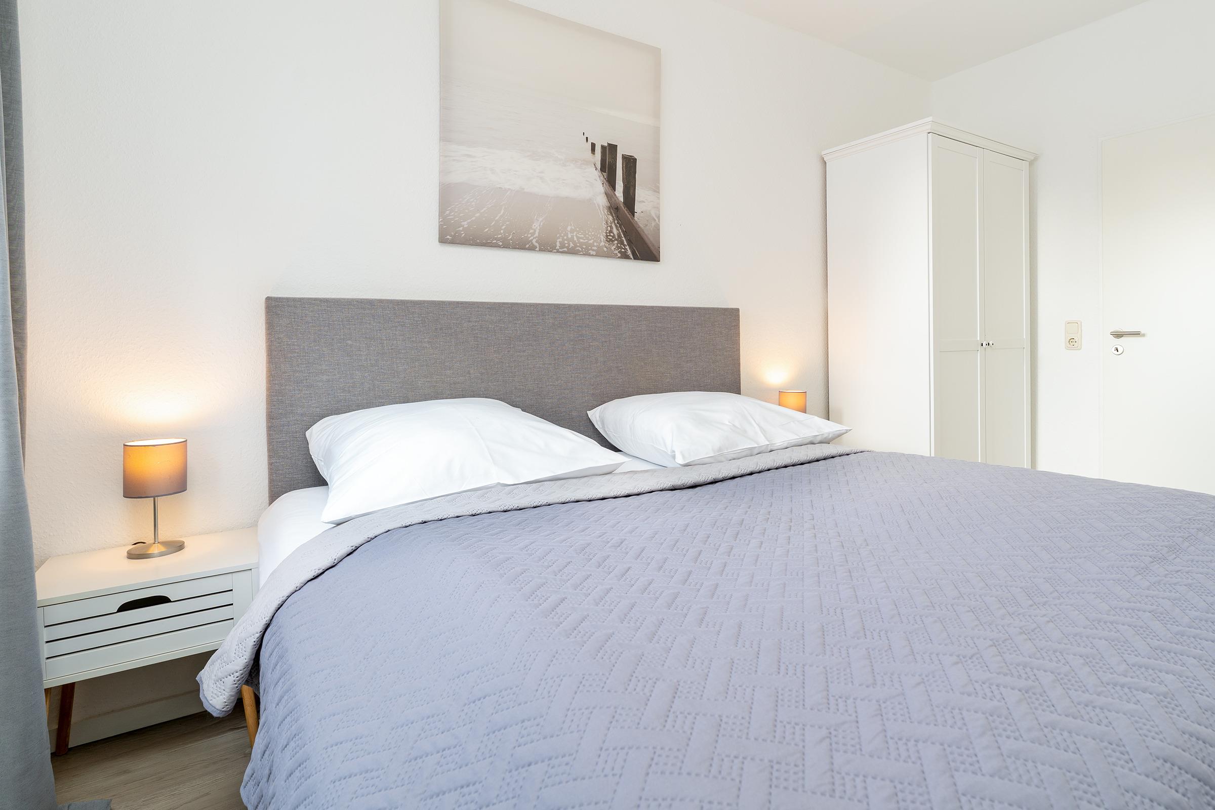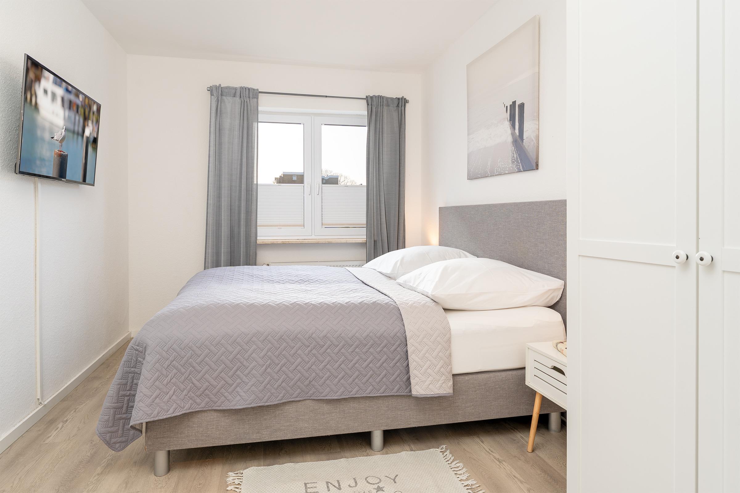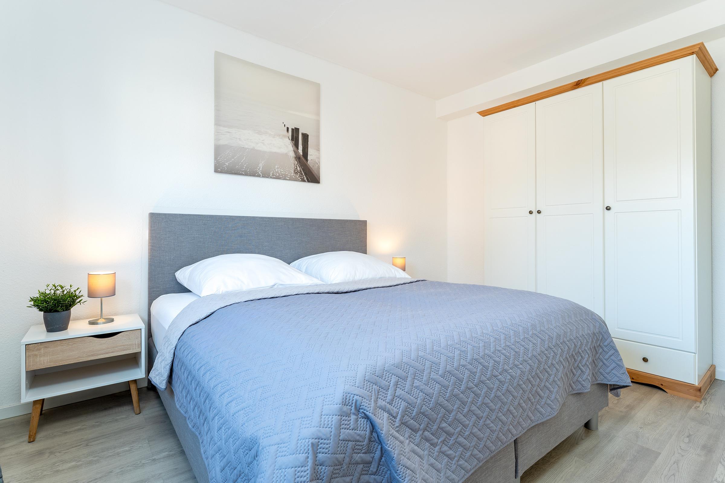 Schlafzimmer 2: 1 Boxspringdoppelbett (2x 90x200 cm mit durchgehendem Topper), Kleiderschrank, TV, Bad en suite, Verdunkelung: Rollladen, Platz für ein Babybett vorhanden