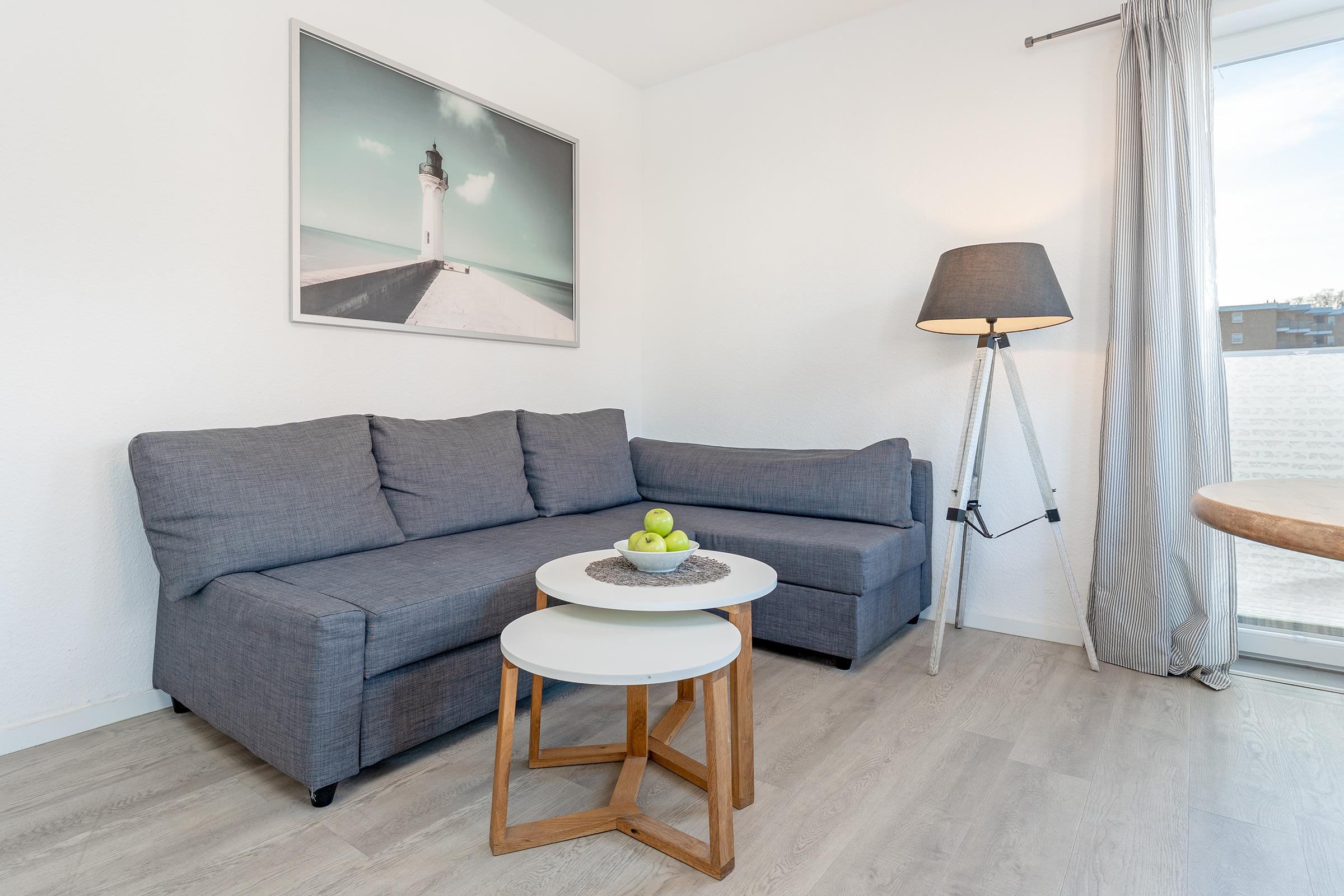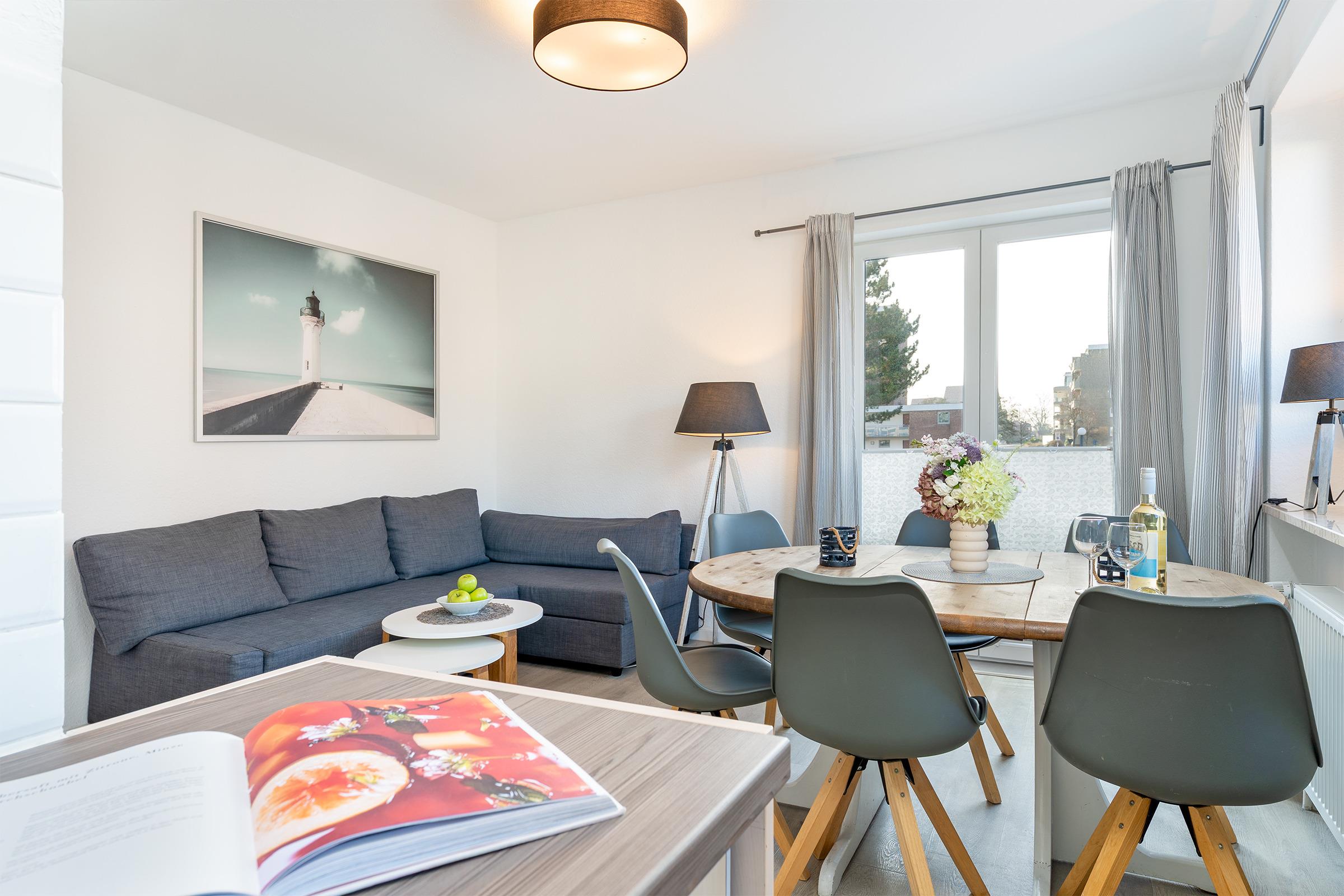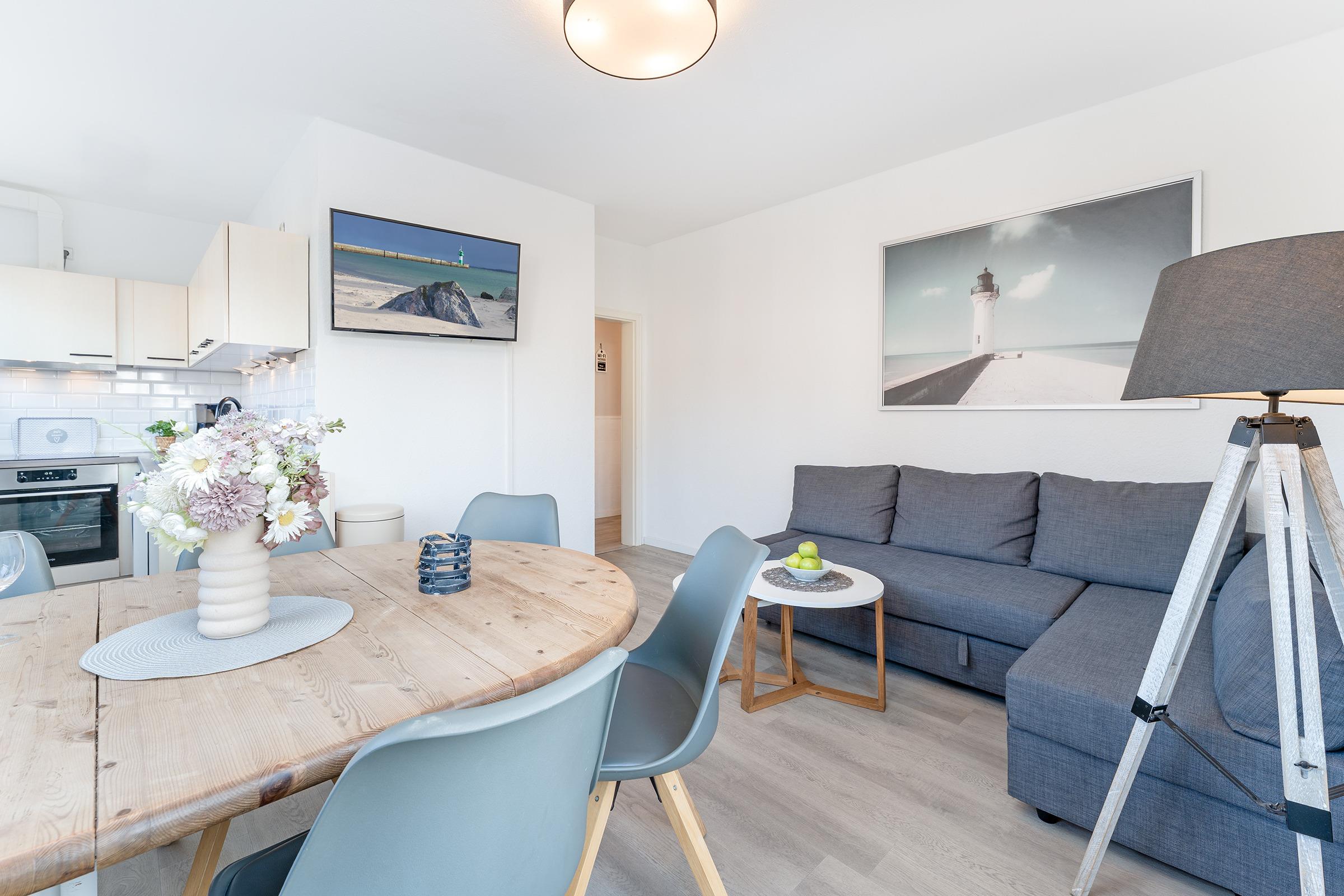 Im hellen Wohnbereich lädt das bequeme Sofa zum Entspannen ein. Ein gemütlicher Essbereich schließt sich an und bietet Platz für gemeinsame Mahlzeiten.