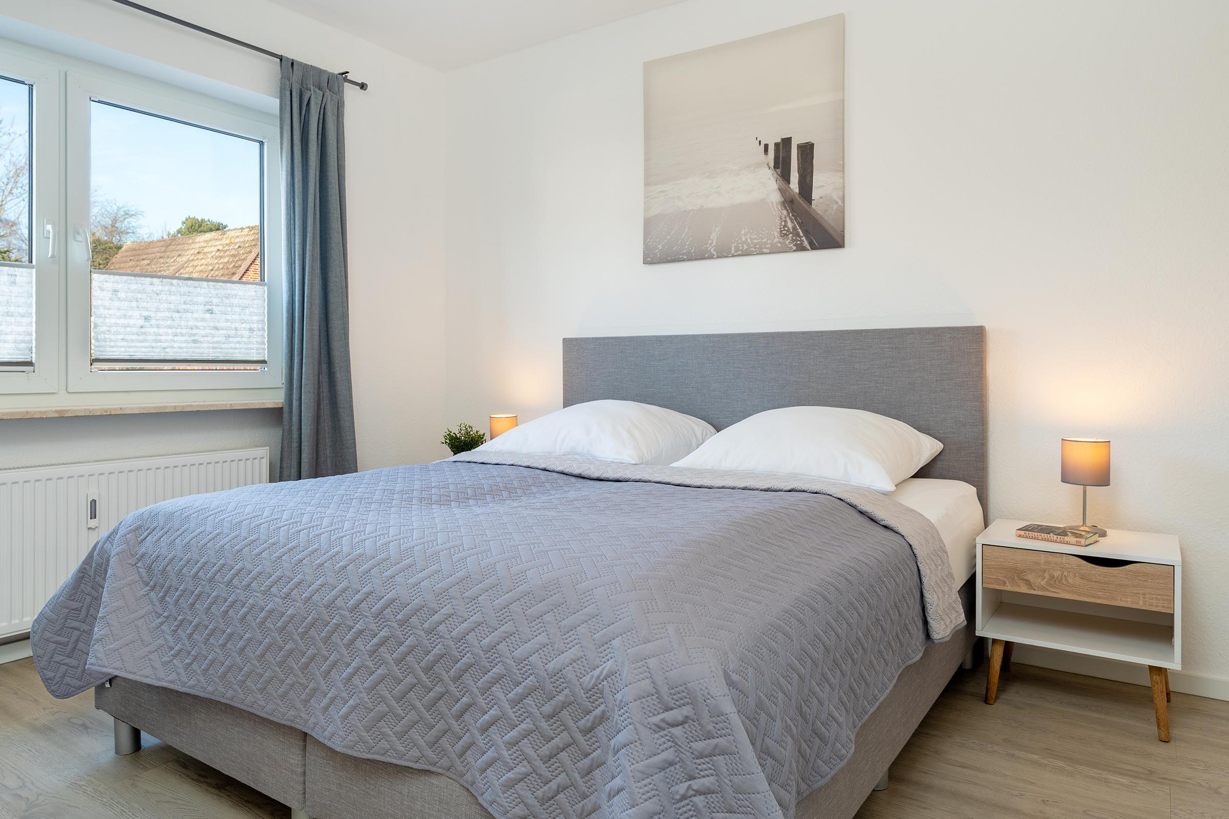 Schlafzimmer 1: 1 Boxspringdoppelbett (2x 90x200 cm mit durchgehendem Topper), Kleiderschrank, TV, Bad en suite, Verdunkelung: Rollladen, Platz für ein Babybett vorhanden