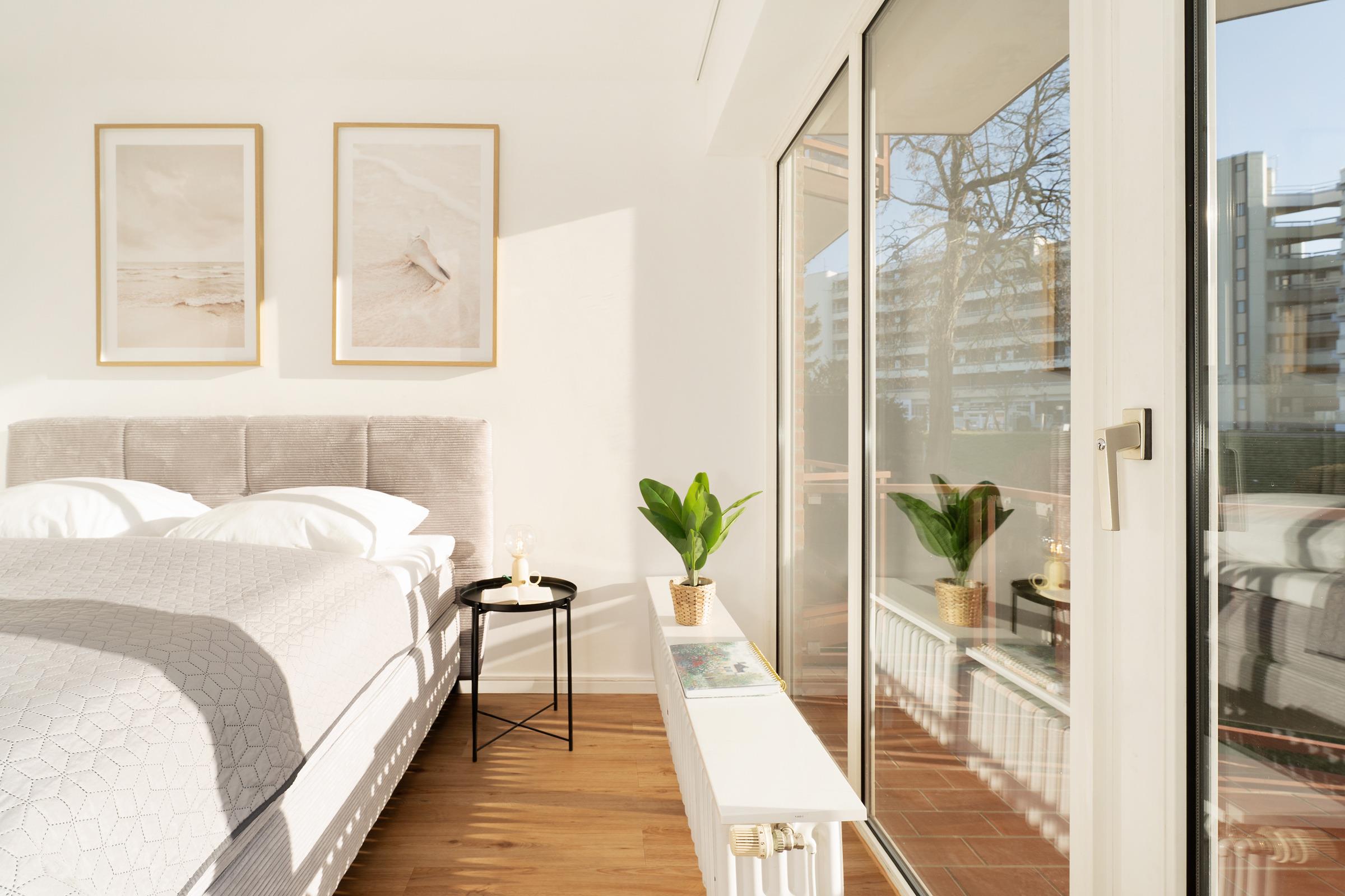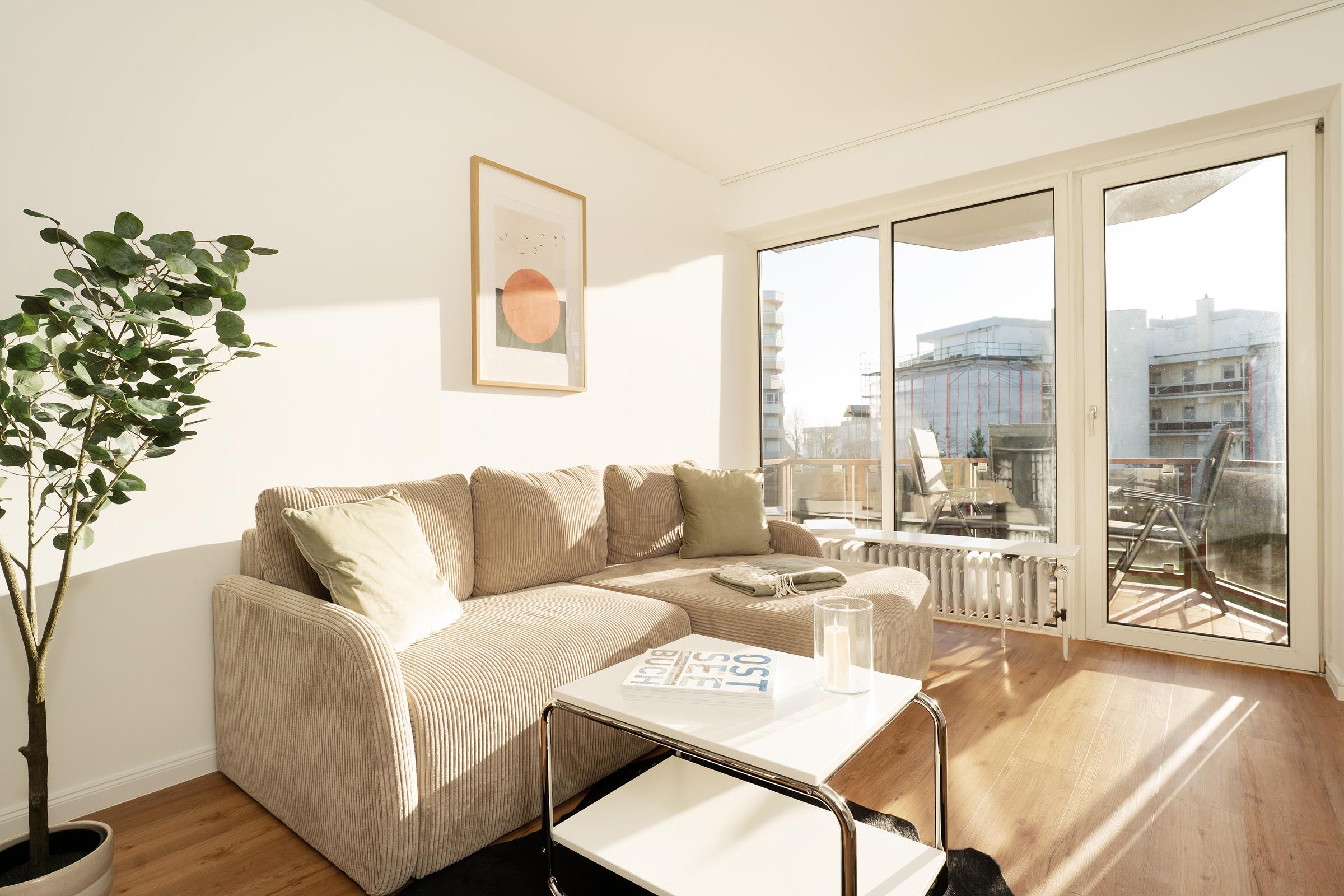 Willkommen in der Deichbude: Diese gemütliche Wohnung kombiniert modernen Komfort mit einer strandnahen Lage in Grömitz. Der Wohn- und Schlafbereich ist freundlich gestaltet und bietet ein Schlafsofa sowie einen Fernseher und ein Radio – ideal für entspannte Abende. Von hier aus gelangen Sie direkt auf einen der schönen möblierten Balkone, der nach Süden ausgerichtet ist und zum Verweilen einlädt.