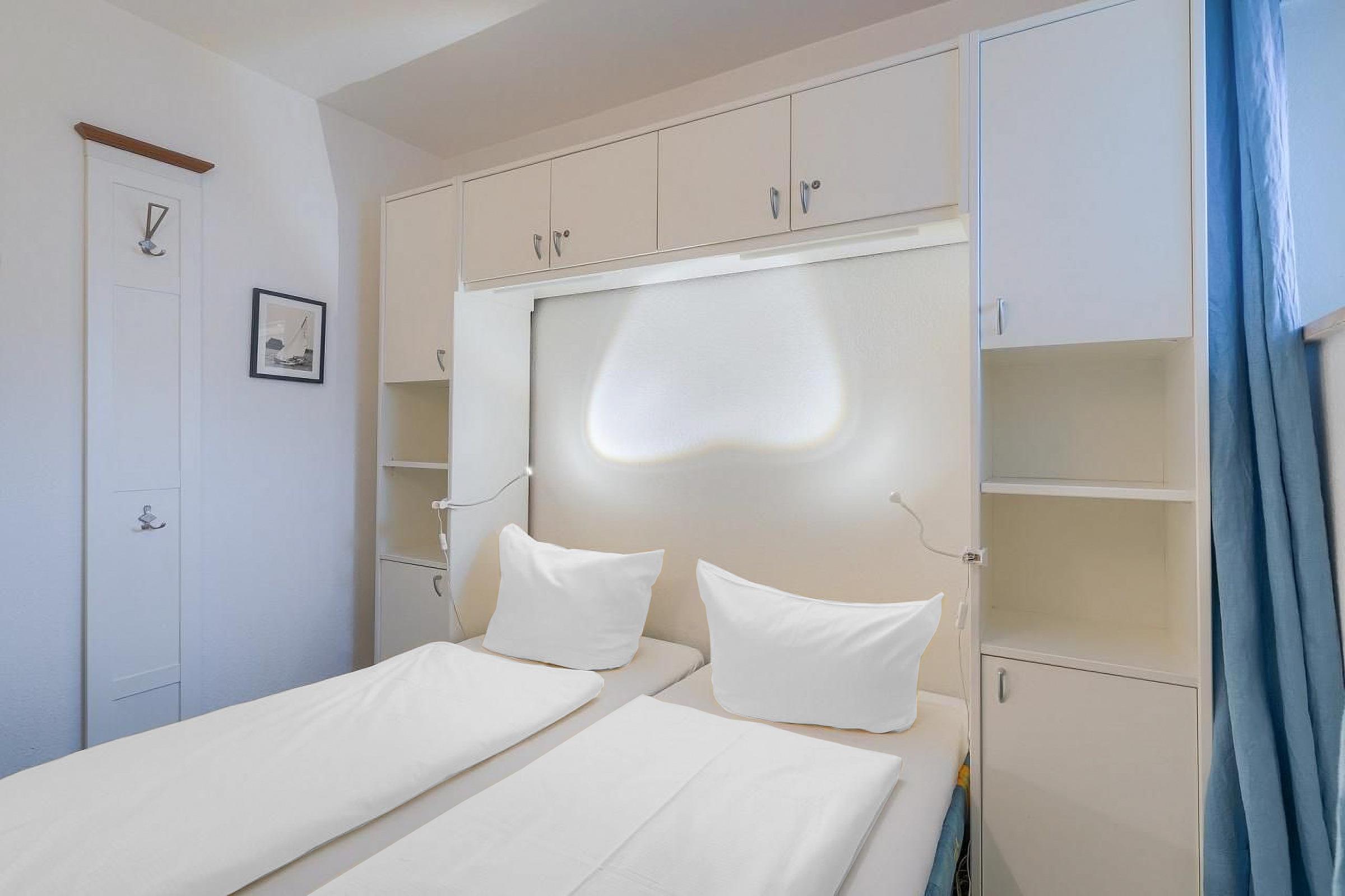 Das gemütliche Schlafzimmer im vorderen Bereich der Wohnung bietet ebenfalls 2 Schlafmöglichkeiten auf einem Polsterbett (2x80x200cm). Wandschränke bieten guten Stauraum für Ihre Kleidung.