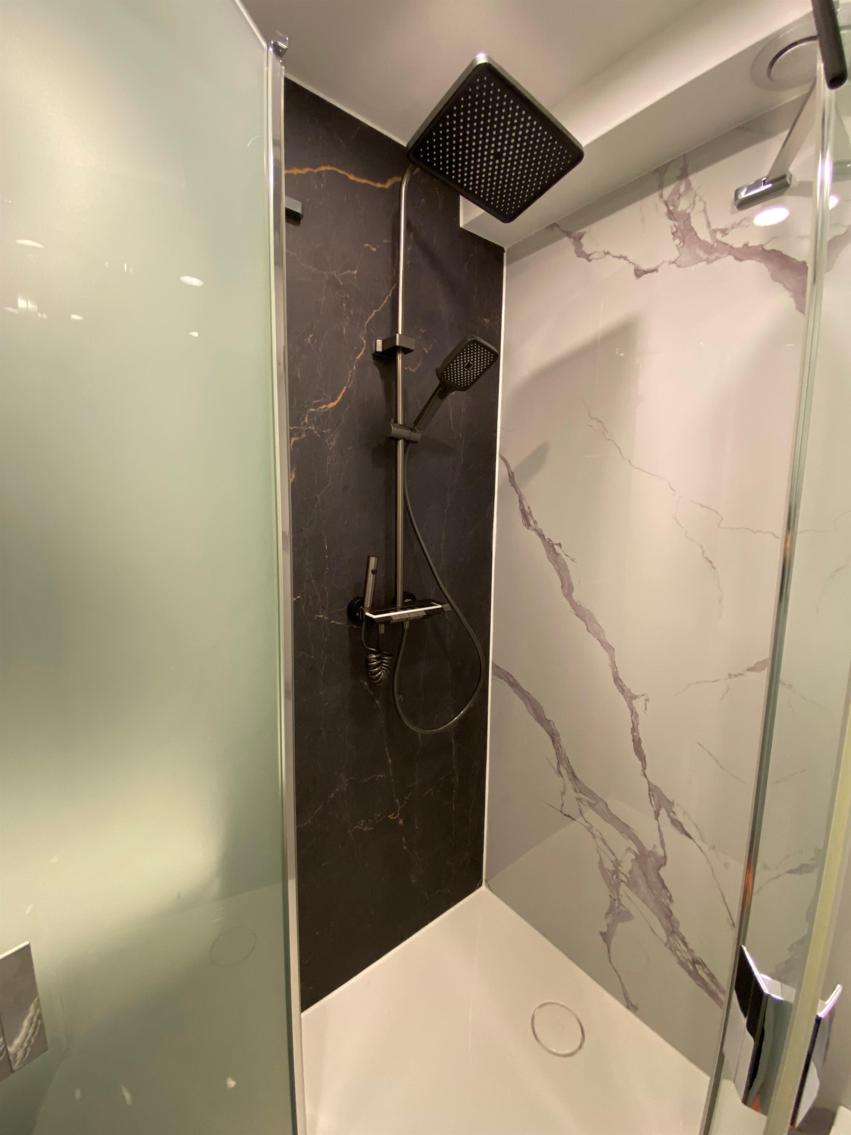 Modernes Badezimmer mit Spiegelschrank, Dusche und Föhn