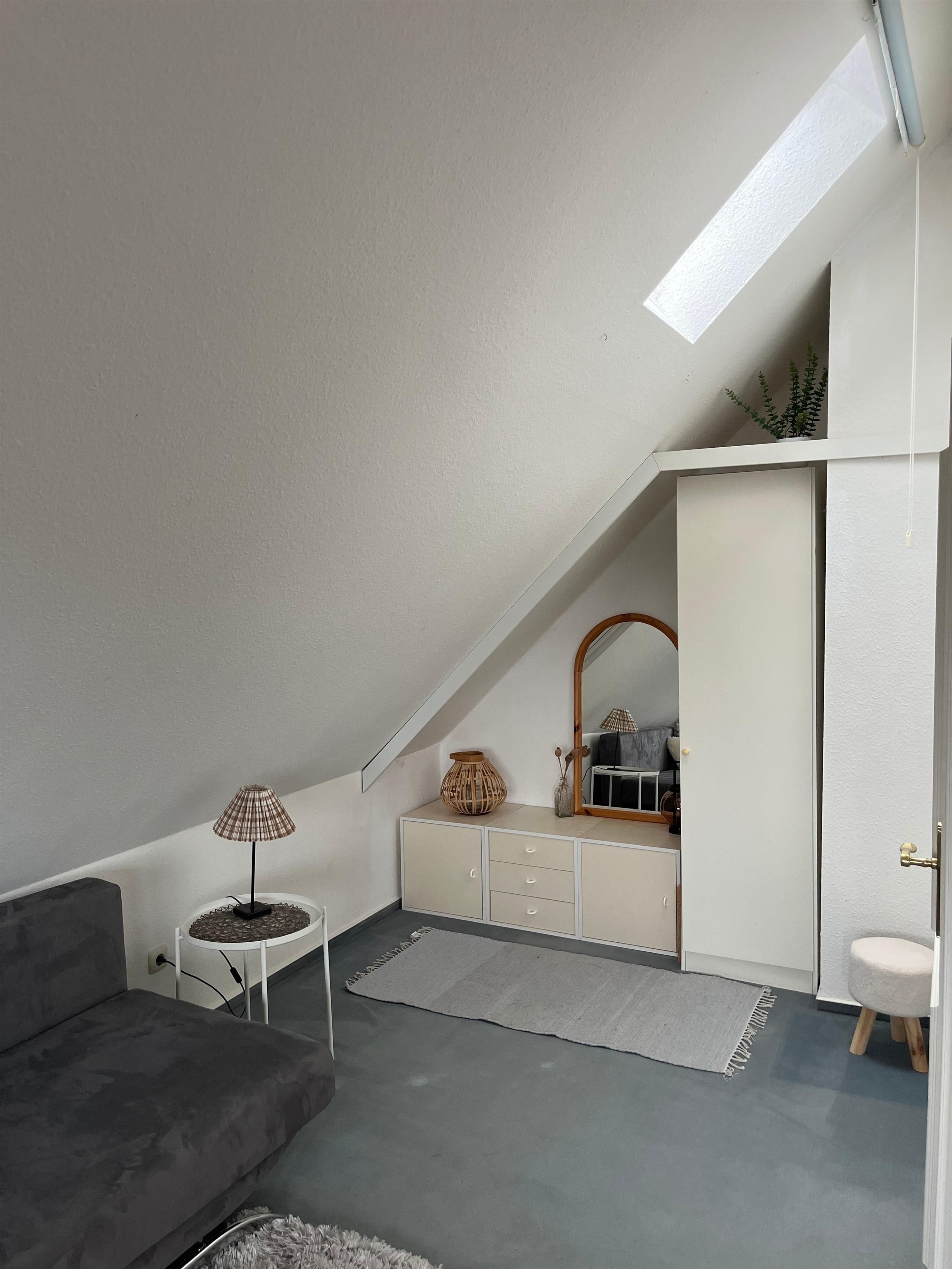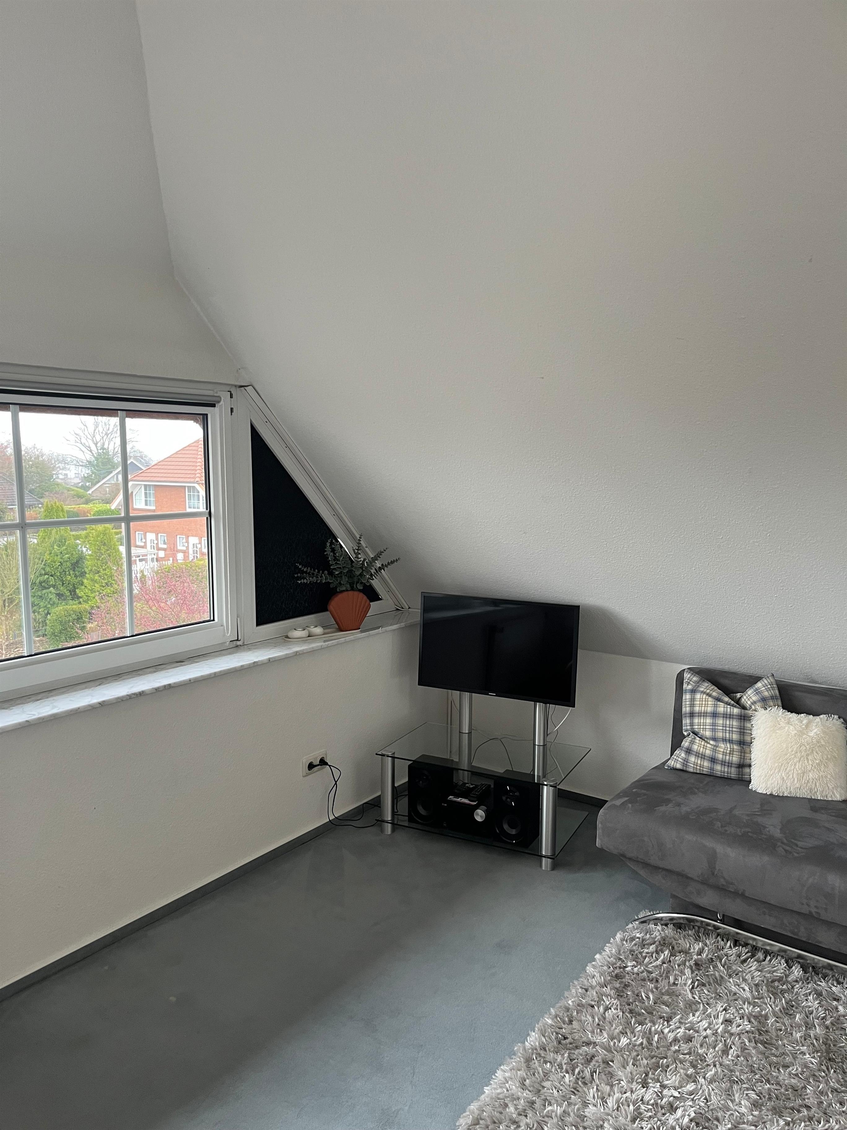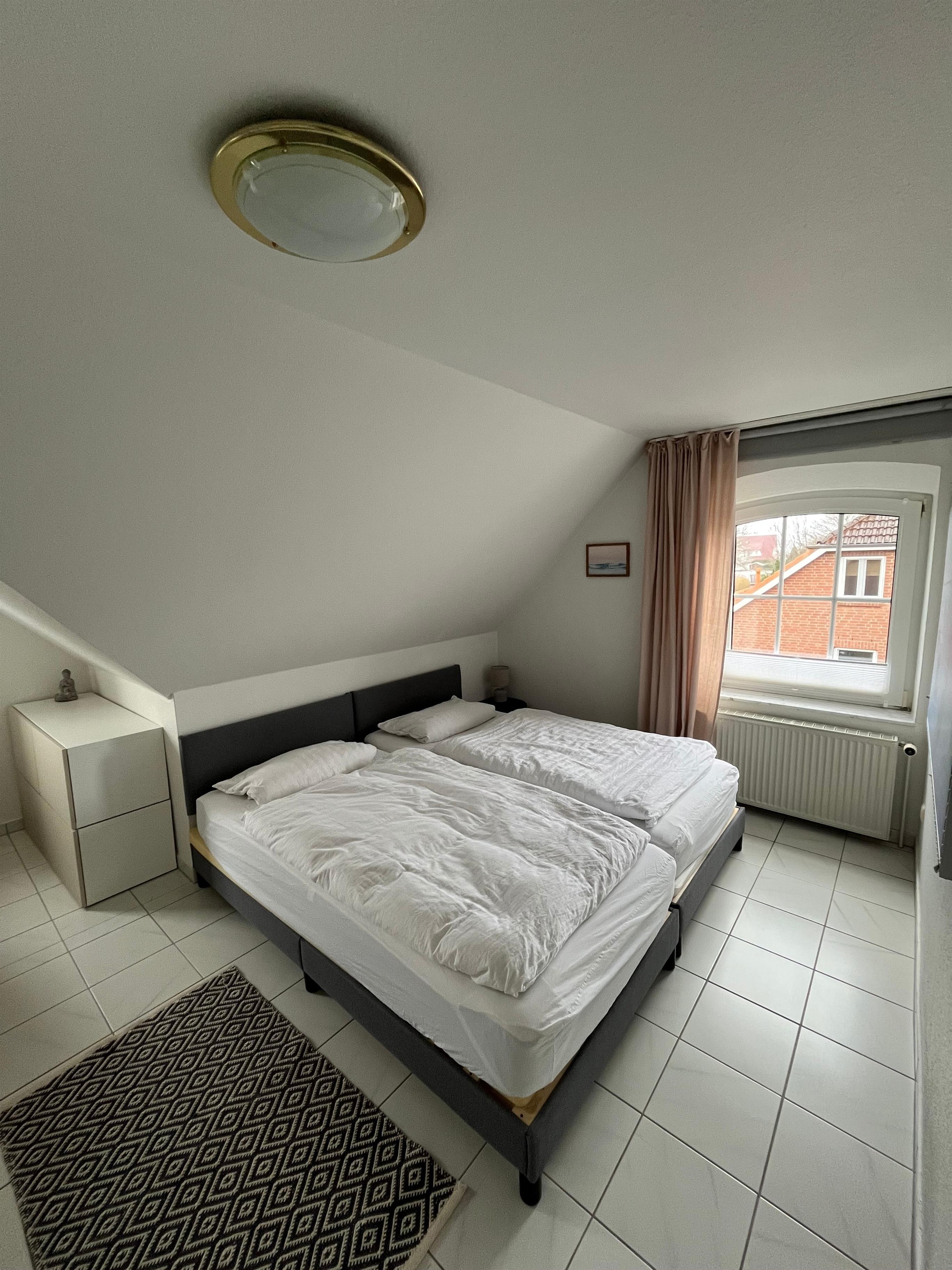 Im Dachgeschoss erwartet Sie ein charmantes Zimmer mit großem Doppelbett, Schlafsofa und Meerblick auf die Lübecker Bucht - ein ruhiger Rückzugsort unterm Spitzdach. Ein weiteres Schlafzimmer im Erdgeschoss bietet ein modernes Doppelbett sowie ein Einzelbett.
