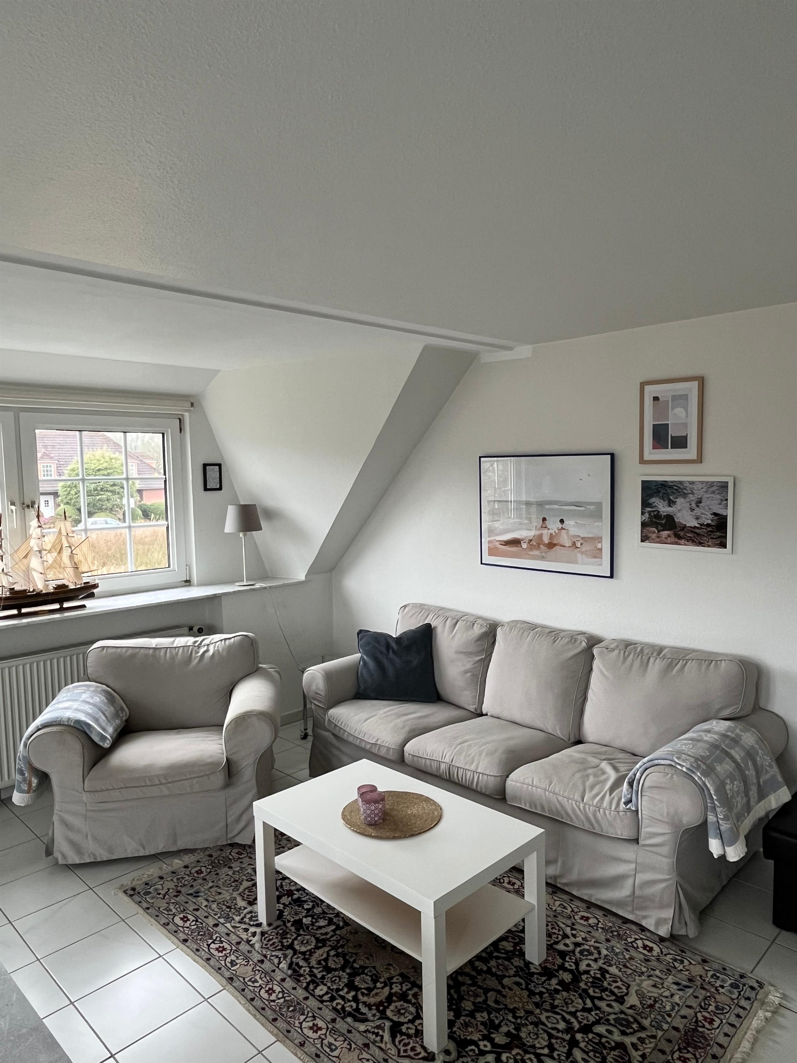 Die Wohnung überzeugt durch ihre helle und offene Wohnküche, die zum gemeinsamen Kochen, Essen und Entspannen einlädt. Die Küchenzeile ist vollständig ausgestattet und lässt keine Wünsche offen. Sie finden hier ein Cerankochfeld, einen Backofen, einen Geschirrspüler, eine Mikrowelle und eine Kaffeemaschine. Ein schöner Essplatz für 6 Personen und eine Couch laden zum Verweilen ein. Kostenloses WLAN, eine Stereoanlage und ein TV stehen zur Verfügung. Vom Wohnbereich aus gelangen Sie direkt auf den Balkon, auf dem Sie sonnige Stunden oder den Abend bei einem Glas Wein und einem Barbecue im Strandkorb genießen können.