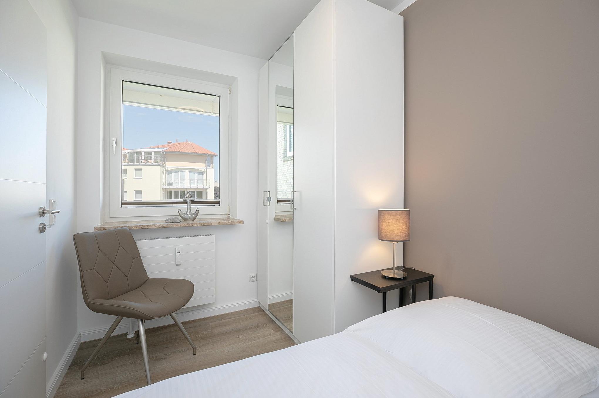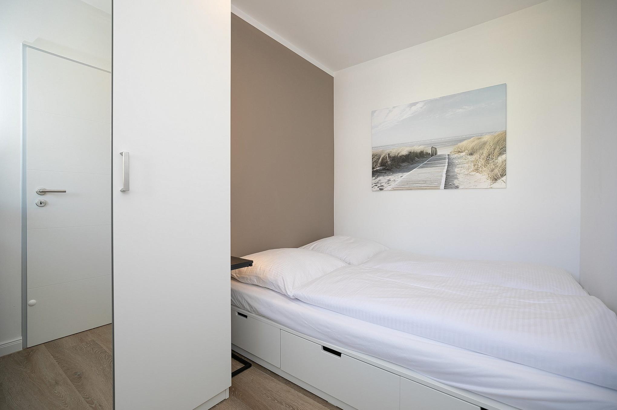 Kleines Schlafzimmer mit Doppelbett (160x200cm) und einem 2-türigen Kleiderschrank. Der Raum ist mit hochwertigem Vinylboden in Holzoptik ausgelegt. Das Fenster lässt sich durch ein Plissee blickdicht verdunkeln.