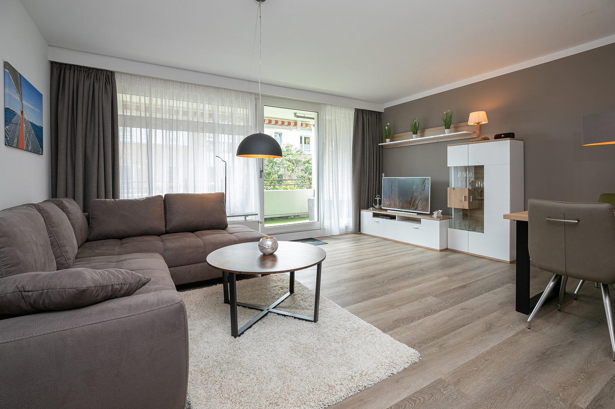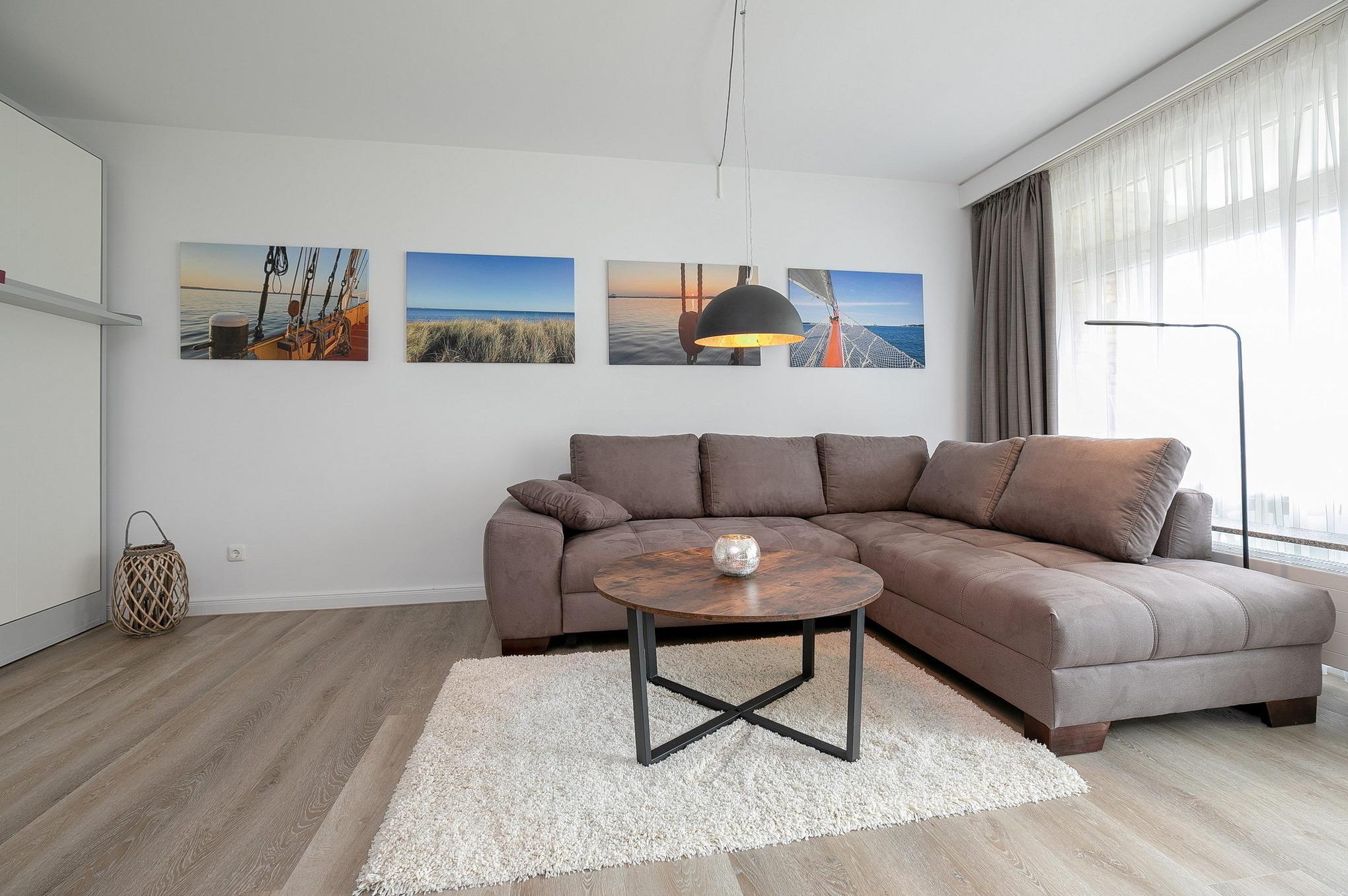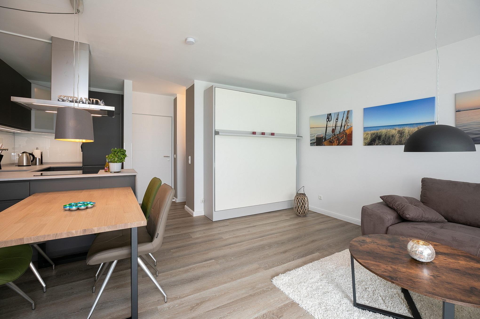 Helles modernes Wohn- Schlafzimmer mit direktem Zugang zum Balkon. Der Wohnraum ist ausgestattet mit einem gemütlichen großen Ecksofa, einem komfortablen leichtgängigen Schrankbett (180x200cm) und einem Esstisch mit Platz für 4 Personen. Zur Unterhaltung stehen ein Flachbild-TV (Smart-TV mit WLAN) sowie ein Blueray-Player zur Verfügung. Der Raum ist mit hochwertigem Vinylboden in Holzoptik ausgelegt. Das Fenster lässt sich durch einen Vorhang verdunkeln.