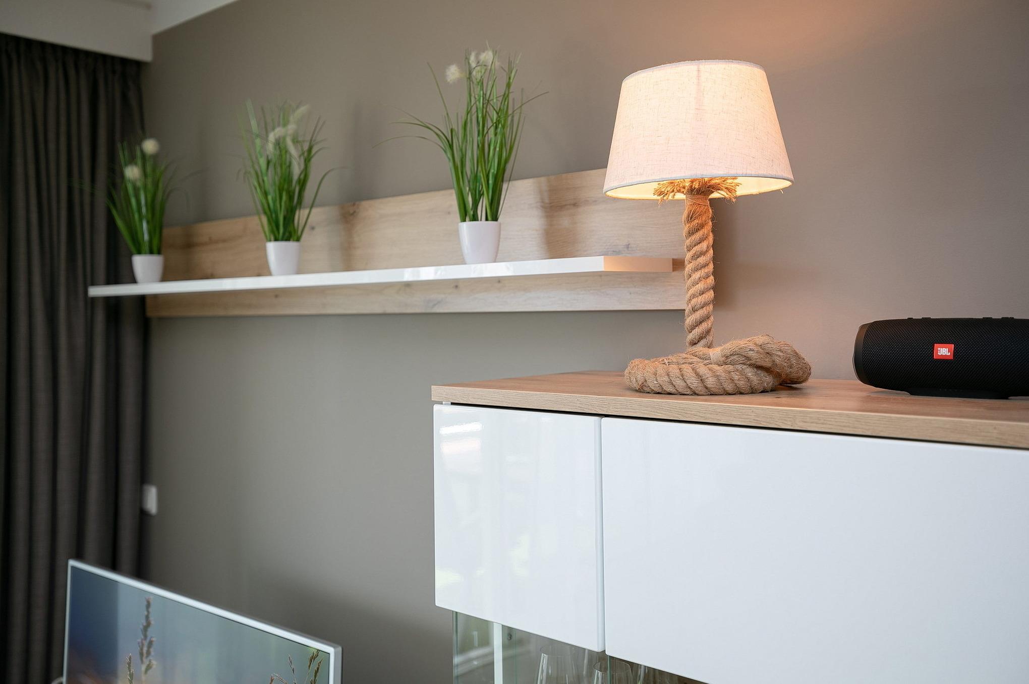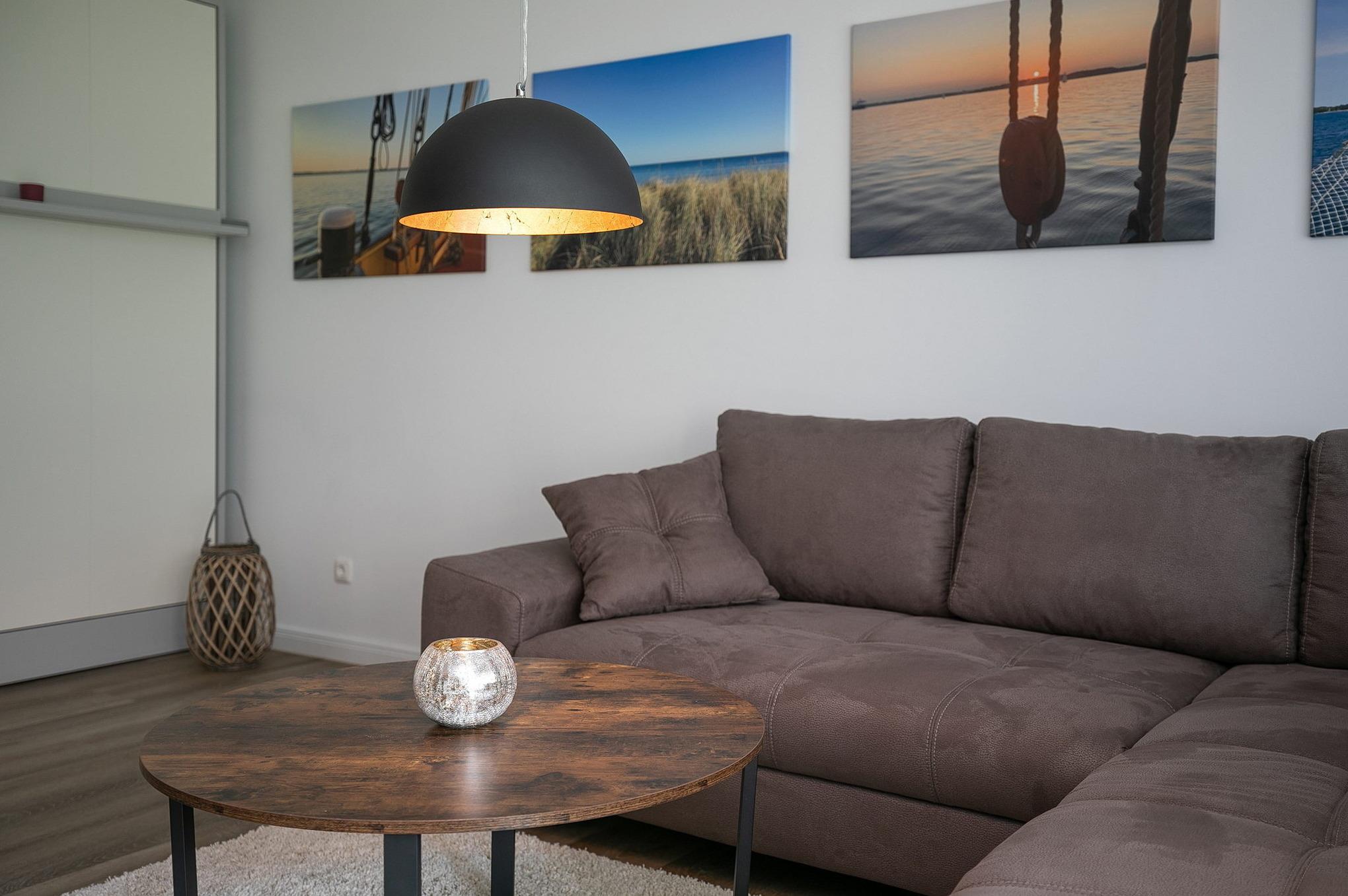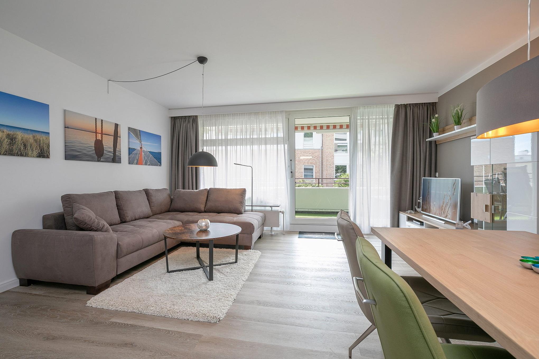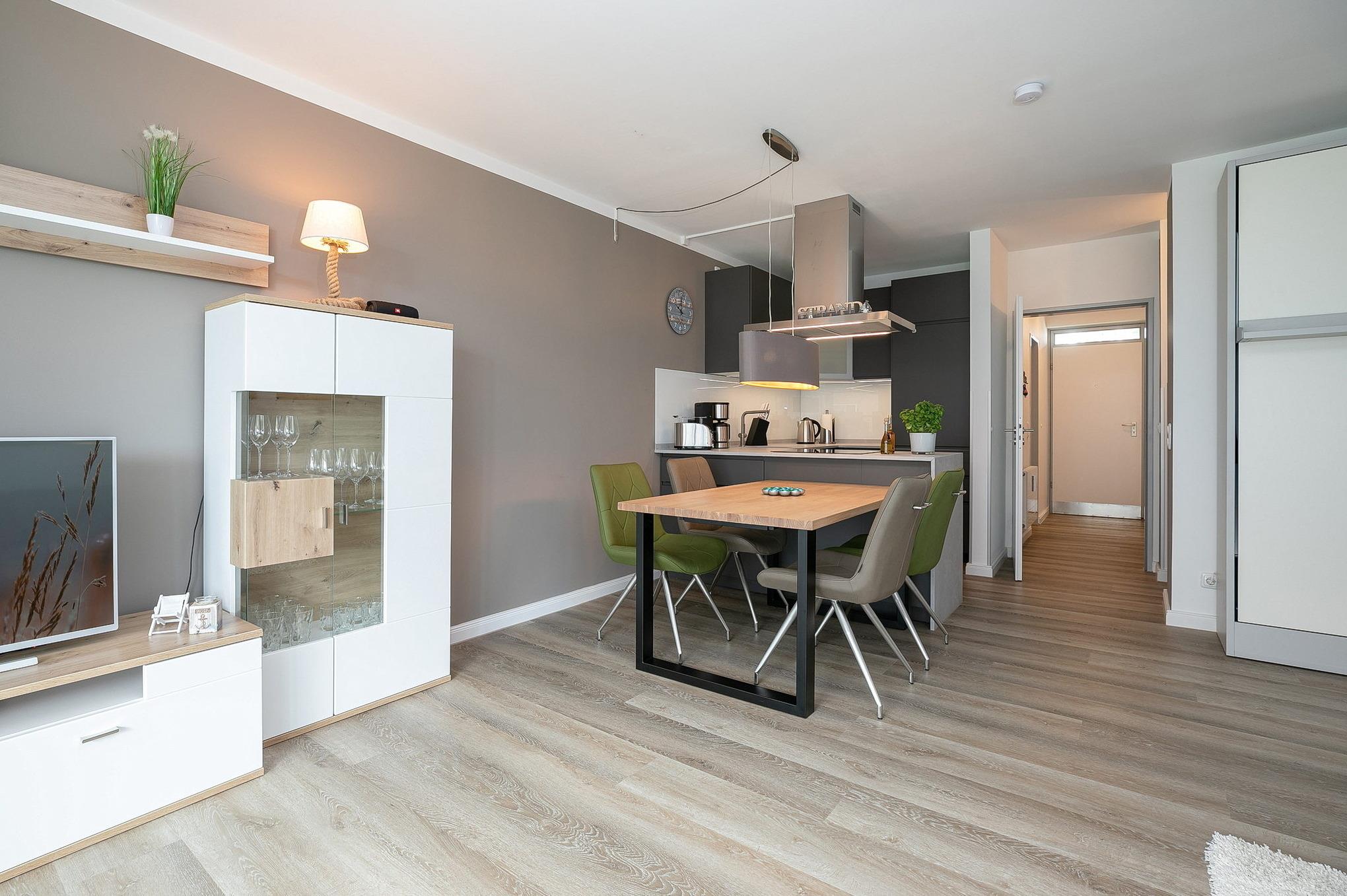 Helles modernes Wohn- Schlafzimmer mit direktem Zugang zum Balkon. Der Wohnraum ist ausgestattet mit einem gemütlichen großen Ecksofa, einem komfortablen leichtgängigen Schrankbett (180x200cm) und einem Esstisch mit Platz für 4 Personen. Zur Unterhaltung stehen ein Flachbild-TV (Smart-TV mit WLAN) sowie ein Blueray-Player zur Verfügung. Der Raum ist mit hochwertigem Vinylboden in Holzoptik ausgelegt. Das Fenster lässt sich durch einen Vorhang verdunkeln.