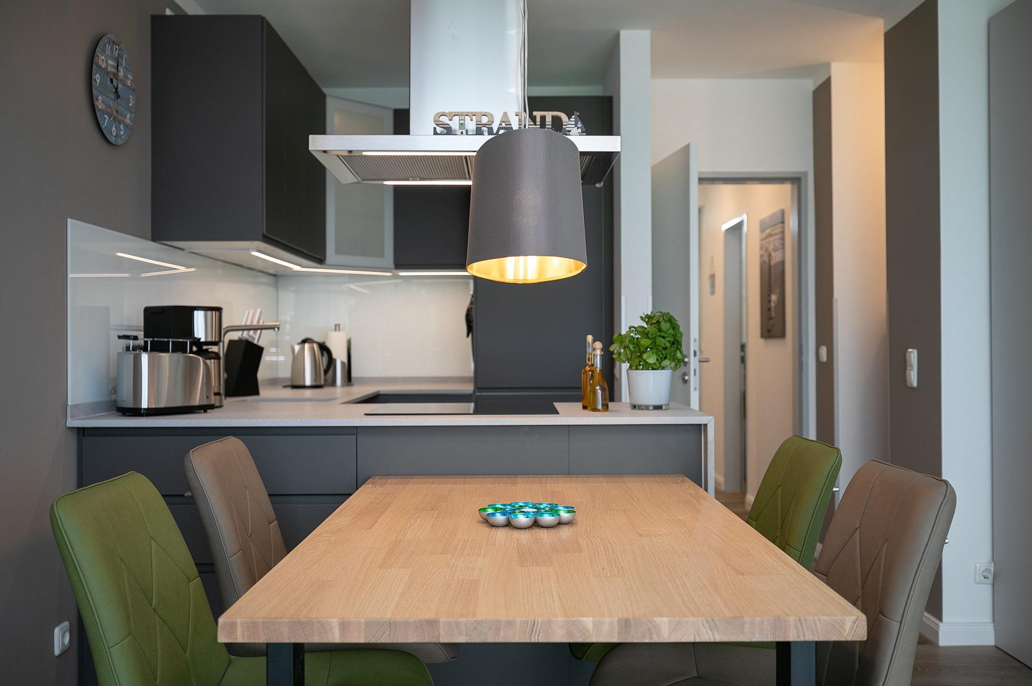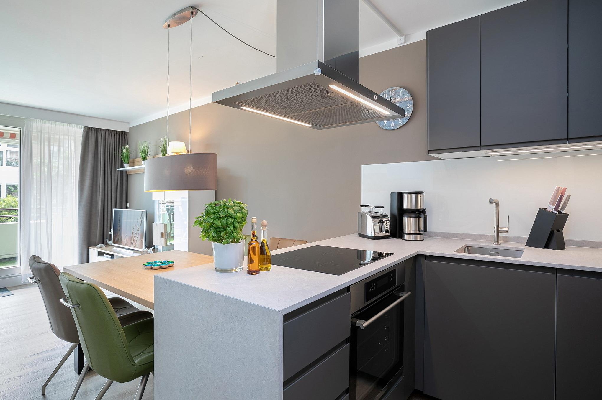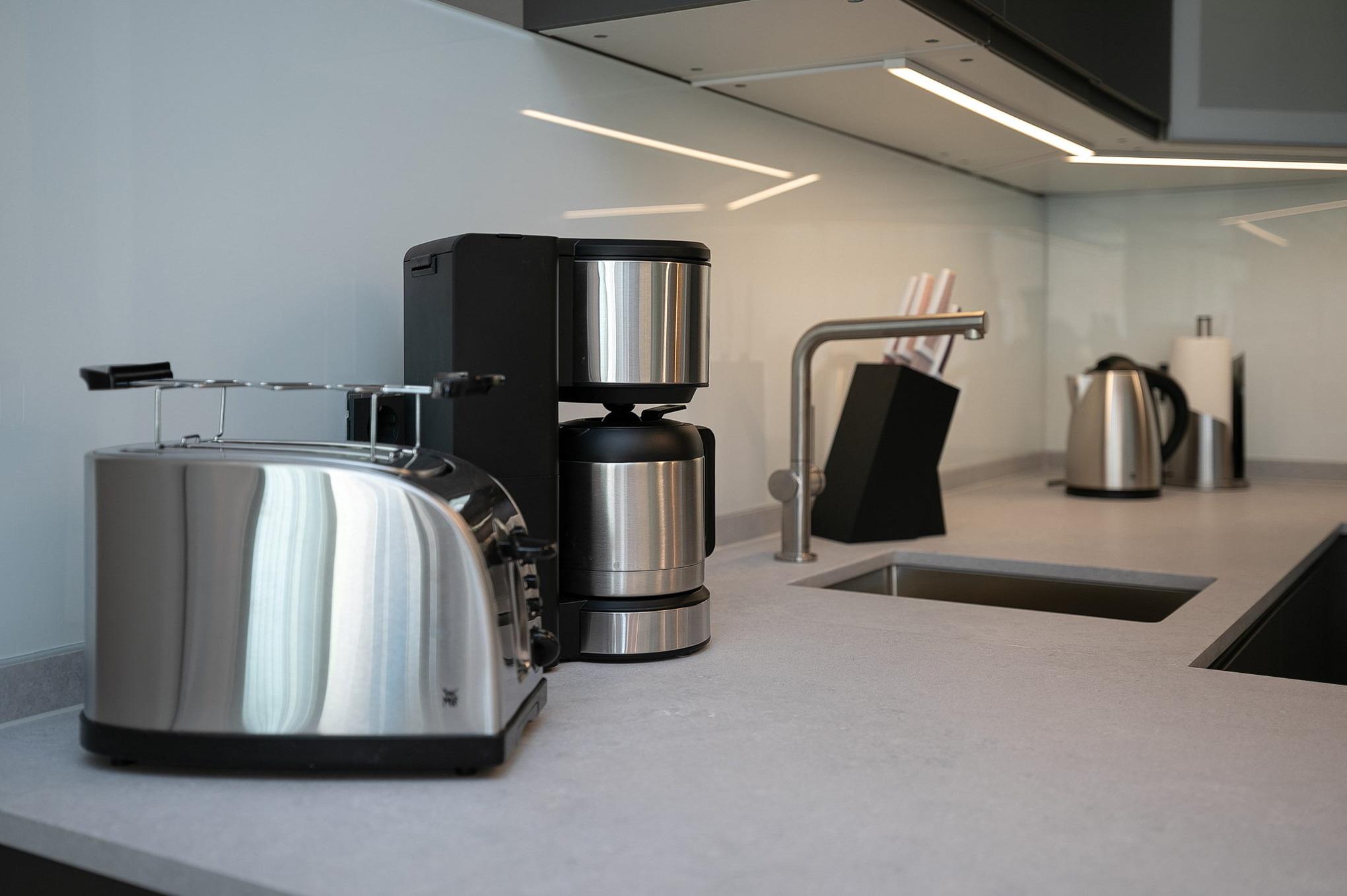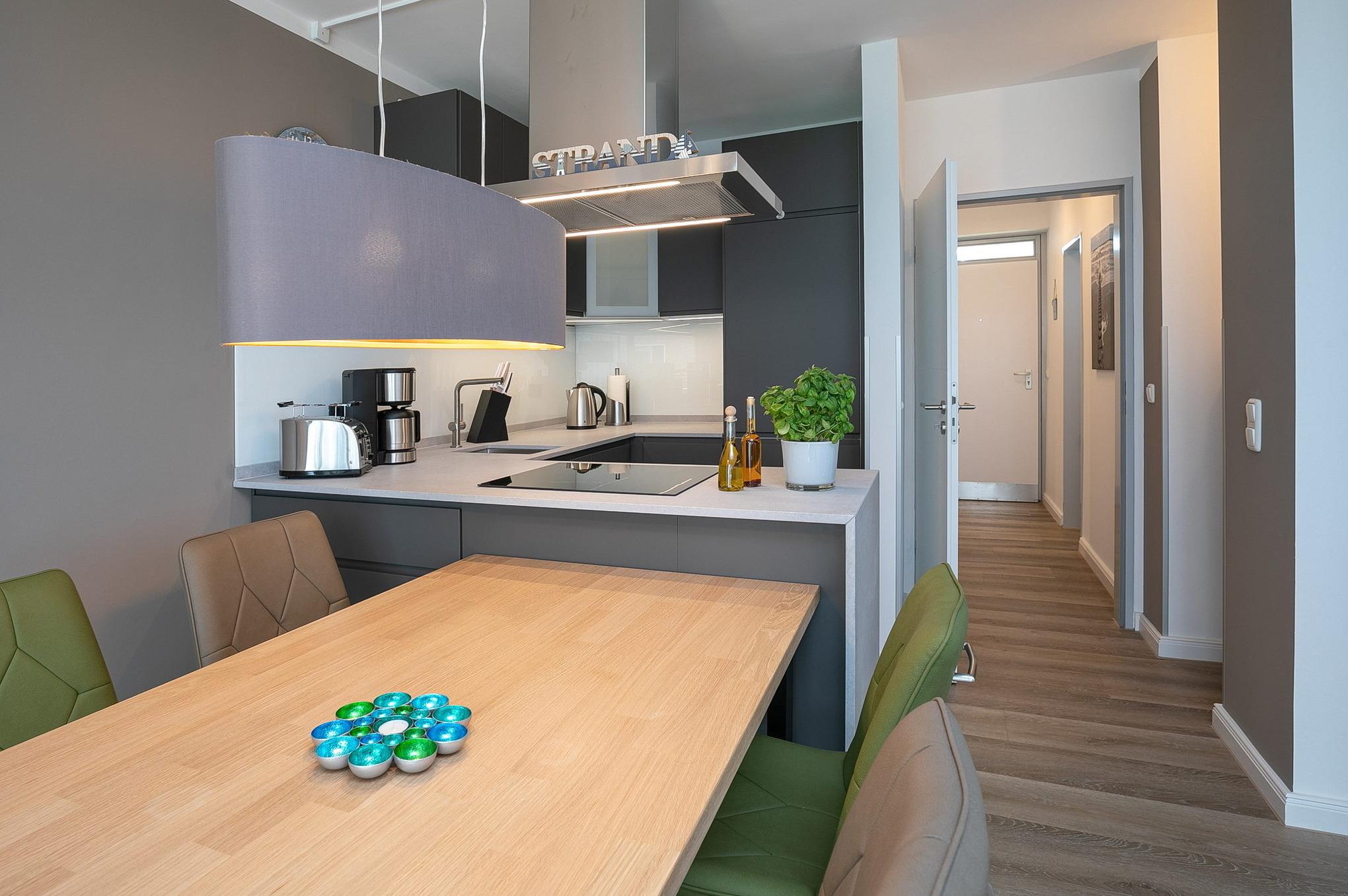 Moderne zum Wohnbereich offene voll ausgestattete Küche mit 4-Platten-Induktions-Kochfeld, Dunstabzugshaube, Kühlschrank mit kleinem Gefrierfach, Spülmaschine und Backofen. Außerdem stehen eine Kaffeemaschine, ein Wasserkocher sowie ein Toaster zur Verfügung.