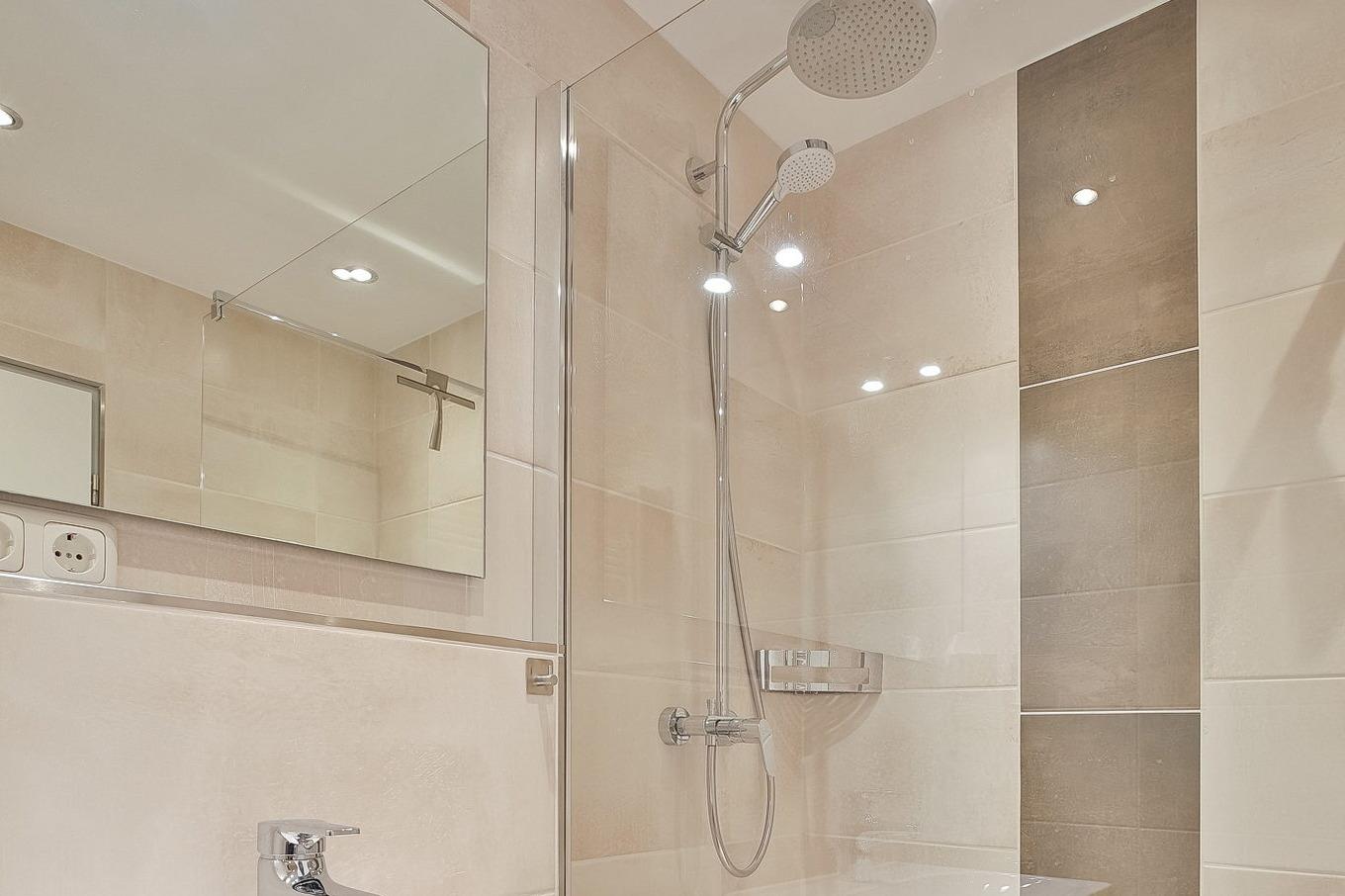 Modernes Bad mit Dusche, WC und Waschbecken, großem Spiegel und Föhn.