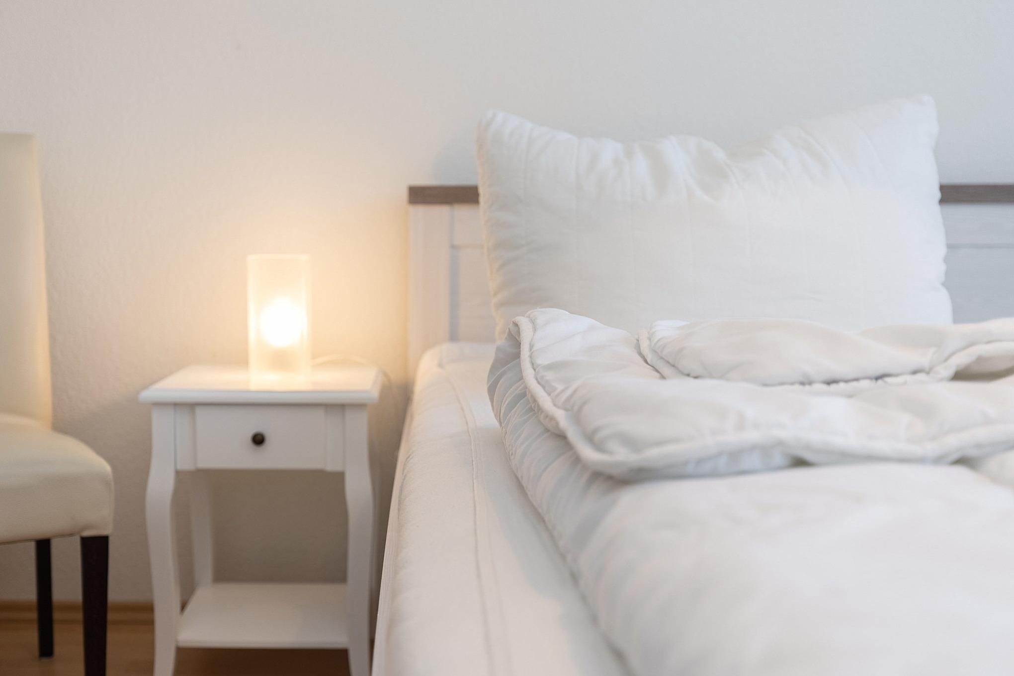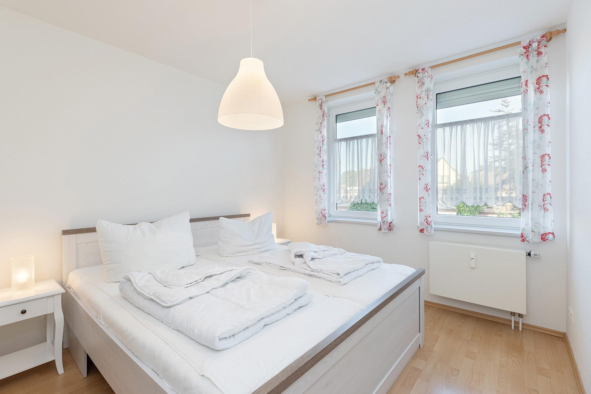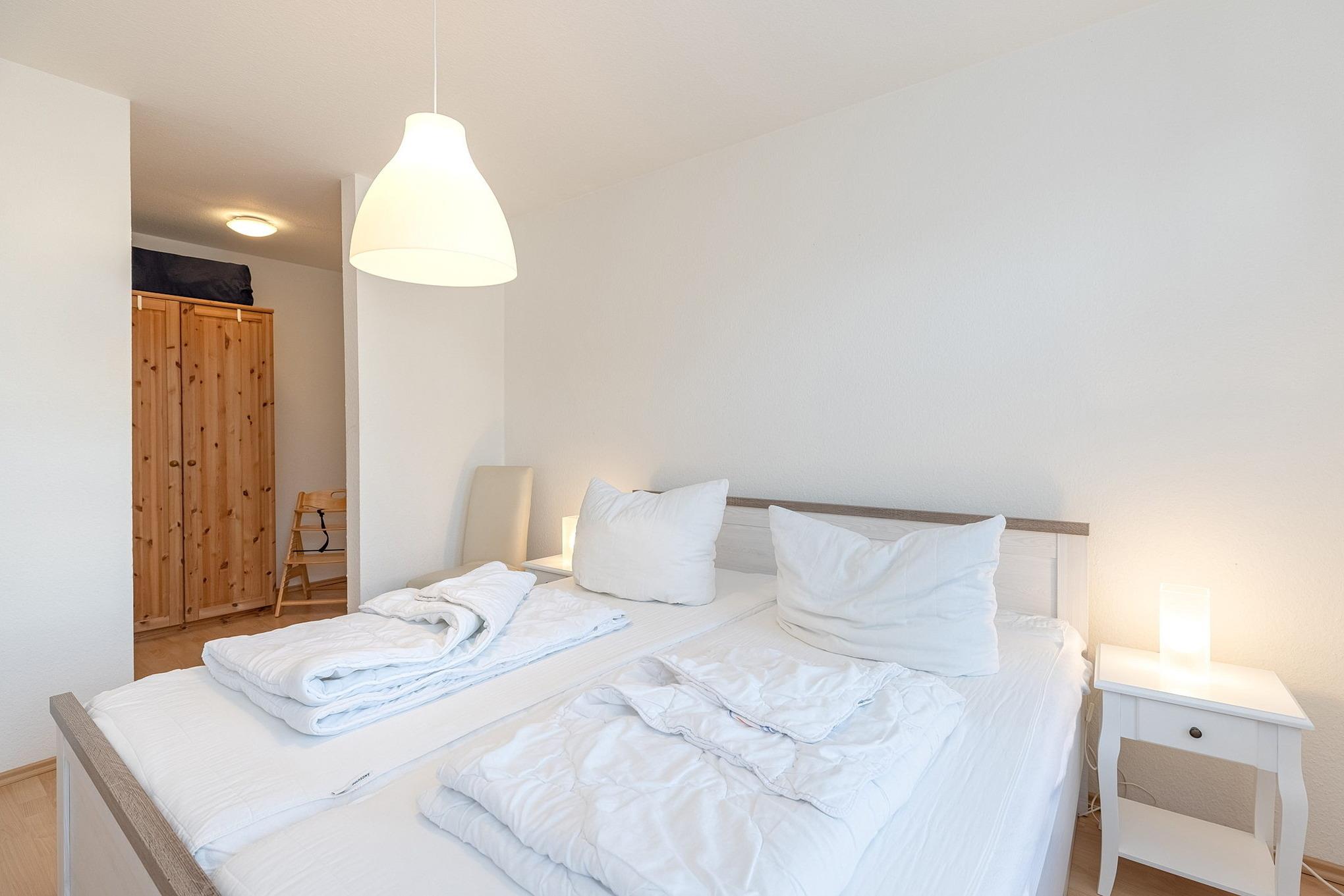 Das separate Schlafzimmer ist mit einem Doppelbett (2x 90x200cm) und einem 2-türigen Kleiderschrank ausgestattet. Das Schlafzimmer ist mit Laminatboden ausgelegt. Das Fenster lässt sich durch einen Vorhang und einem Außenrollo vollständig verdunkeln.