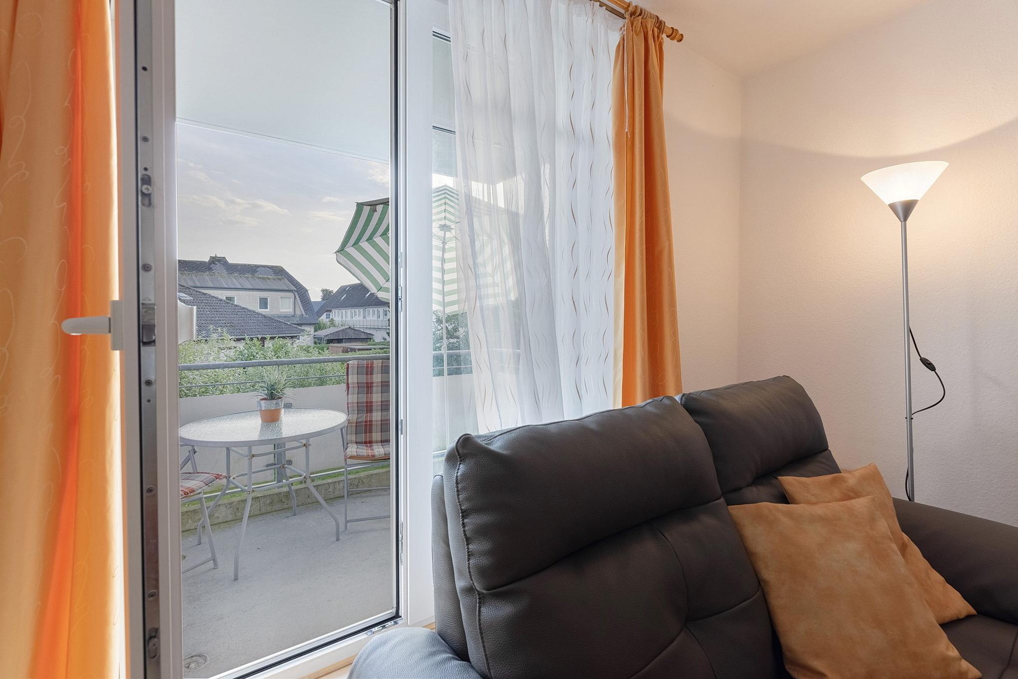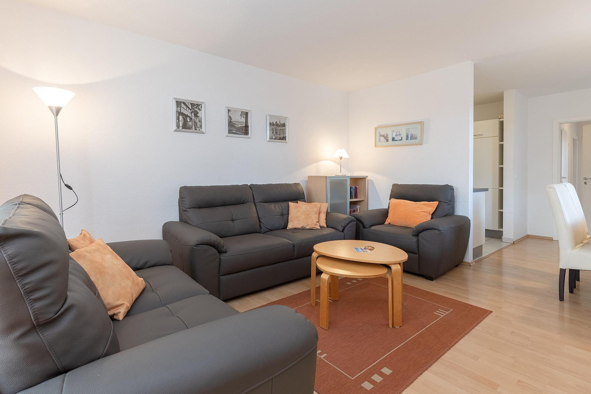 Modernes, freundliches Wohn- und Esszimmer mit direktem Zugang zum Balkon in südliche Richtung. Das Wohn- und Esszimmer ist mit einem Essplatz für 4 Personen, einer 2-Sitzer und einer 3-Sitzer Couch, einem Couchtisch, einer Kommode und einem Wohnzimmerschrank ausgestattet. Zur Unterhaltung stehen ein Flachbildfernseher und eine Mini-Stereoanlage mit CD-Player zur Verfügung.