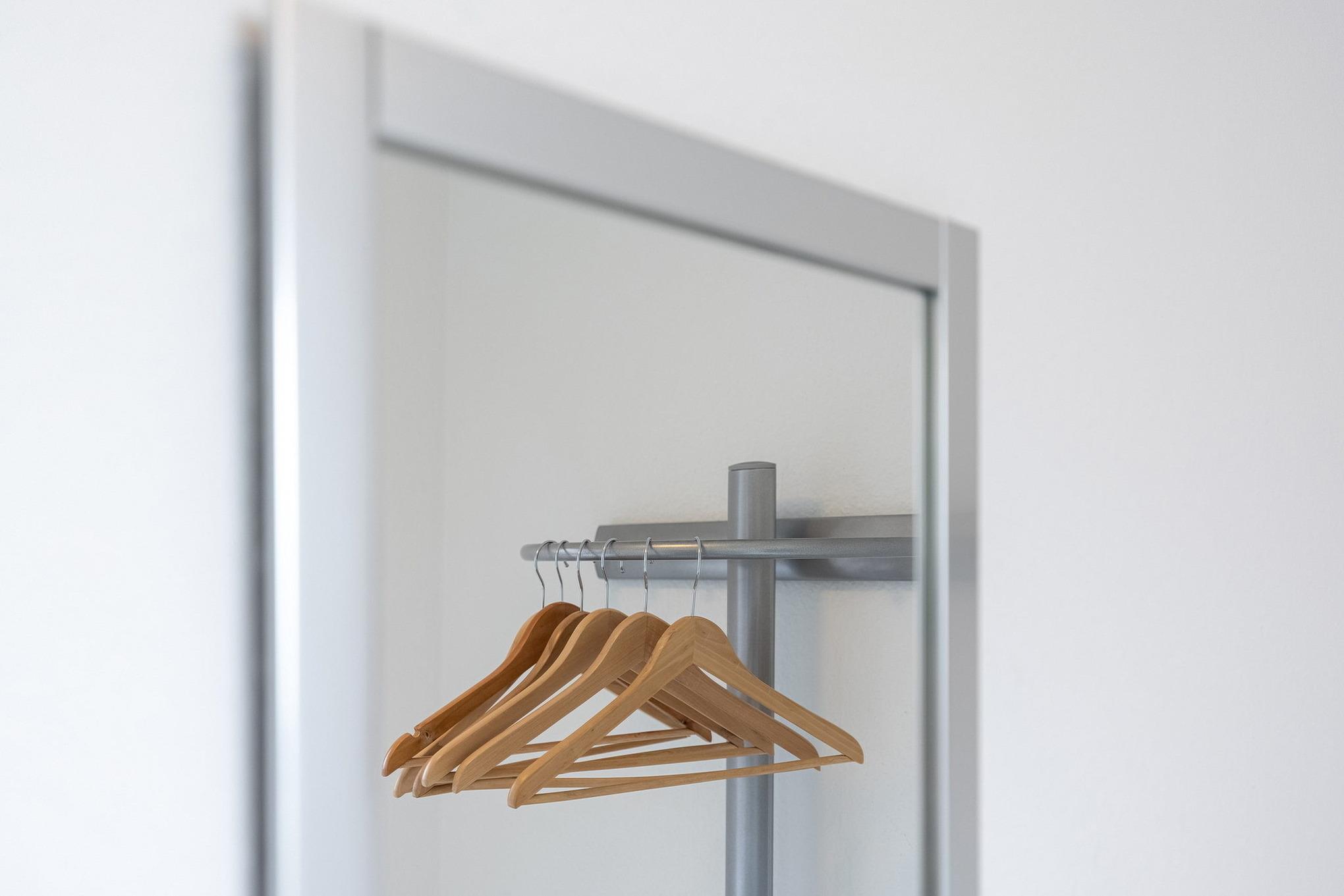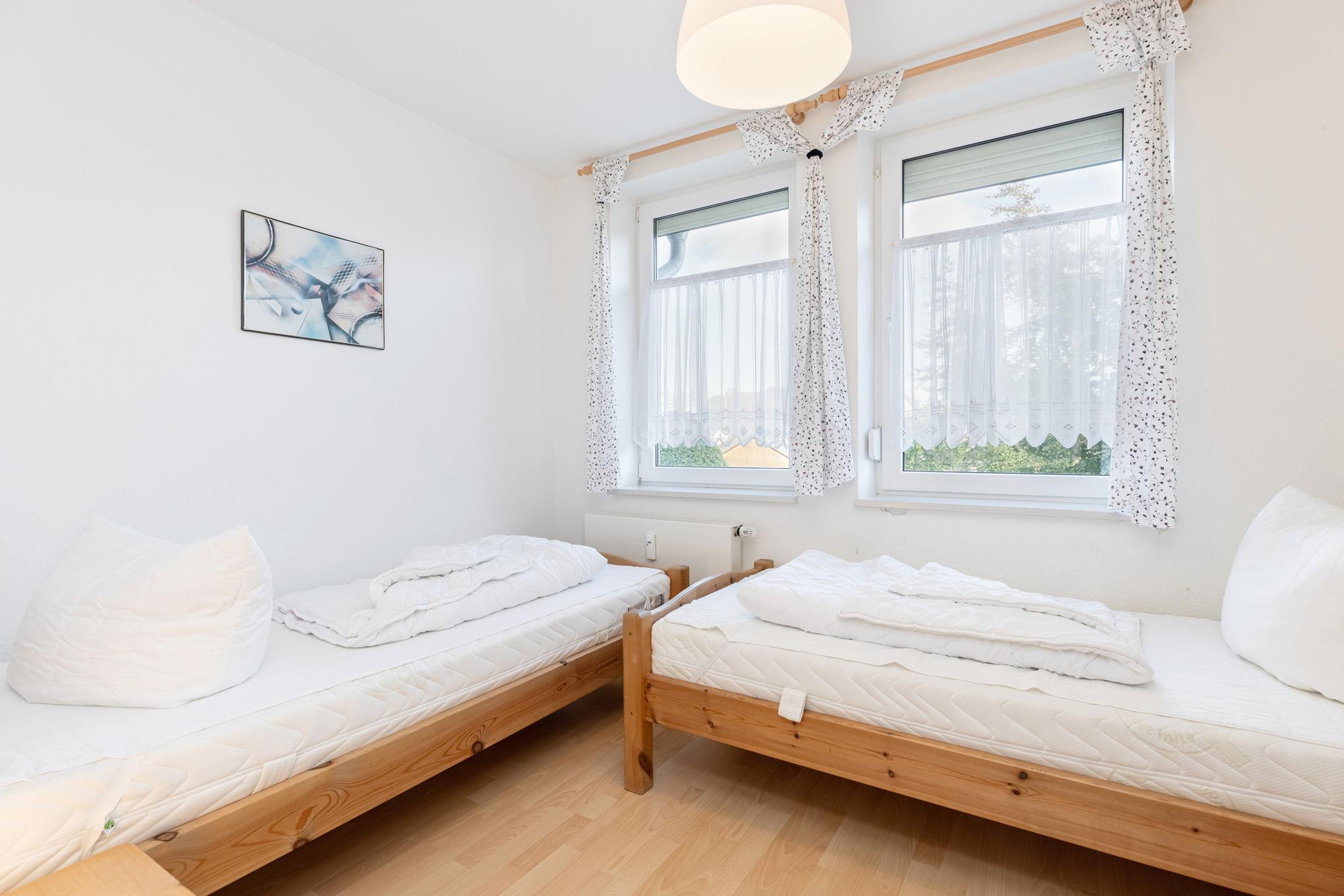 Das Schlaf- bzw. Kinderzimmer ist mit 2 Einzelbetten (90x200cm) und einem kleinen Kleiderschrank ausgestattet. Das Zimmer ist mit Laminatboden ausgelegt. Das Fenster lässt sich durch ein Außenrollo vollständig verdunkeln.