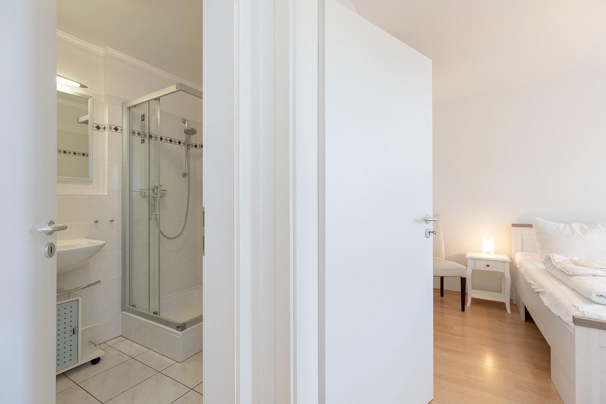 Modernes, hell gefliestes Bad mit Dusche, WC und Waschbecken. Zusätzliches separates, modernes und hell gefliestes WC.