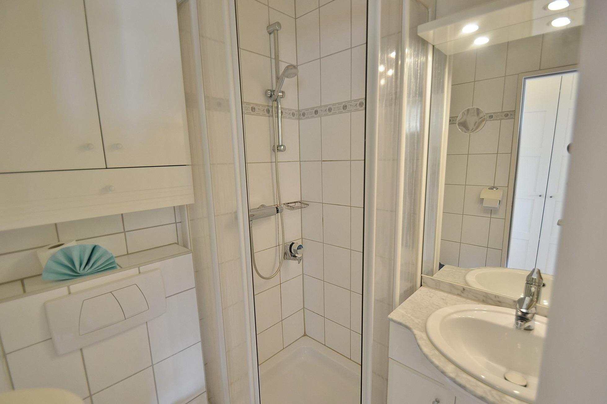 Modernes, freundliches, hell gefliestes Bad mit Dusche, WC und Waschbecken.