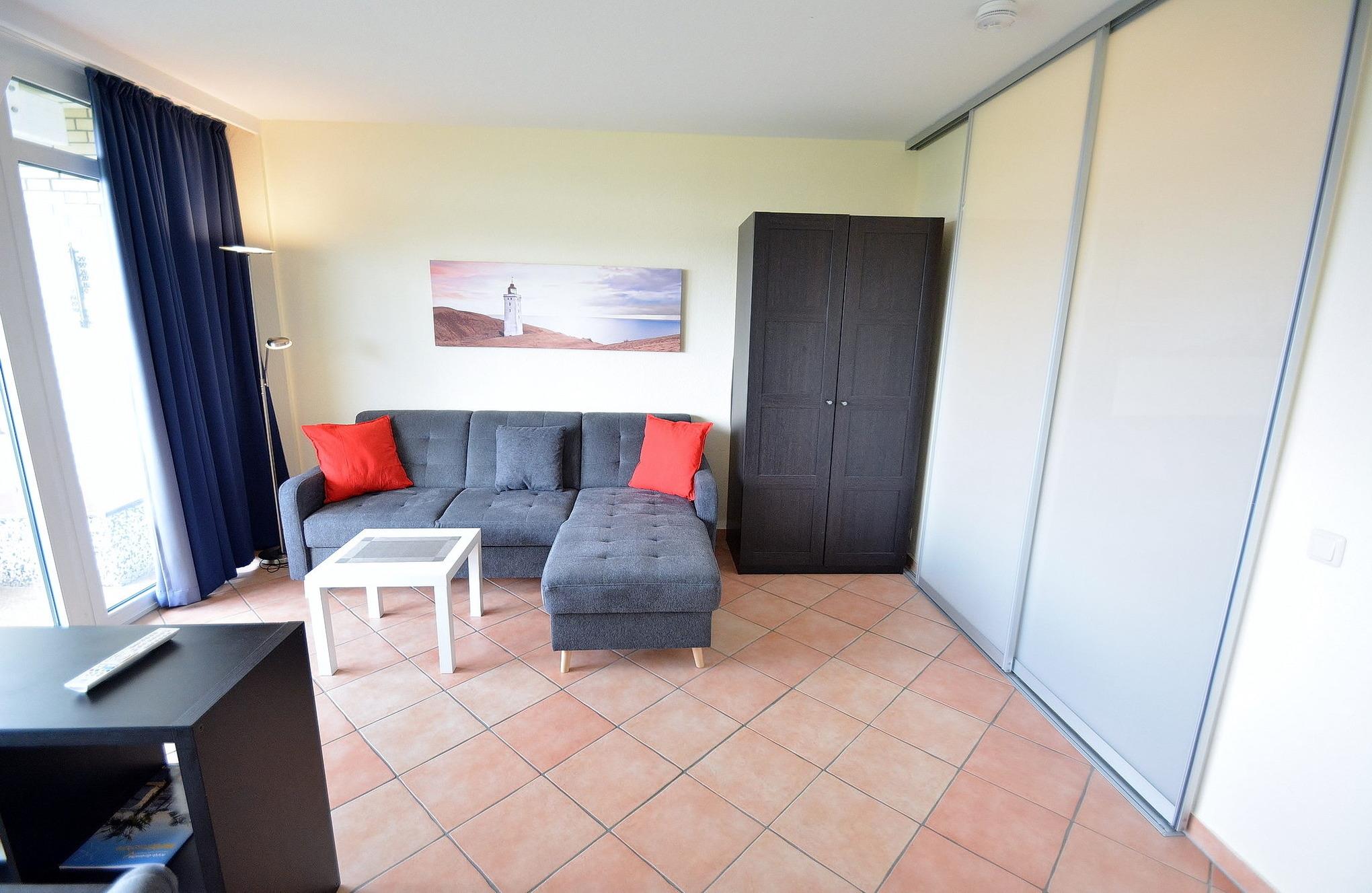 Modernes, offenes Wohn- und Esszimmer mit direktem Zugang zum Balkon. Das Wohn- und Esszimmer ist mit einer Schlafcouch (130x190cm), einem Couchtisch und einem Essplatz für 4 Personen ausgestattet (seit Mai 2025 neue Stühle). Zur Unterhaltung stehen ein Fernseher mit DVD-Player und eine Mini-Stereoanlage mit CD-Player zur Verfügung. Das Wohn- und Esszimmer ist gefliest. Die Fenster lassen sich durch einen Vorhang stark verdunkeln. Kleine separate Nische mit einem Doppelbett (140x200cm) die sich durch Schiebetüren vom Wohn- und Esszimmer abtrennen lässt. Der Schlafbereich ist gefliest, ein Kleiderschrank befindet sich im Wohnzimmer.