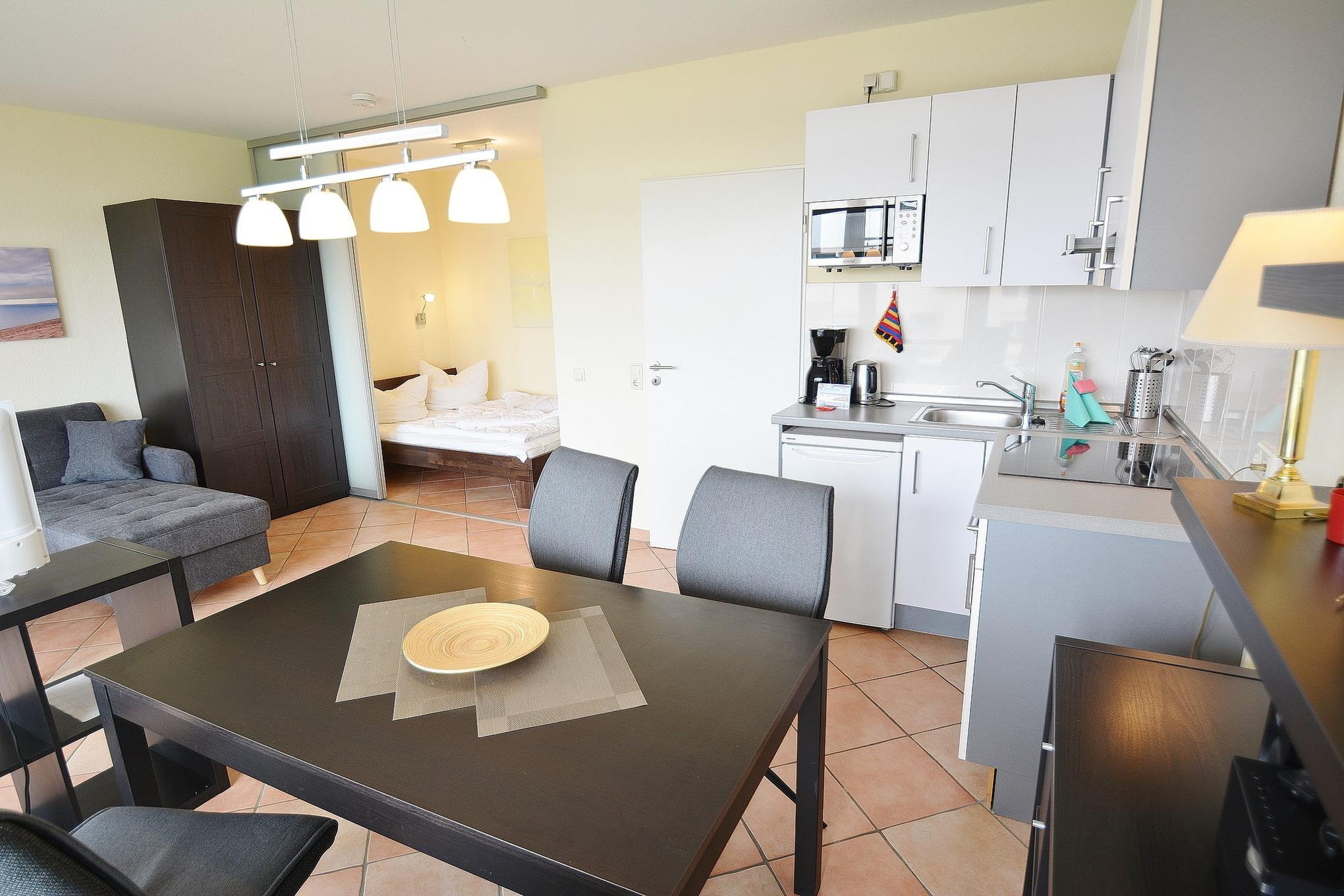 Moderne, zum Wohnzimmer offene, komplett ausgestattete Pantry-Küche mit 4 Plattenherd, Backofen, Kühlschrank mit kleinem 2-Sterne Gefrierfach, Mikrowelle, Kaffeemaschine, Wasserkocher, Toaster und Eierkocher.