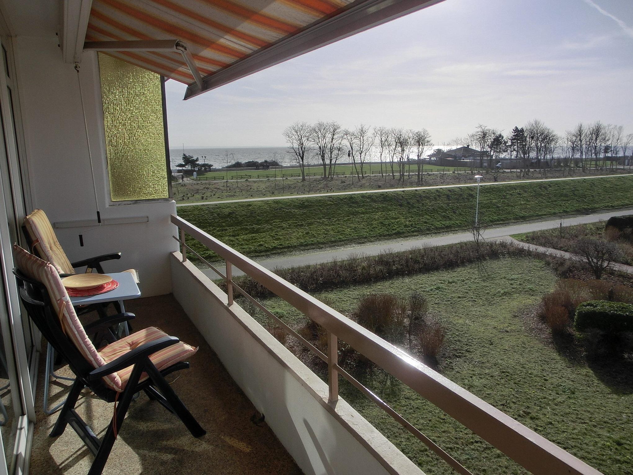 Balkon in westliche Richtung mit Seeblick und Markise. PKW-Stellplatz in unmittelbarer Nähe, Fahrradraum im Keller. Waschmaschine und Trockner im Gebäude gegen Gebühr.