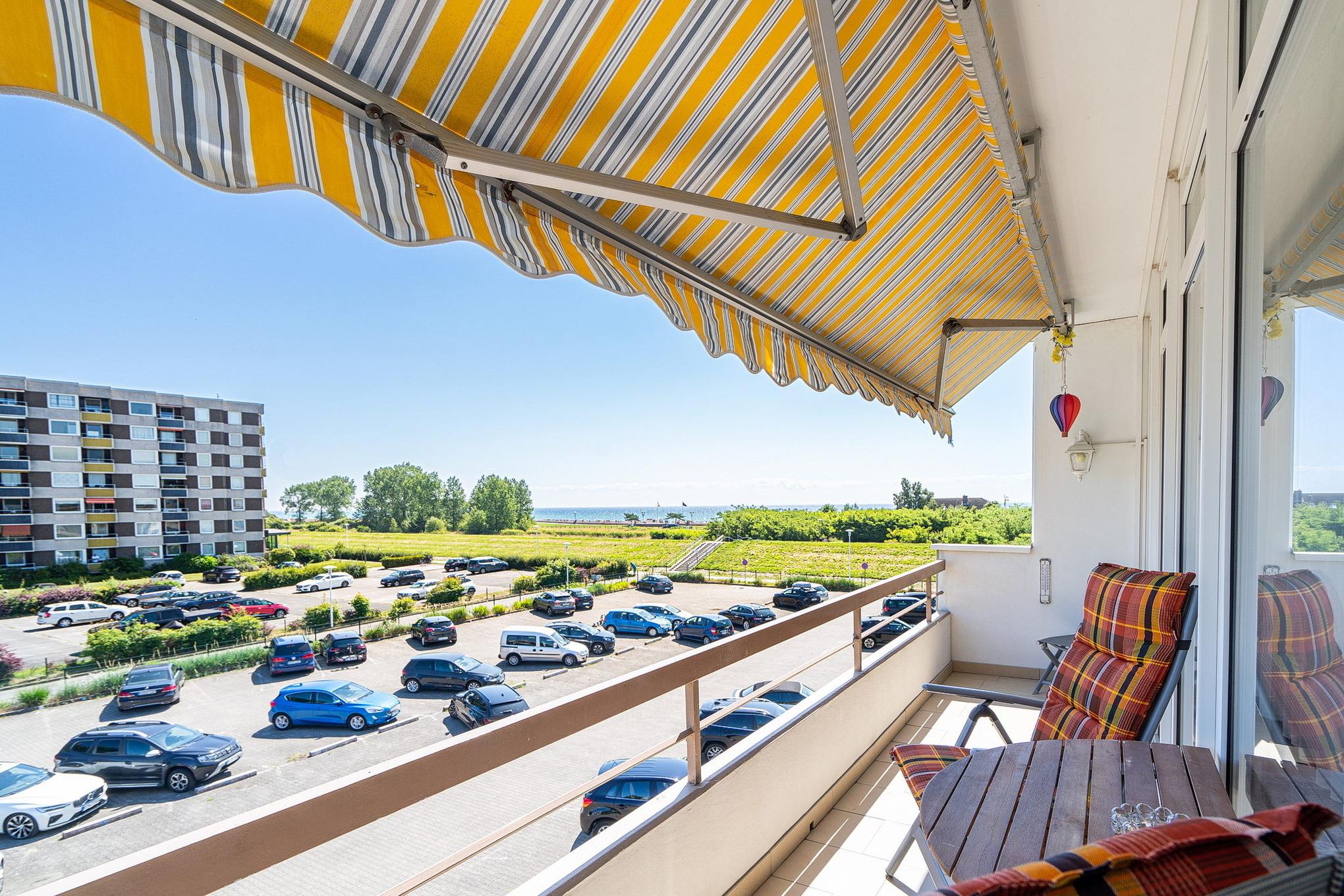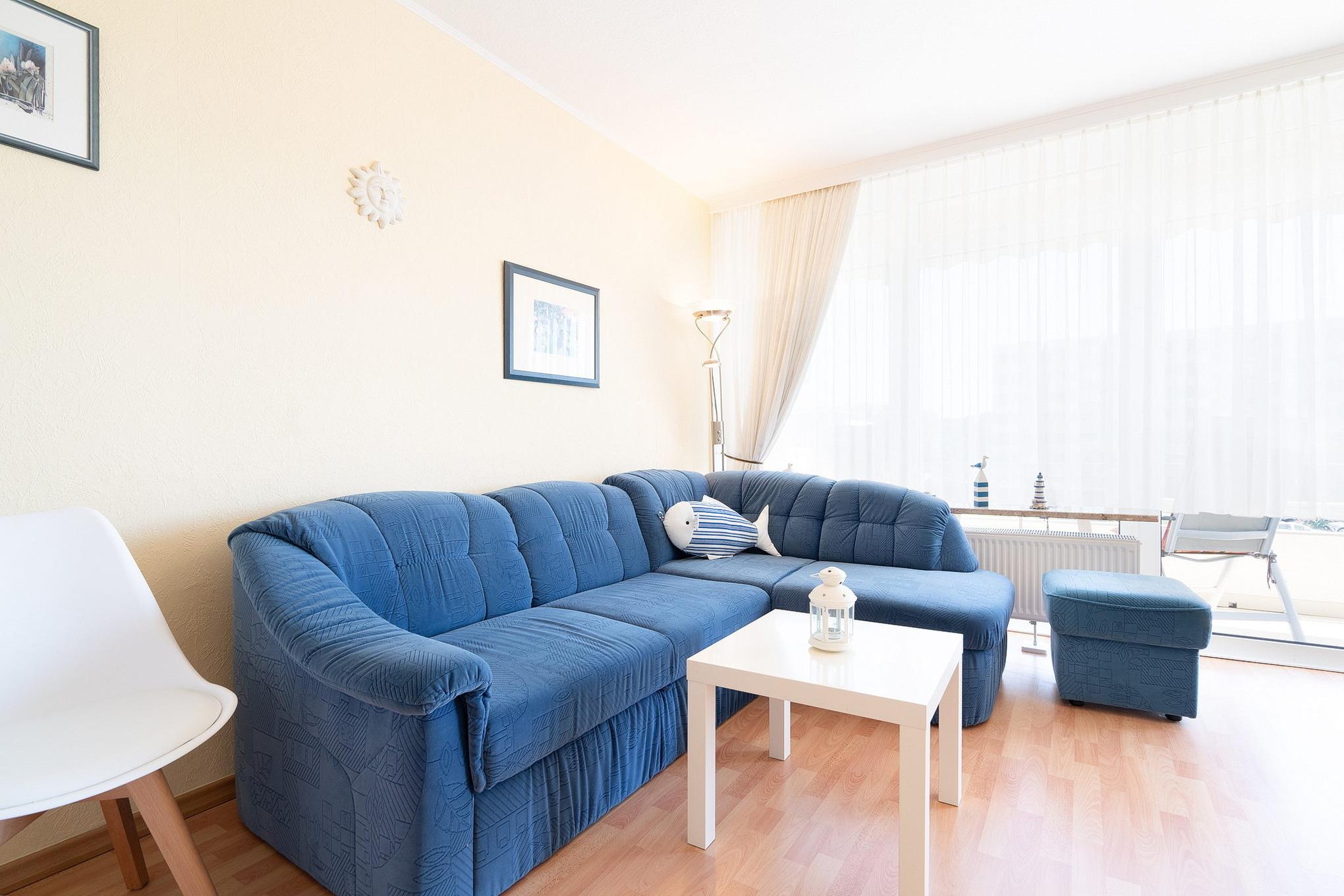 Gemütliches Wohn- und Esszimmer mit direktem Zugang zum sonnigen Balkon mit Blick auf den Deich und seitlichem Seeblick. Das Wohn- und Esszimmer ist mit einem Essplatz für 3 Personen, einem Wohnzimmerschrank, einer Schlafcouch und einem Couchtisch ausgestattet. Des Weiteren stehen ein Fernseher und eine kleine Hifi-Anlage zur Verfügung.