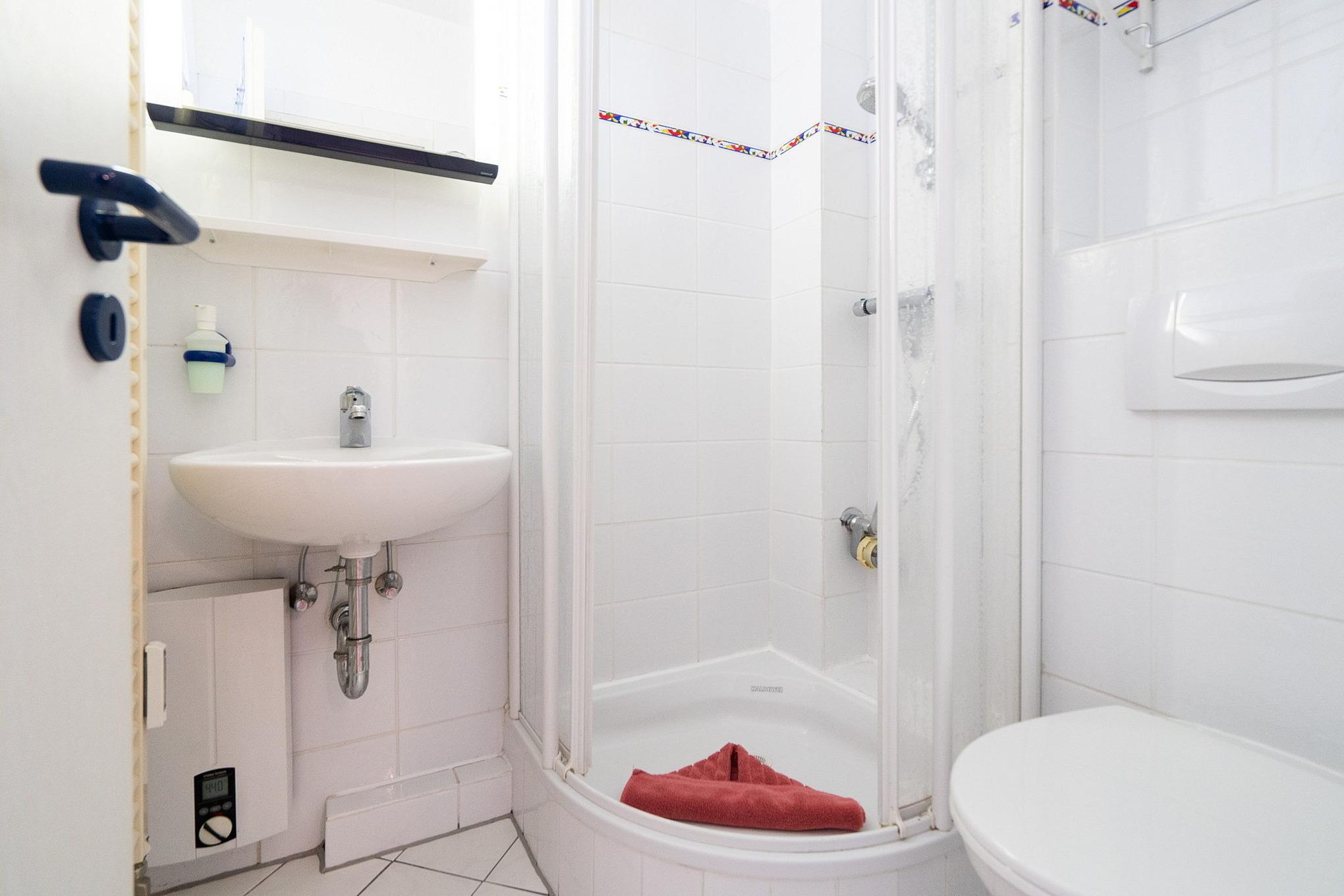 Kleines gefliestes Bad mit Dusche, WC und Waschbecken.