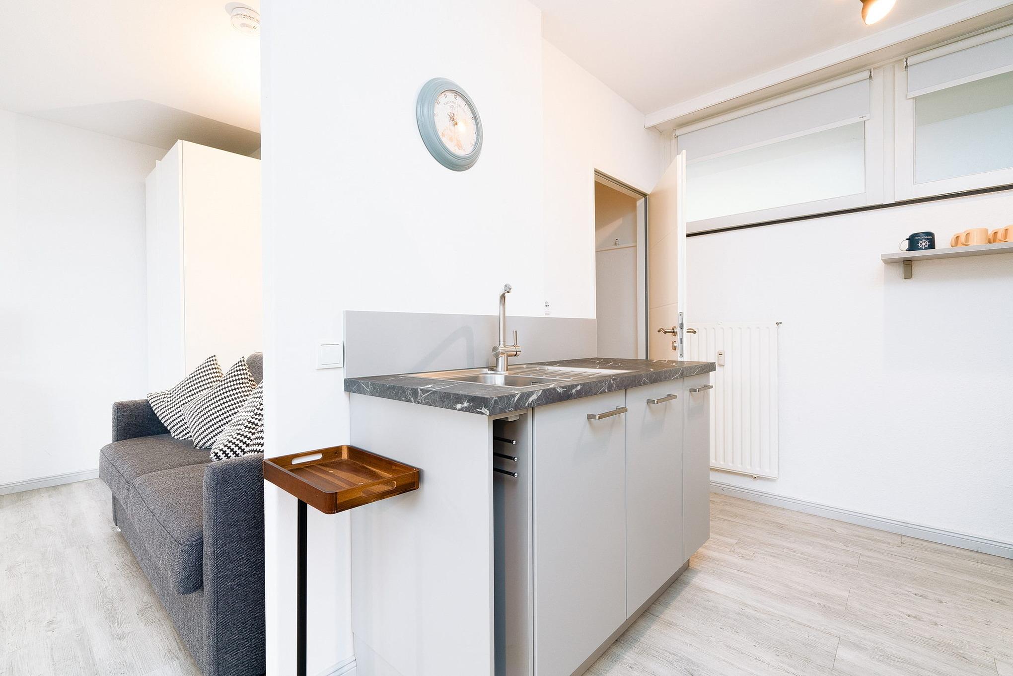 Moderne, komplett eingerichtete, zum Wohnbereich offene Küche. Die Küche ist mit einem Ceran-Kochfeld, einer Spülmaschine, einem Wasserkocher, Toaster, Kaffeemaschine und einem Kühlschrank mit kleinem Gefrierfach ausgestattet.