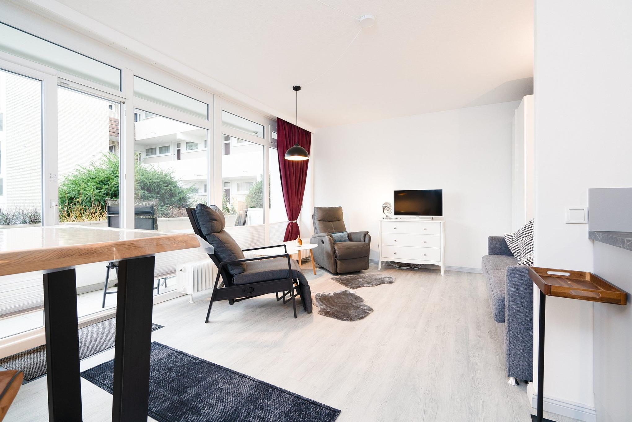 Moderner, freundlicher und heller Wohnbereich mit direktem Zugang zum Balkon. Der Wohnbereich ist mit einem Schlafsofa (150mx200m), 2 Sesseln, einem Couchtisch, einem Essbereich für 2 Personen und einem Kleiderschrank ausgestattet. Zur Unterhaltung steht ein Flachbildschirm zur Verfügung. Die Fenster können verdunkelt werden.