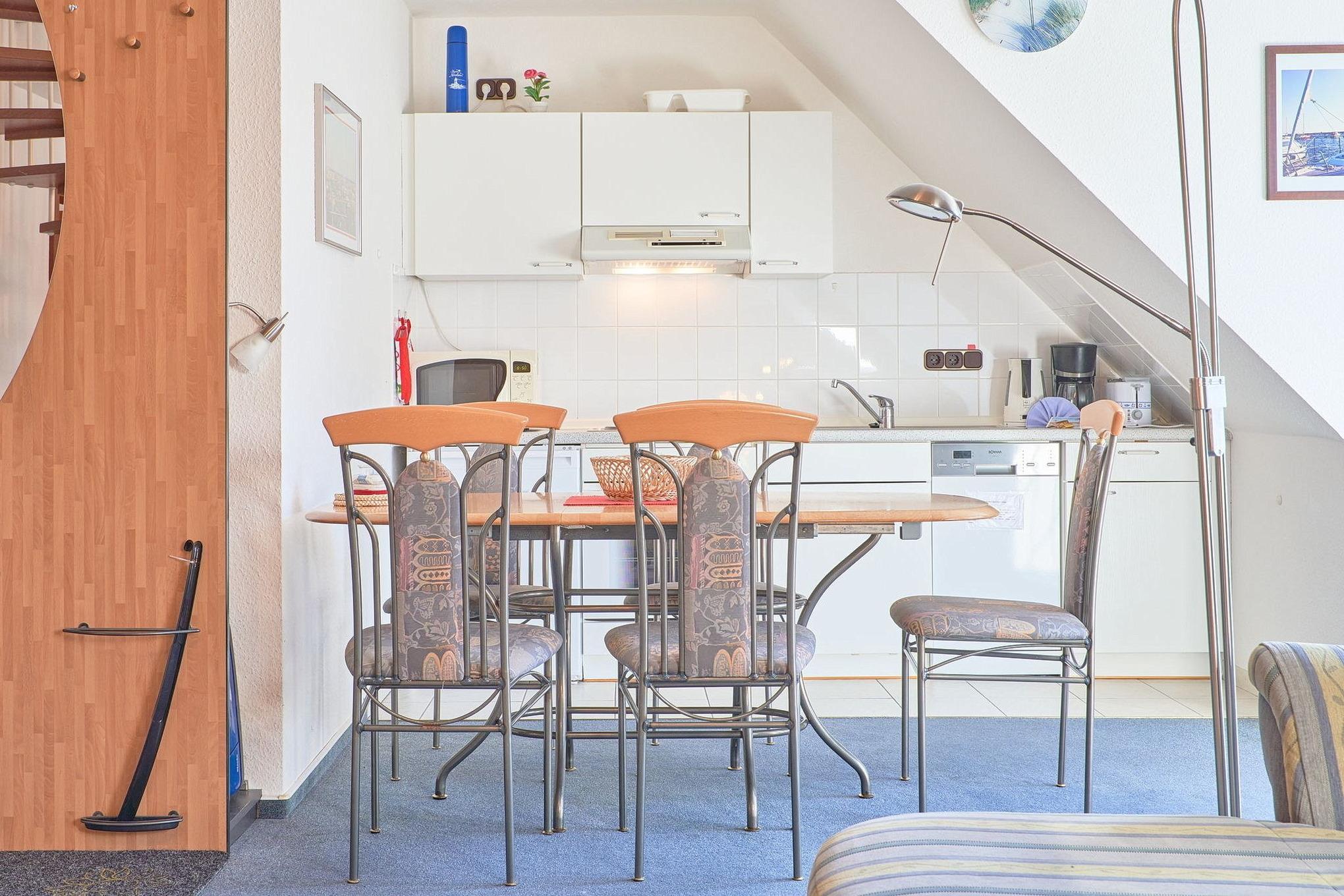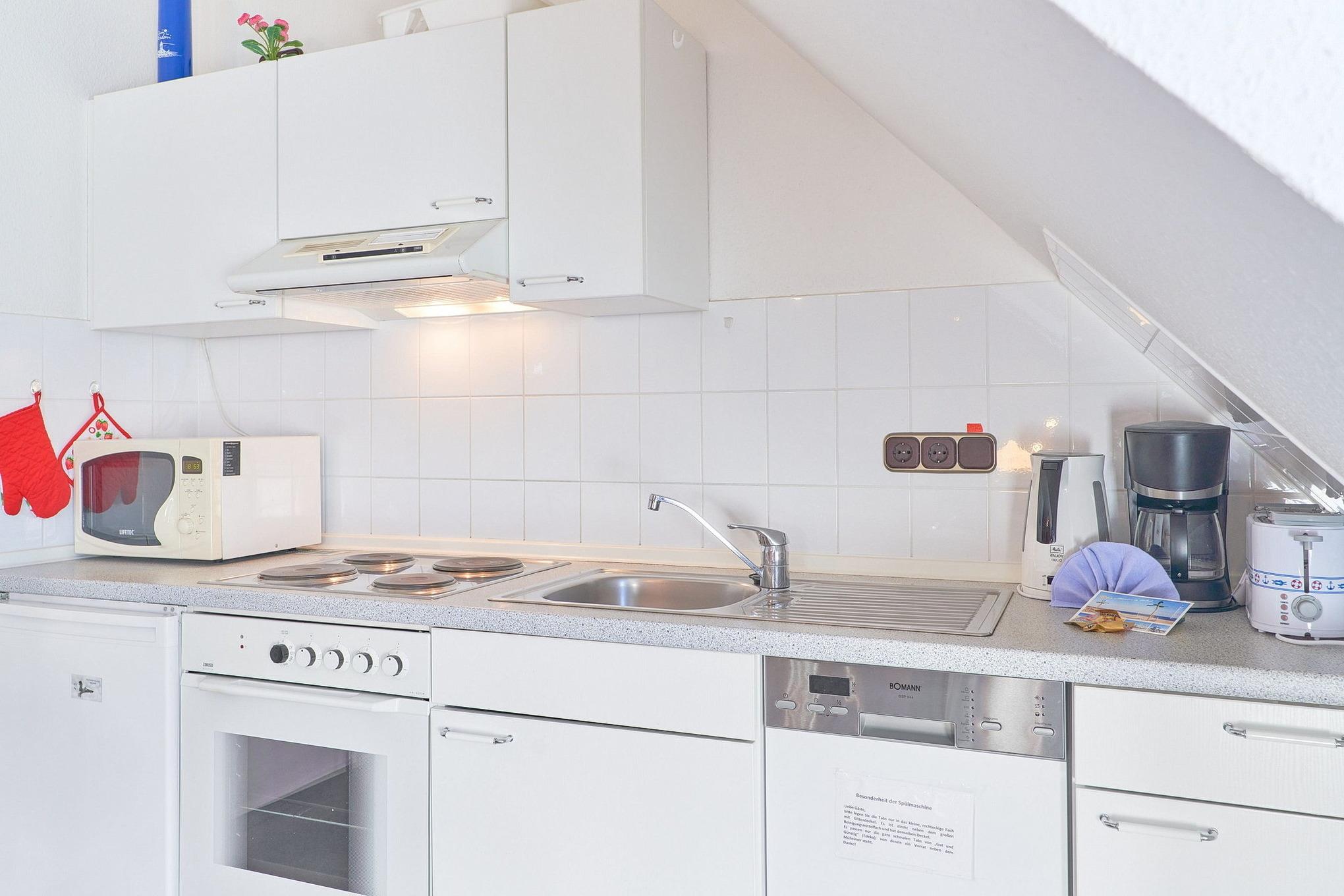 Komplett eingerichtete, zum Wohn- und Esszimmer offene Küche. Die Küche verfügt über einen 4-Platten E-Herd, einen Backofen, eine Mikrowelle, eine Spülmaschine, einen Kühlschrank mit kleinem 3-Sterne Gefrierfach, eine Kaffeemaschine, einen Wasserkocher, einen Toaster und einen Eierkocher.