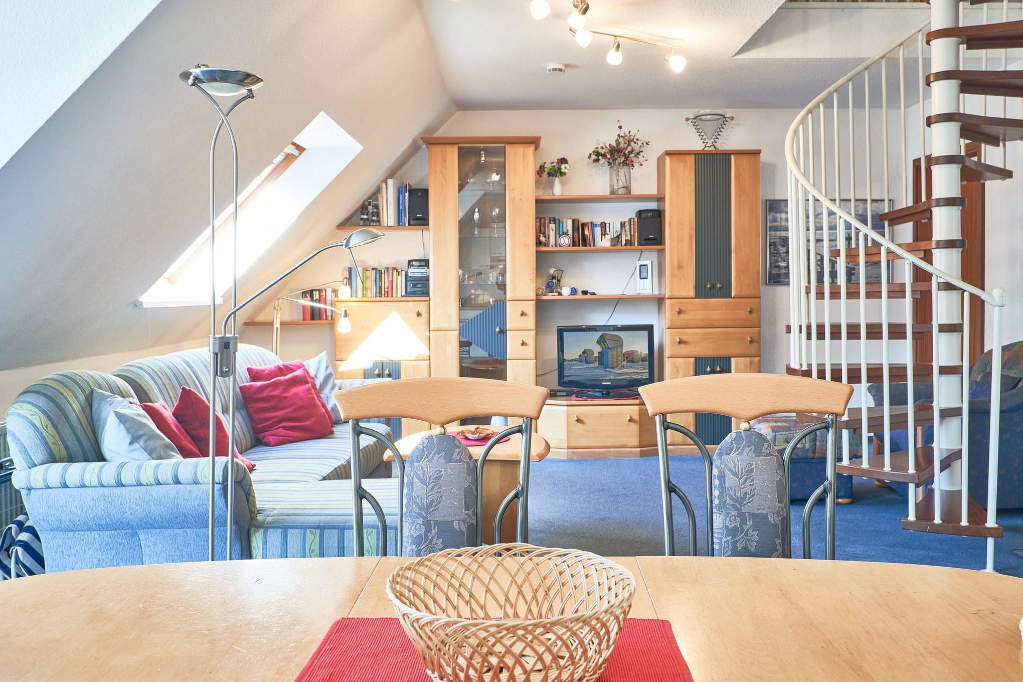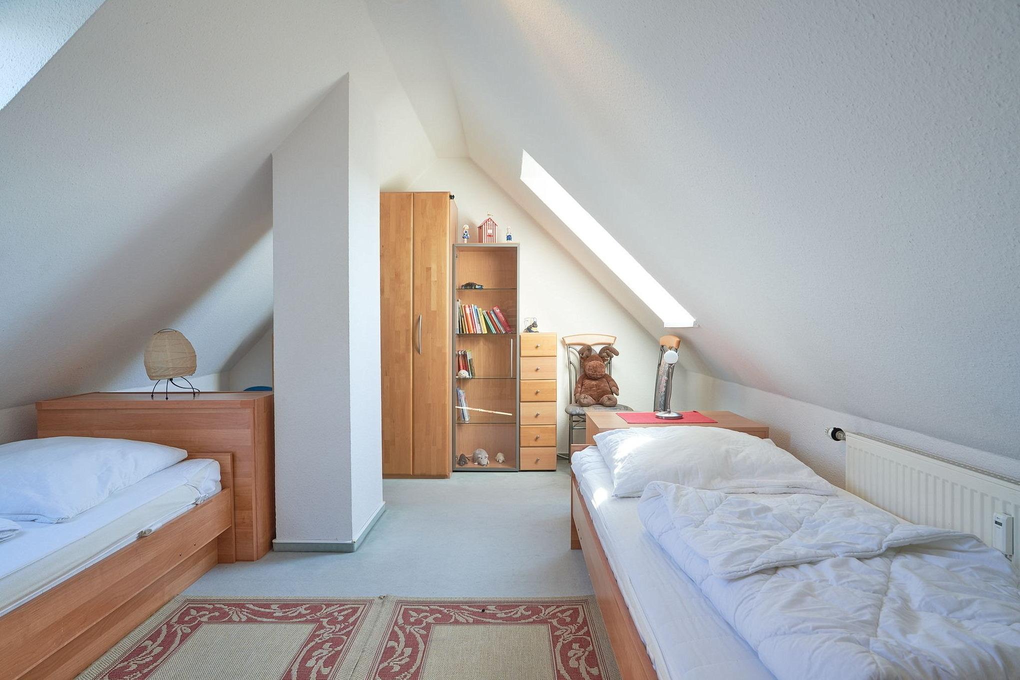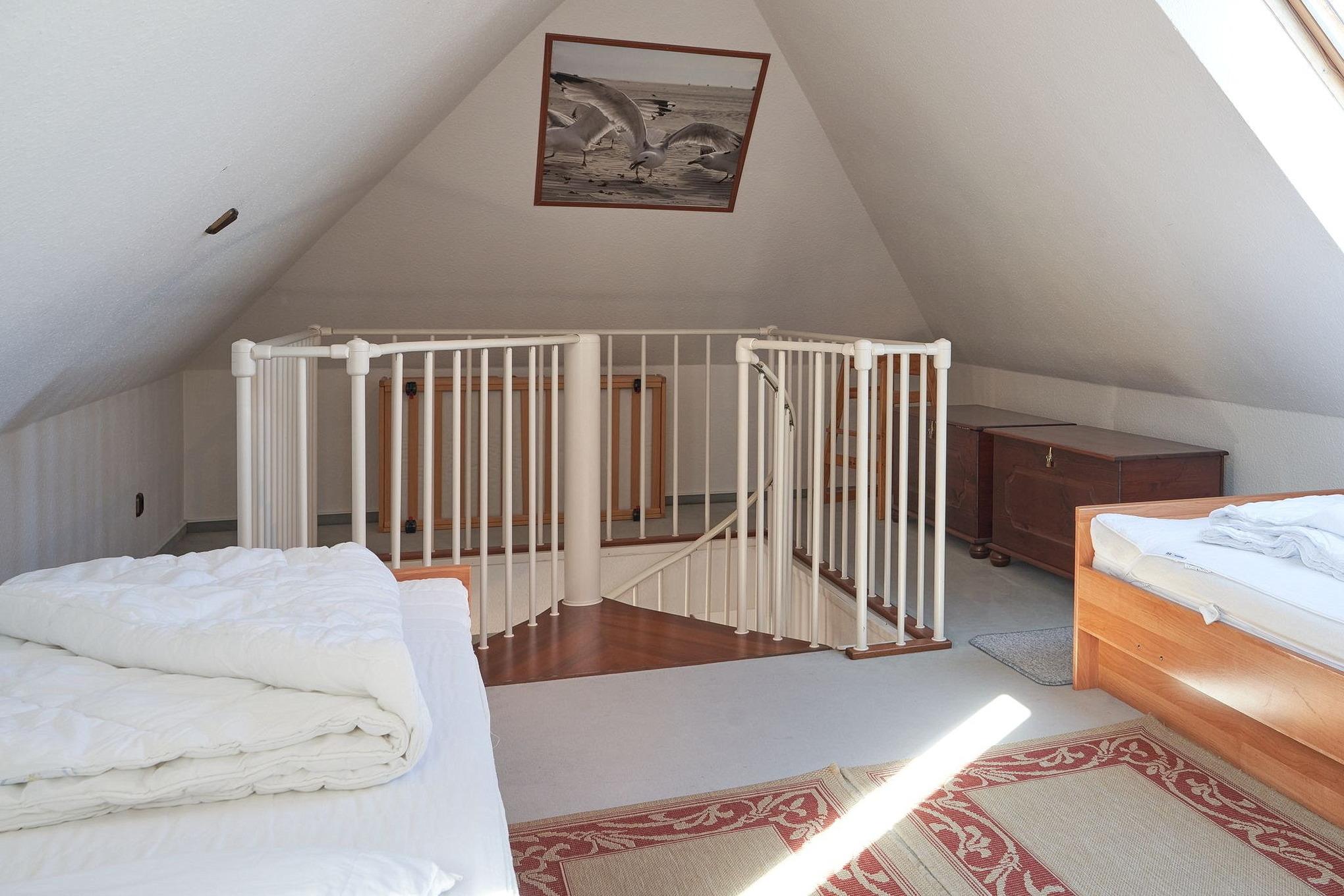 Der Schlafbereich im Spitzboden der 3. Etage ist über eine Wendeltreppe erreichbar. Der Schlafbereich ist mit 2 Einzelbetten (90x200cm), einem 1-türigen Kleiderschrank und zwei Kommoden ausgestattet. Der Schlafbereich ist mit Teppichboden ausgelegt; die Dachfenster lassen sich durch Innenrollos etwas verdunkeln.