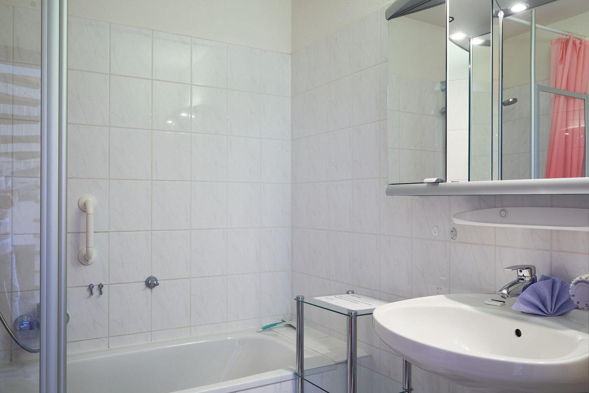 Hell gefliestes Bad mit Badewanne (mit Duschmöglichkeit), Waschbecken, WC, Haartrockner und großem Spiegelschrank.