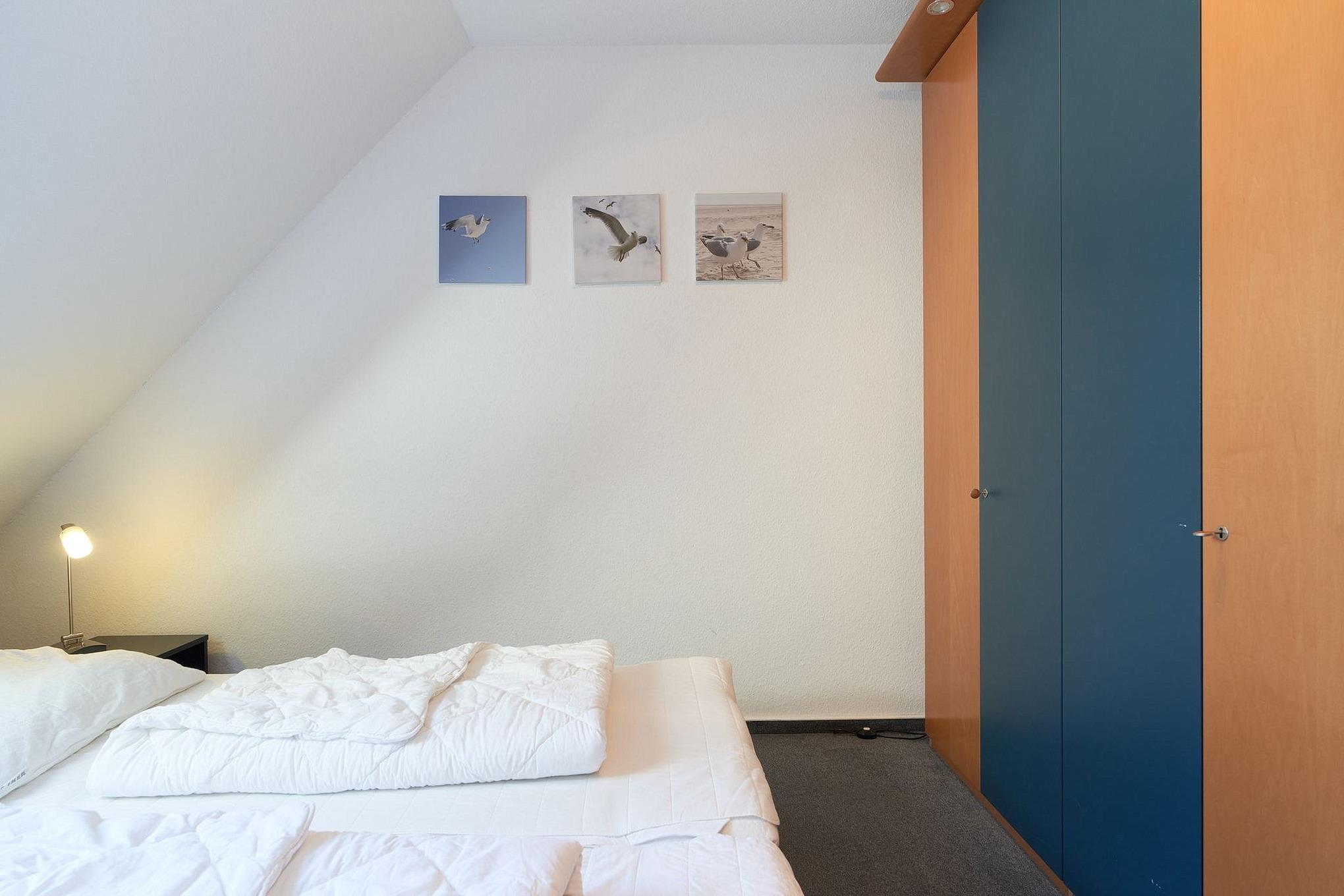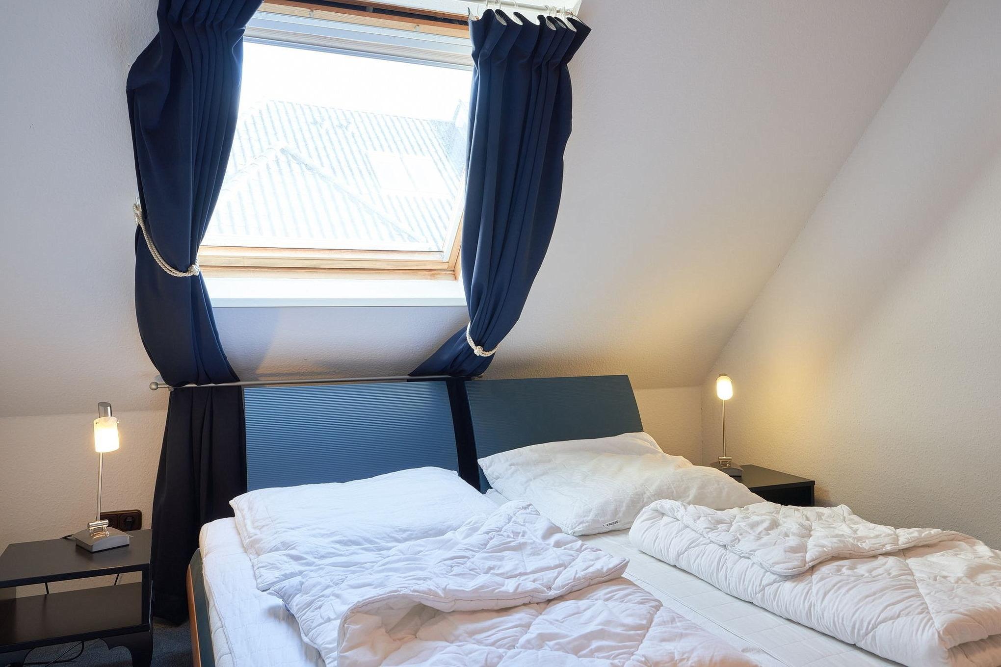 Das modern eingerichtete, separate Schlafzimmer im 2.OG ist mit einem Doppelbett (2x 90x200cm), 2 Nachttischen mit Leselicht und einem 4-türigen Kleiderschrank ausgestattet. Das Schlafzimmer ist mit Teppichboden ausgelegt. Das Dachfenster lässt sich durch einen Vorhang verdunkeln.