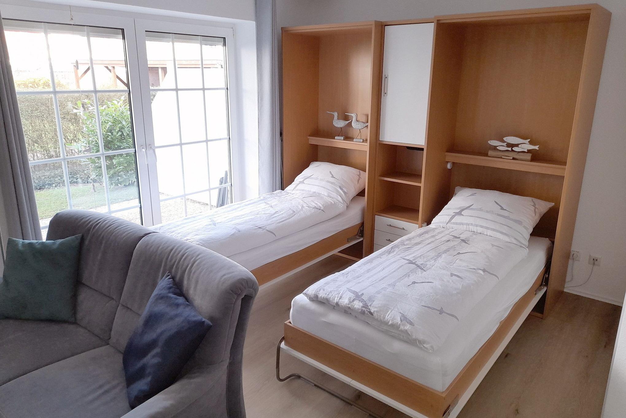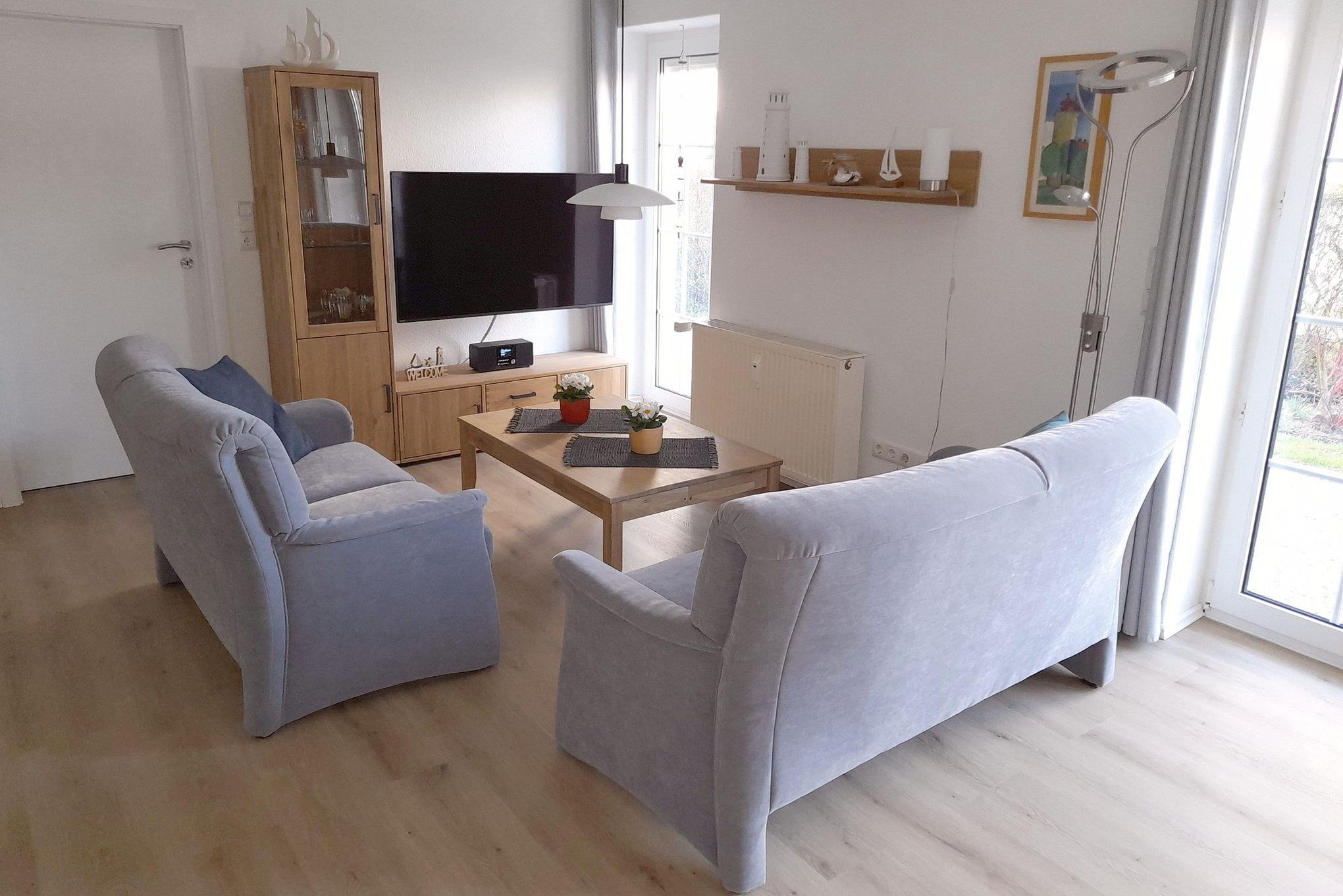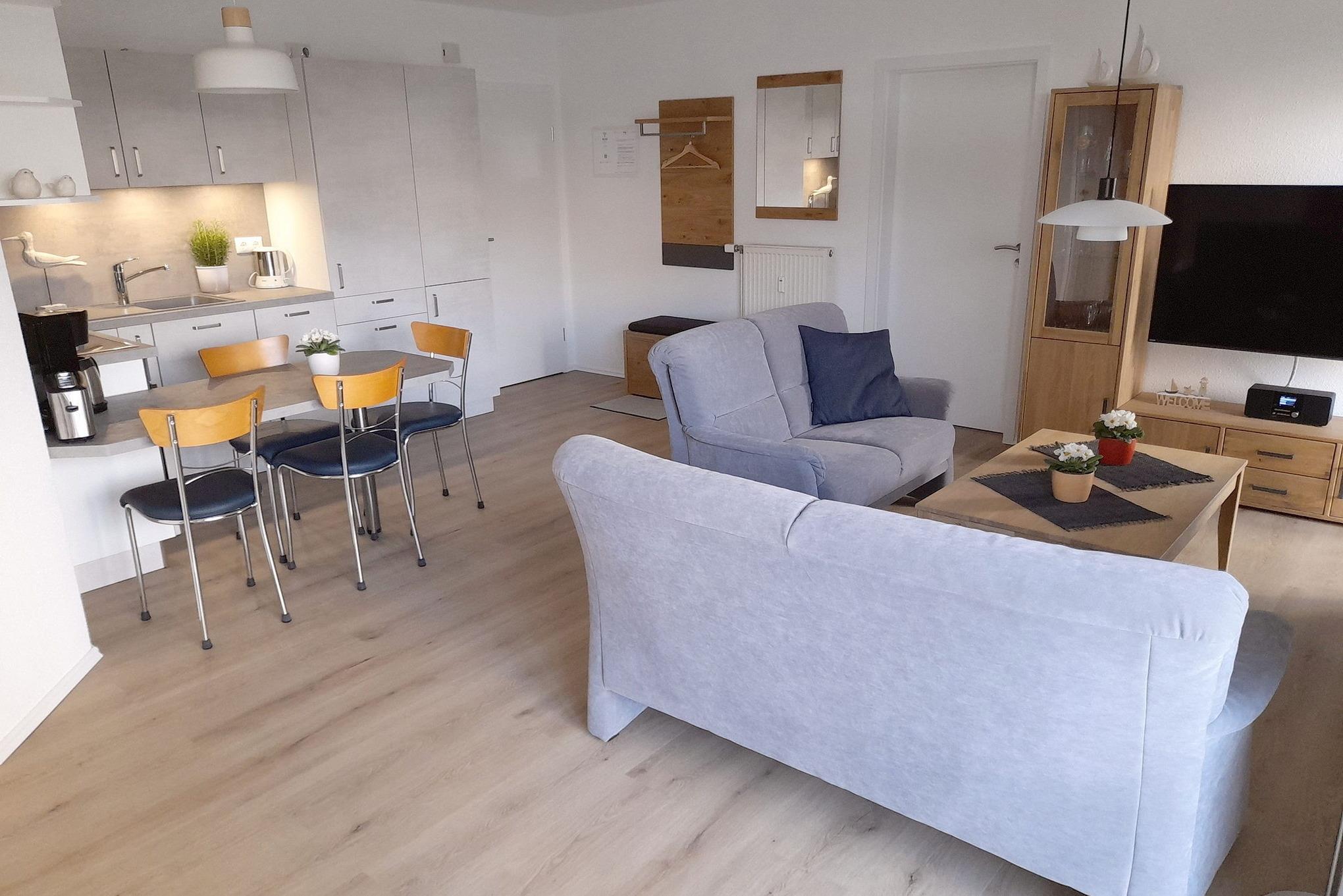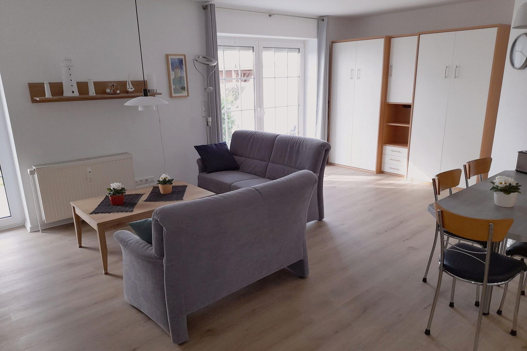 Freundliches, modernes, großzügiges Wohn- und Esszimmer mit offener Küche. Das Wohn- und Esszimmer ist mit 2 Sofas und einem Couchtisch, einem Esstisch mit 4 Stühlen und 2 Schrankbetten (je 90x200 cm)[nbsp] ausgestattet. Im Wohnzimmerbereich befindet sich ein TV-Flachbildschirm und ein Internetradio. Das Wohn-/Esszimmer ist mit Vinyl-Parkettboden ausgelegt. Vom Wohn-/Esszimmer gelangen Sie auf die große Terrasse mit kleinem Garten.