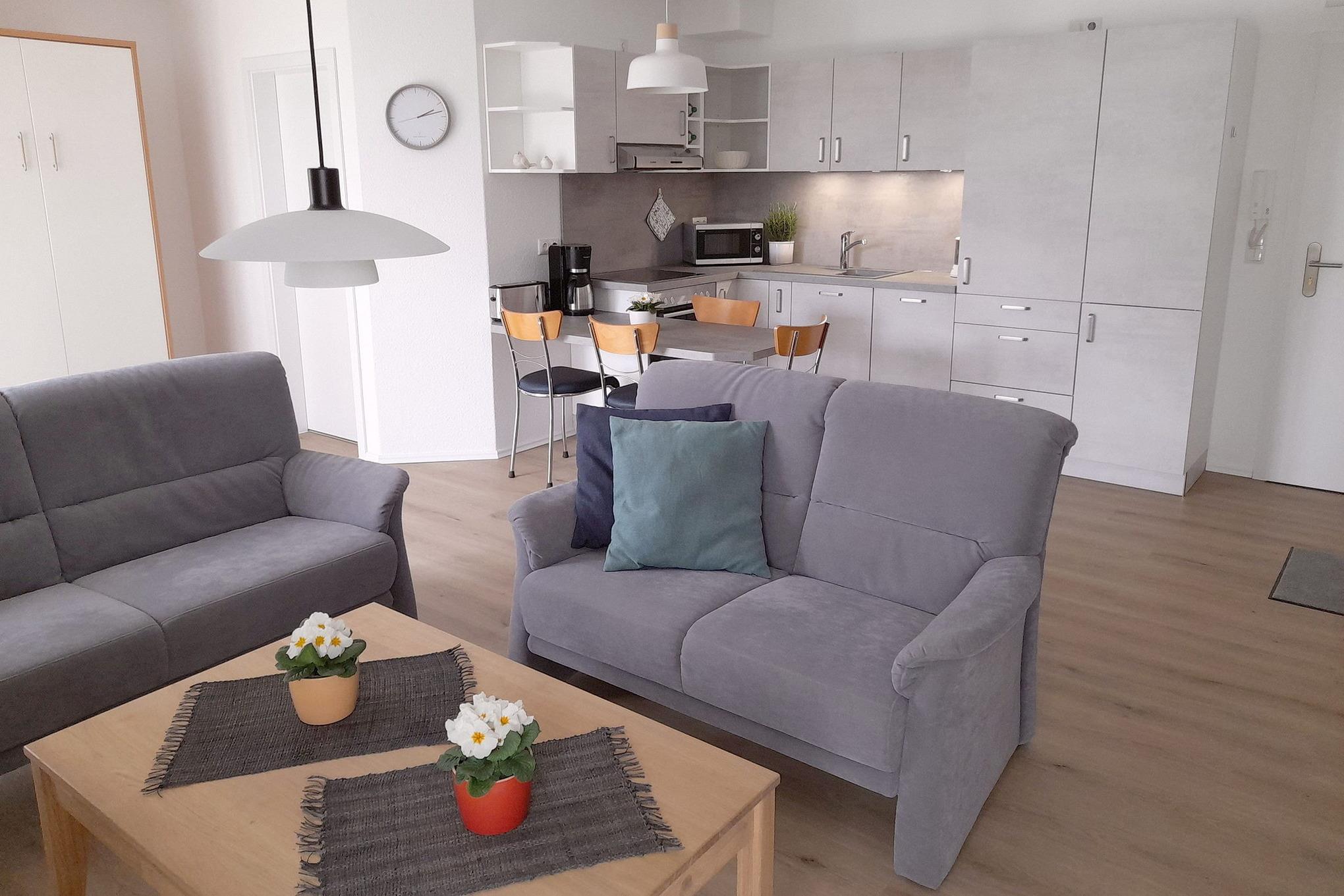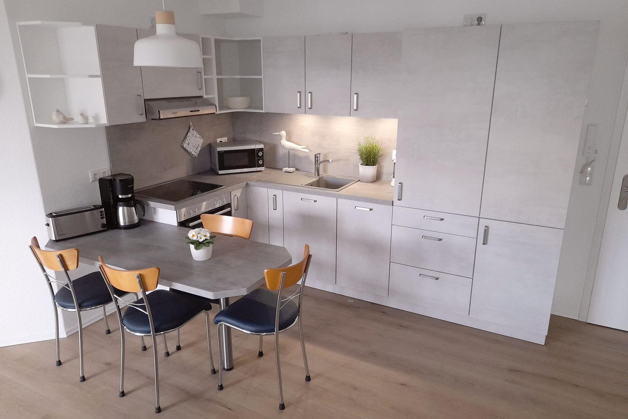 Moderne, zum Wohnzimmer offene, komplett ausgestattete Küche mit Cerankochfeld, Backofen, Spülmaschine, Kühlschrank mit kleinem Gefrierfach, Mikrowelle, Toaster, Wasserkocher, Eierkocher, Kaffeemaschine.