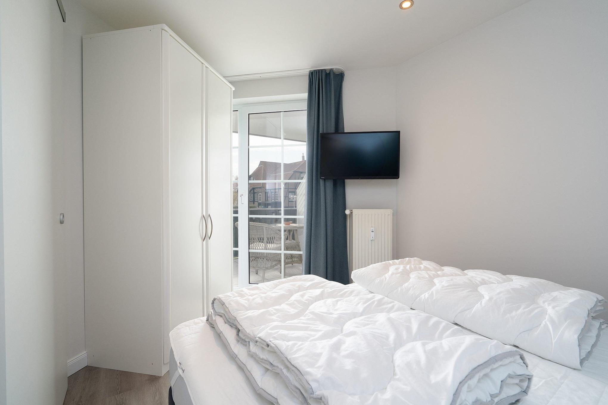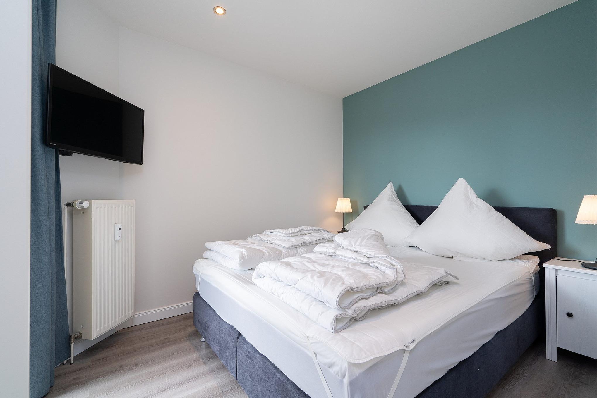Modernes Schlafzimmer mit einem Doppelbett (160x200cm) einem Kleiderschrank und zusätzlichem Flachbildfernseher. Die Fenster lassen sich durch ein Plissee und Vorhänge verdunkeln, der Boden ist mit Laminat ausgelegt.