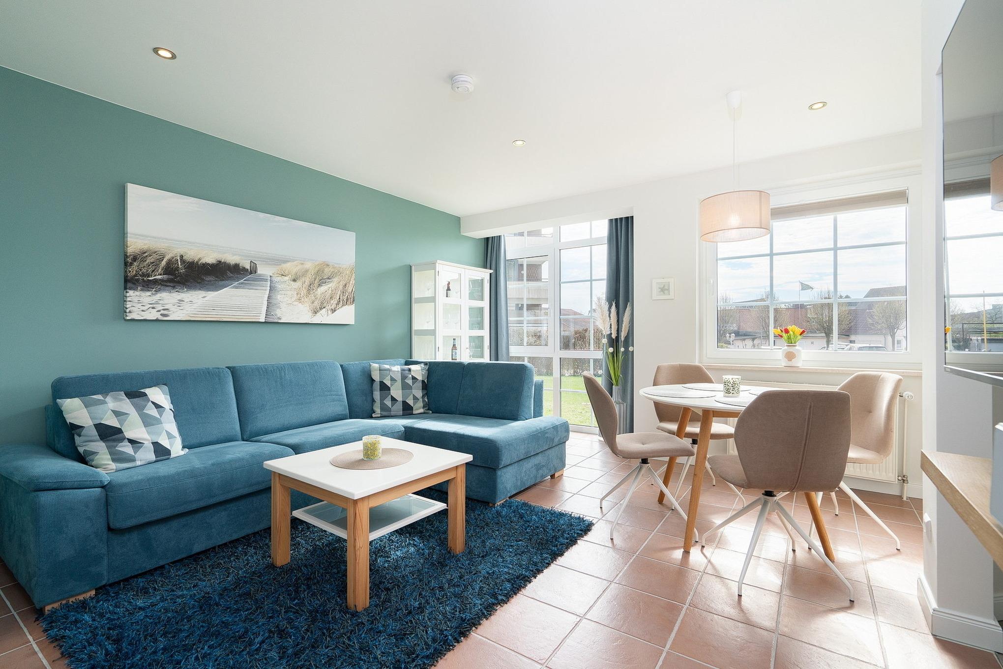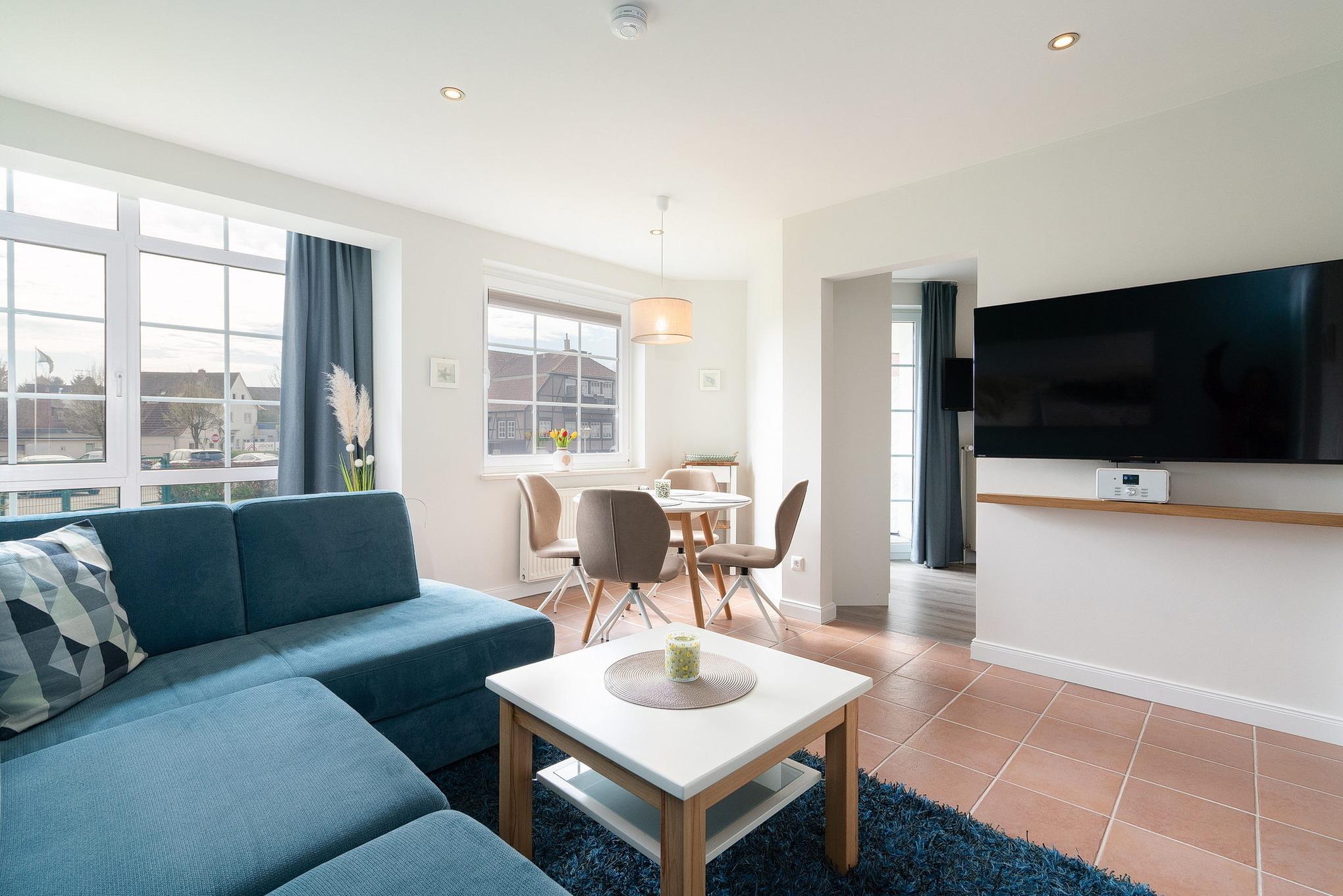 Lichtdurchfluteter freundlicher Wohn-Essbereich. Das Wohnzimmer ist mit einer gemütlichen Schlafcouch ausgestattet, diese lässt sich mit wenigen Handgriffen zu einer vollwertigen Schlafmöglichkeit ausklappen. Die Liegefläche hat 140x200cm und verfügt über einen Lattenrost sowie eine vollwertige Matratze. Der Esstisch bietet Platz für 4 Personen. Zur Unterhaltung steht ein Flachbildfernseher. Der Raum lässt sich durch Plissee und Vorhänge verdunkeln. Der Boden ist mit Fliesen ausgelegt.