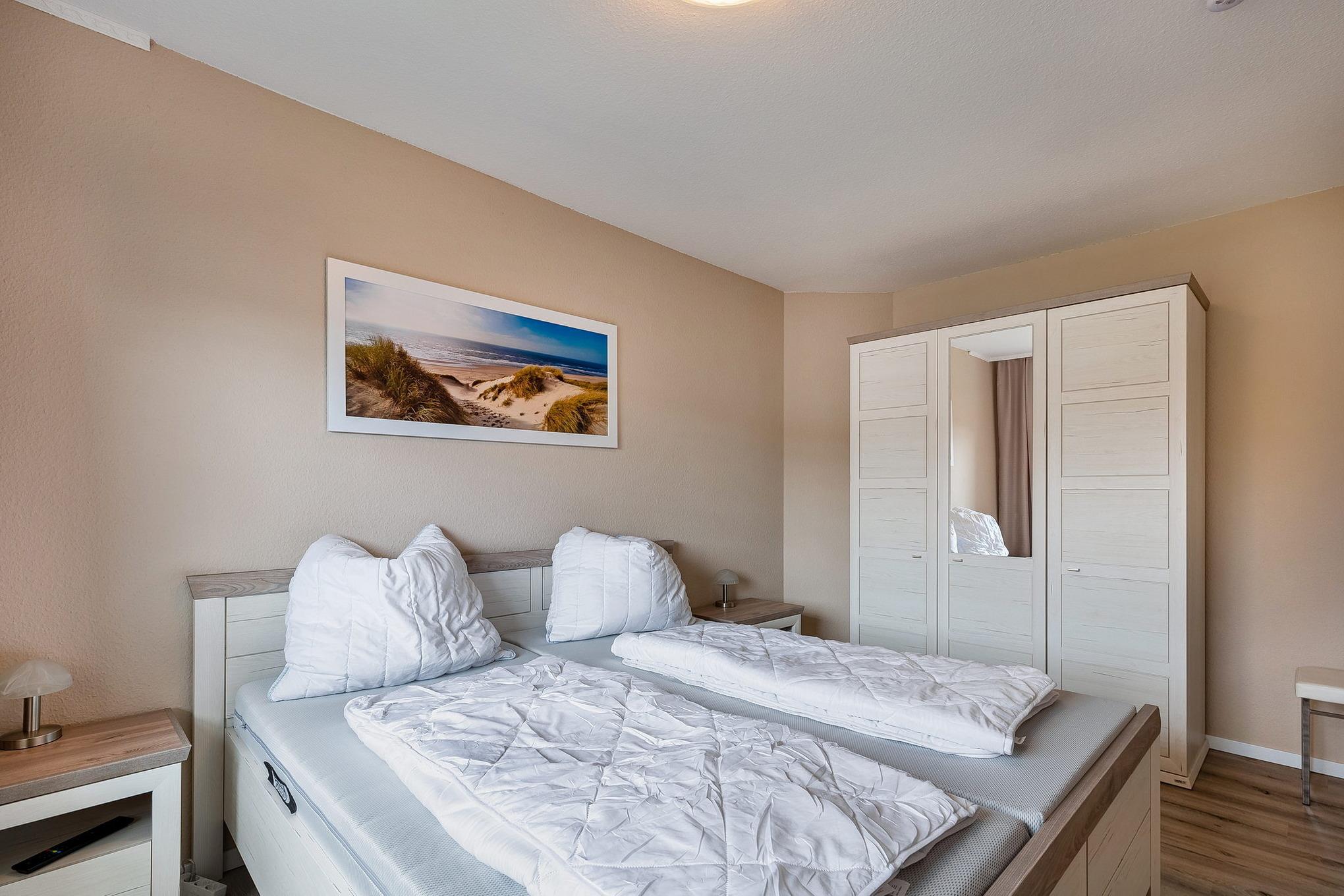 Modernes Schlafzimmer mit einem Doppelbett (2x90x200cm) einem 3-türigen Kleiderschrank und zusätzlichem Flachbildfernseher. Die Fenster lassen sich durch ein Plissee und Vorhänge verdunkeln, der Boden ist mit Laminat ausgelegt.