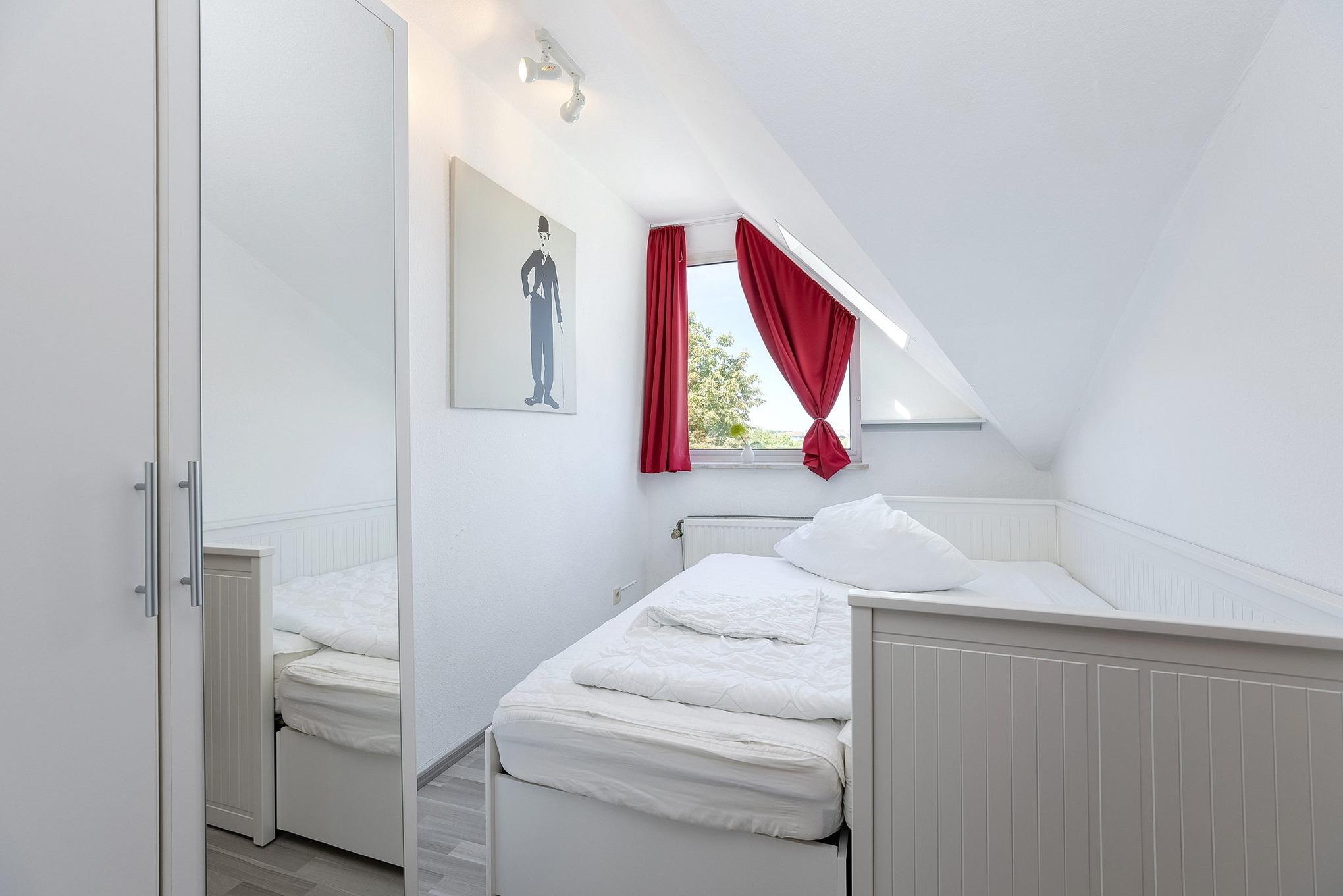 Das moderne, freundliche Schlafzimmer ist mit einem Doppelbett (180 x 200 cm), einem großen Kleiderschrank mit Spiegel ausgestattet. Das Schlafzimmer ist mit Laminatboden ausgelegt. Das Fenster lässt sich durch Blickdichte Gardinen verdunkeln.