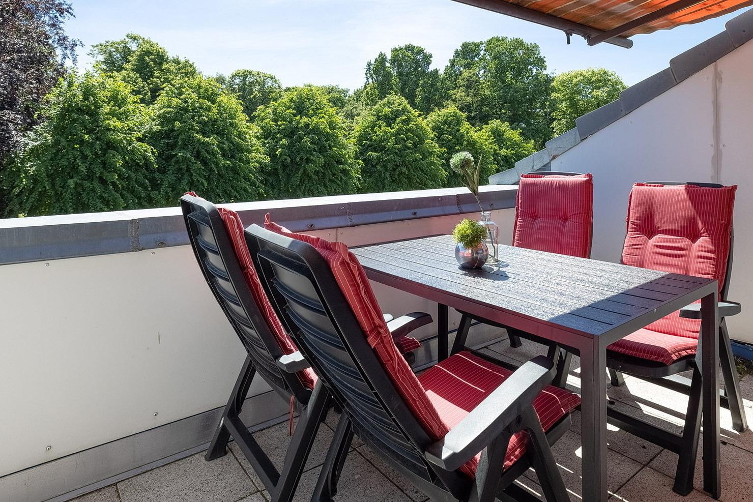 Balkon in südliche Richtung mit Markise, PKW-Abstellplatz in einer Gemeinschaftsgarage (Breite: 2,85 m[nbsp] Höhe 2,16 m). Reisekinderbett und Hochstuhl stehen Ihnen kostenlos zur Verfügung. Fahrradkeller ist über 12 Stufen zu erreichen.