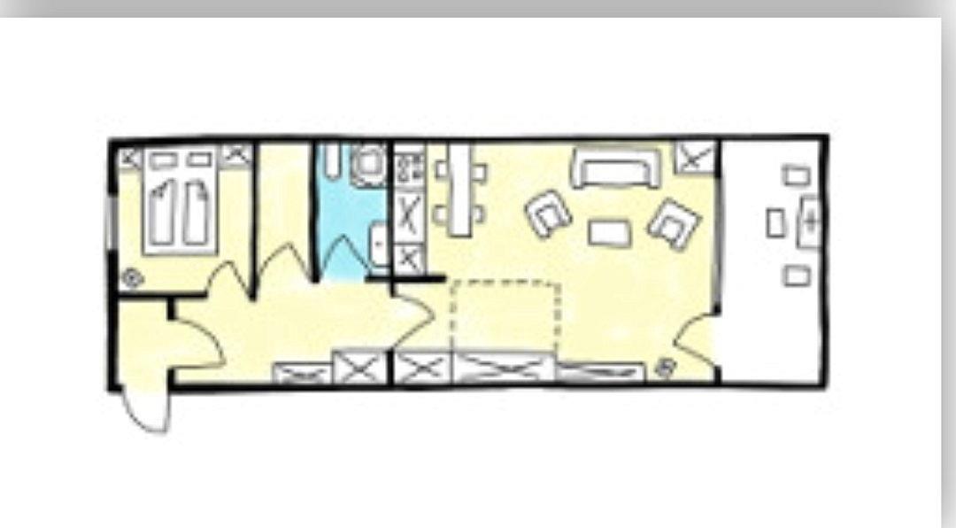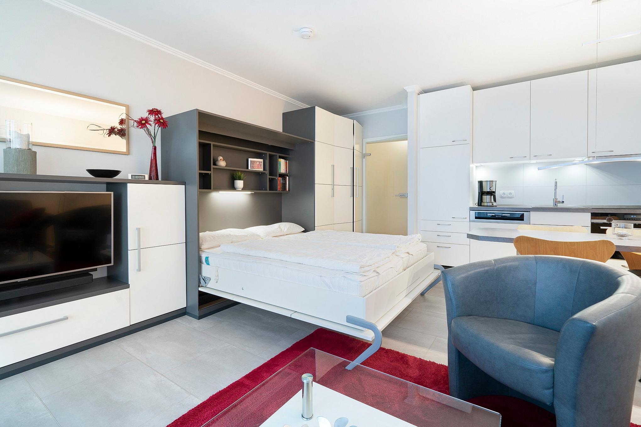 Das helle freundliche Wohnzimmer mit direktem Zugang zum Balkon ist ausgestattet mit einem 2er Sofa, einem Sessel, einem Schrankbett (2x 60x190cm) sowie einem Essplatz für 4 Personen. Zur Unterhaltung steht ein Flachbildfernseher und Radio zur Verfügung. Der Raum ist hell gefliest, das Fenster lässt sich durch einen Vorhang etwas verdunkeln.