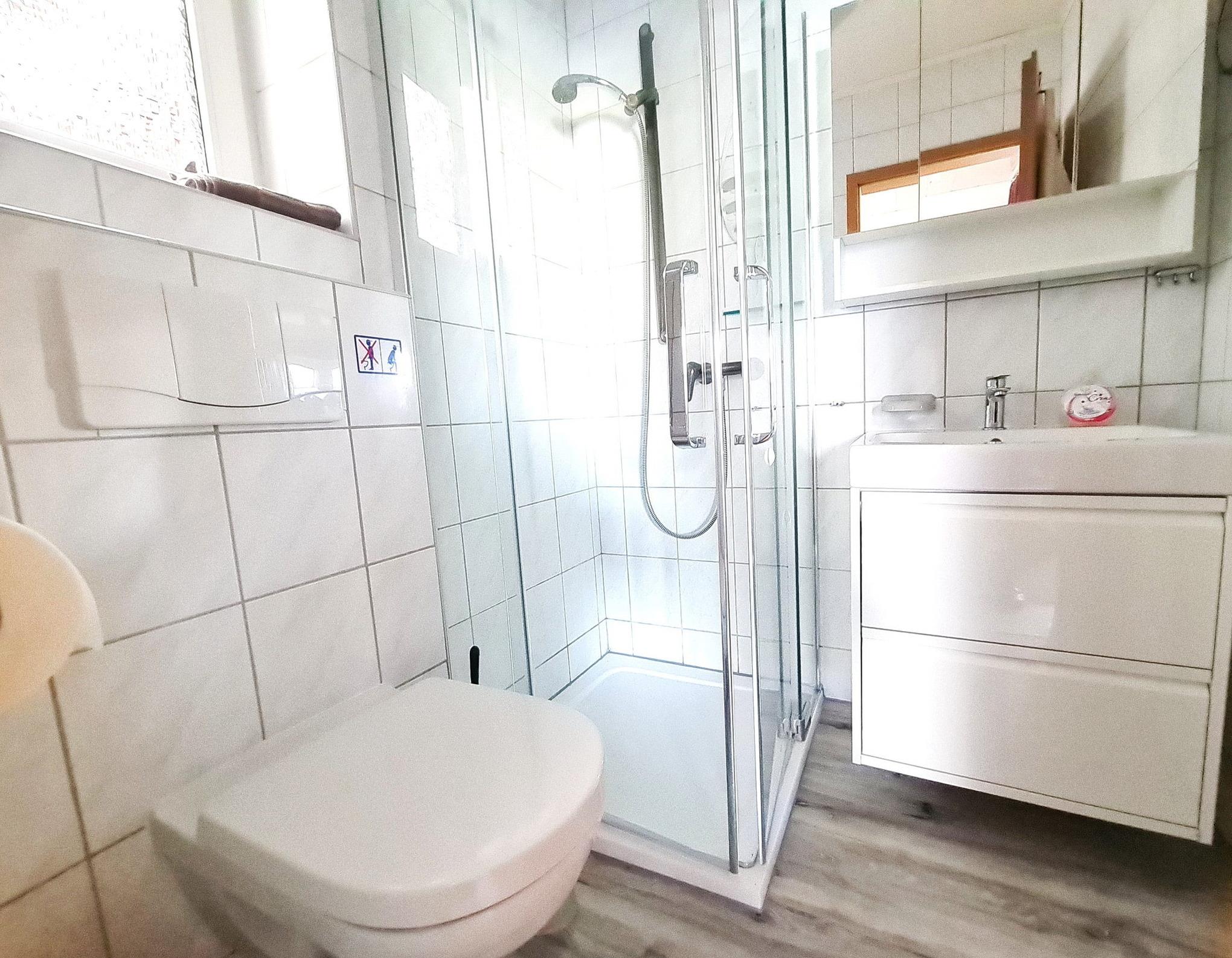 Modernes Tageslichtbad mit WC, Waschbecken und Dusche.