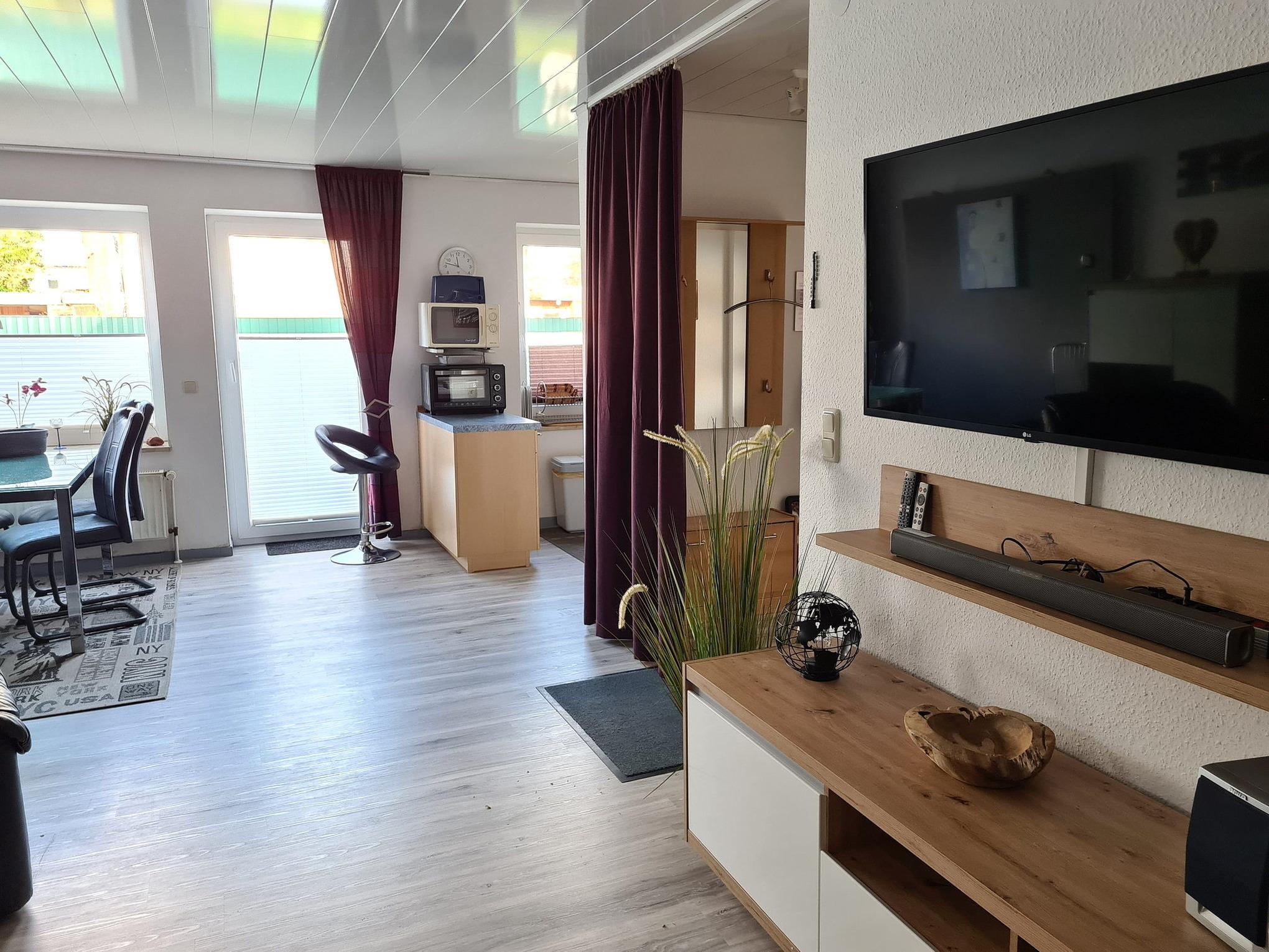 Helles modern eingerichtetes Wohnzimmer mit Vinylboden ausgelegt. Ausgestattet mit einer Schlafcouch, einem Telefon, ein Radio sowie mit Sat-TV.