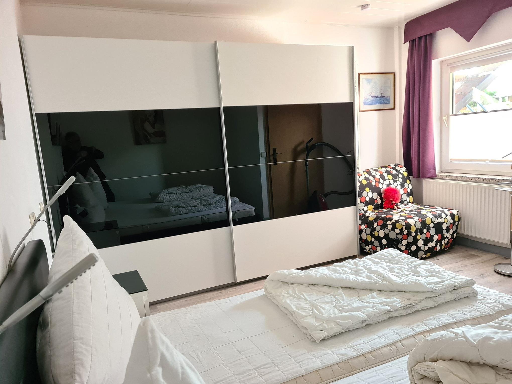 Großes Schlafzimmer mit Doppelbett und großem Kleiderschrank. Der Raum ist mit Vinylboden ausgelegt.