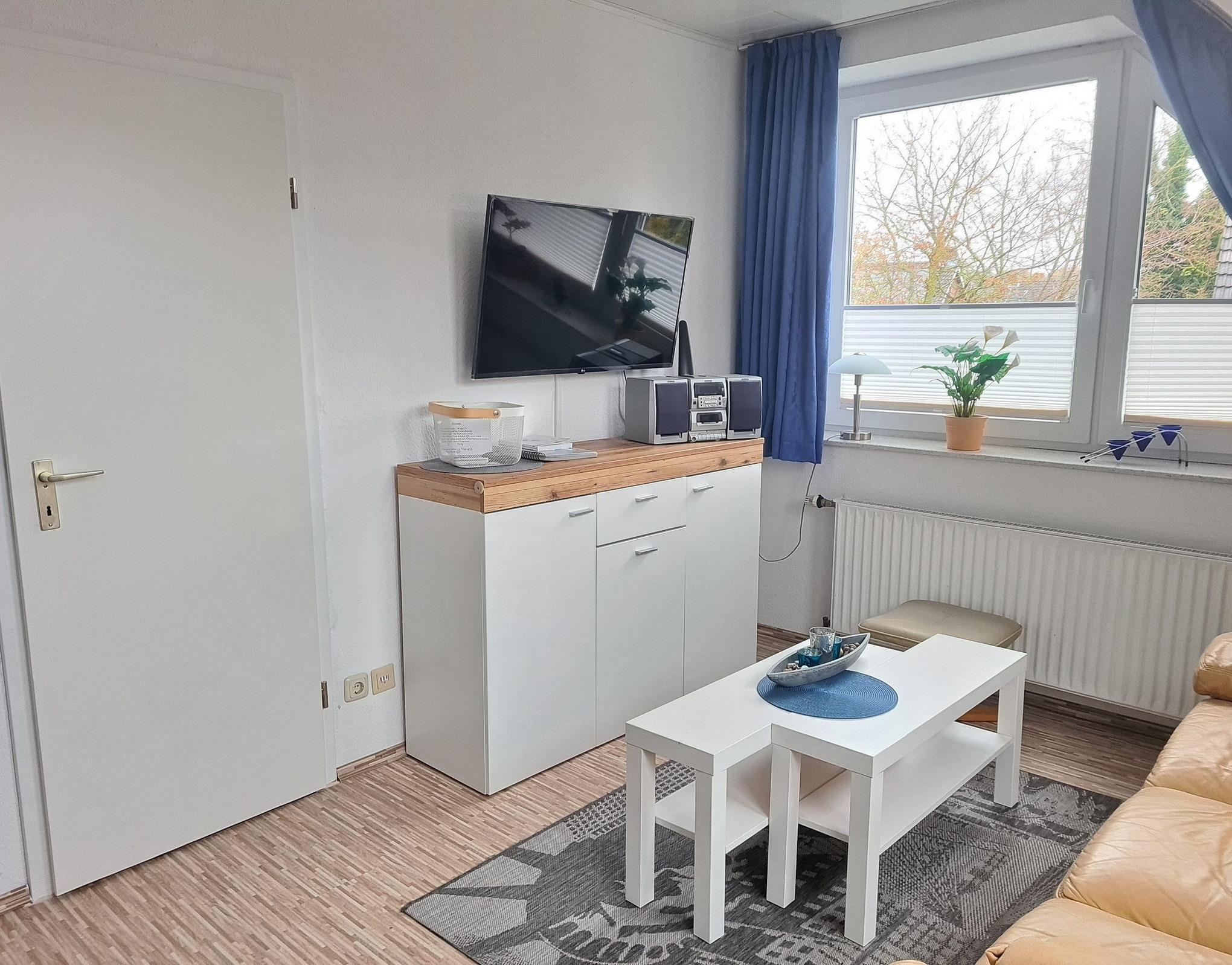 Helles modern eingerichtetes Wohnzimmer mit Ledercouch, Couchtisch, Laminatboden, Telefon. Zur Unterhaltung gibt es ein Radio, Sat-TV und eine kleine Stereoanlage. Weiterhin ist ein Essplatz mit Kommode vorhanden.