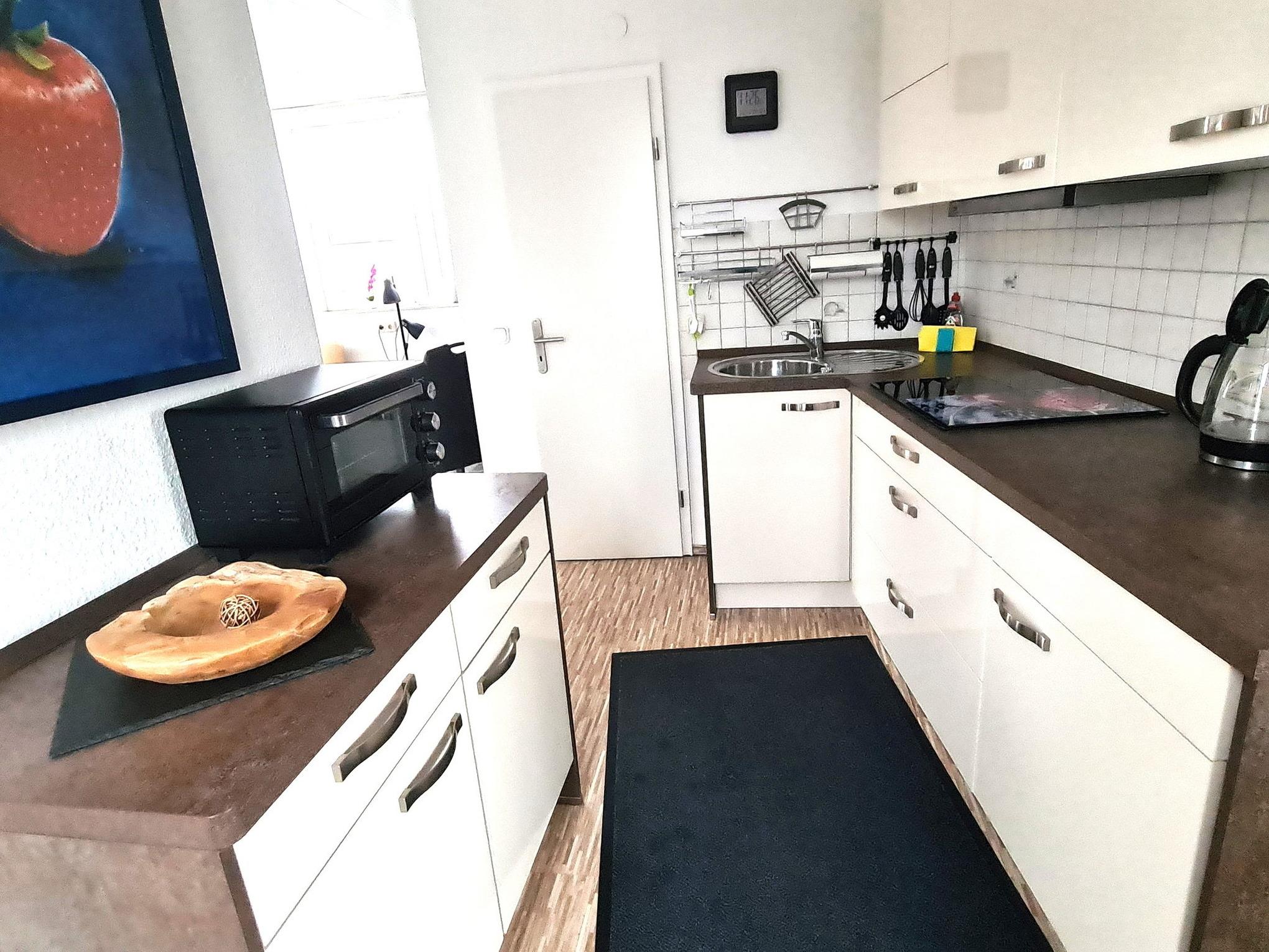 Moderne, komplett eingerichtete Küchenzeile mit E-Herd, Backofen, Kühlschrank, Tiefkühlfach, Mikrowelle, Wasserkocher, Kaffeemaschine und Toaster.