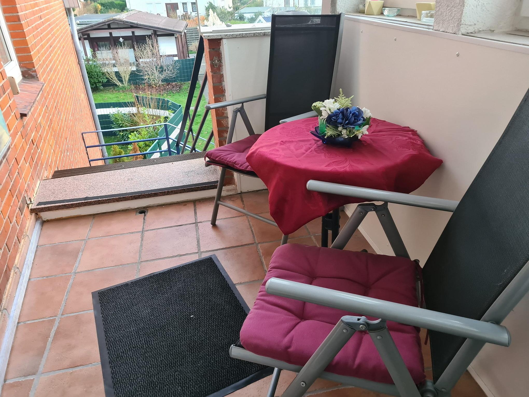 Kleine überdachte Loggia, W-Lan Anschluss. Kleines separates Abstellzimmer mit Fenster. Über eine breite Treppe gelangen Sie in den großen Garten.